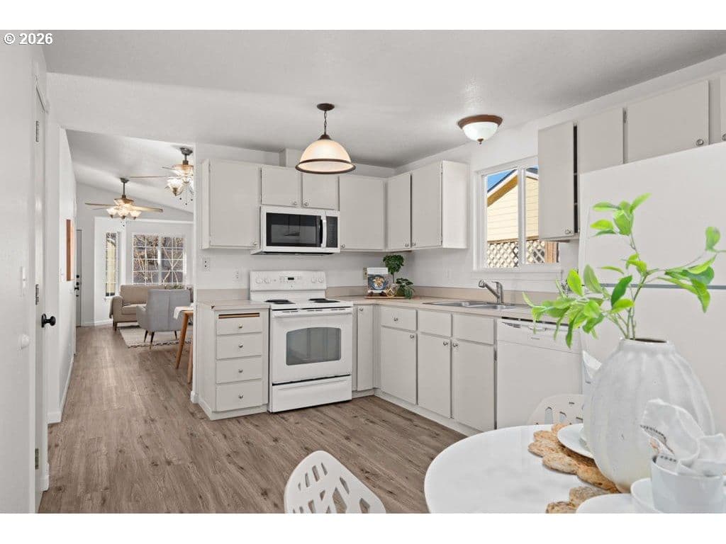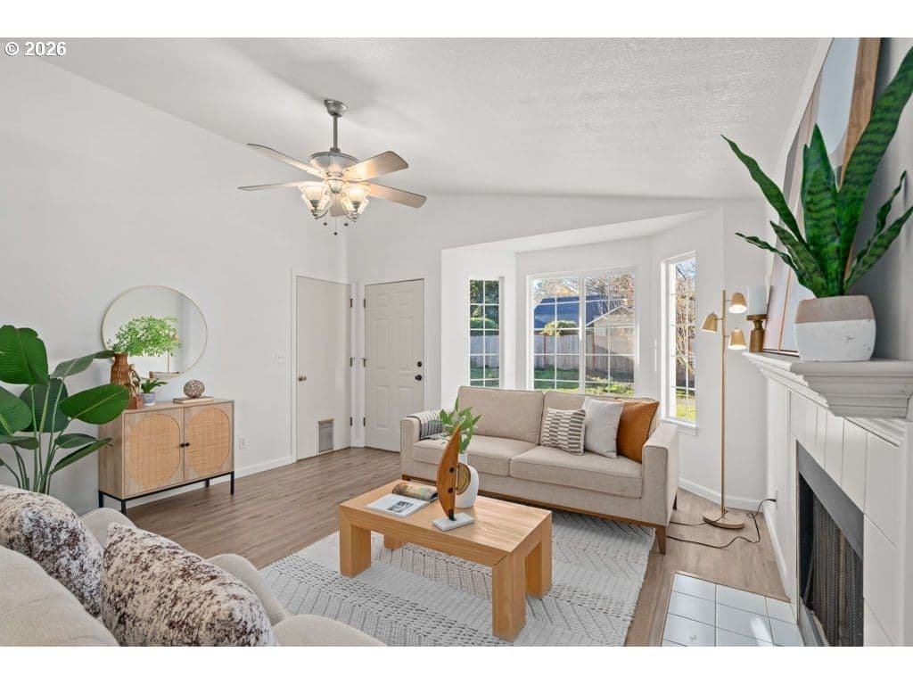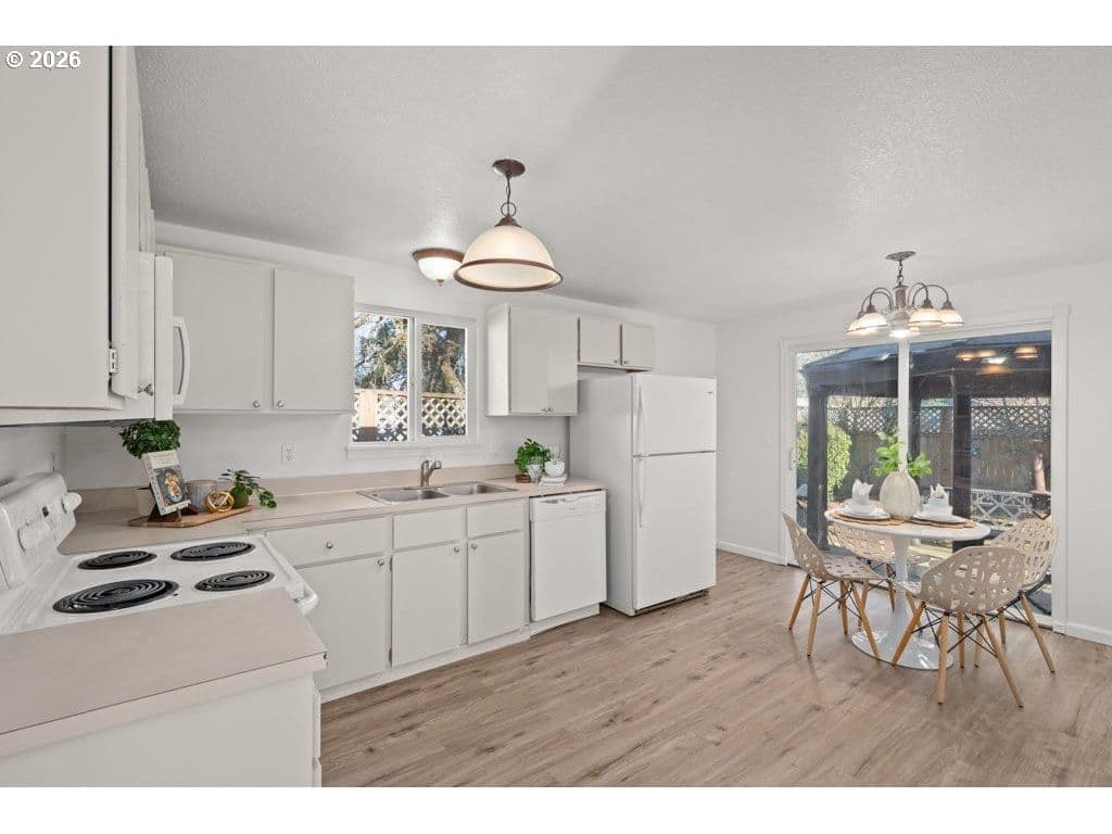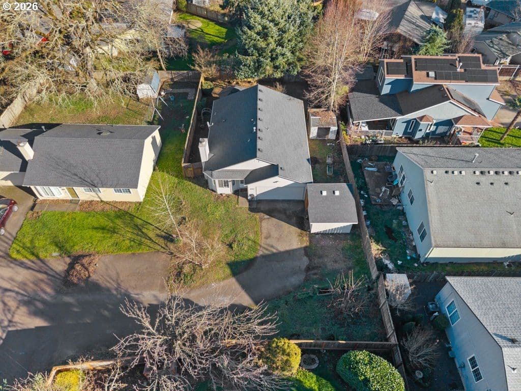 Light and bright one-level 3-bedroom, 2-bath home tucked away on a quiet private drive in Beaverton. Vaulted ceilings and an open living and dining layout create a spacious, airy feel with excellent natural light and effortless flow. The eat-in kitchen offers functional space for everyday living, meal prep, and entertaining. The en-suite primary bedroom serves as a peaceful retreat, complete with a private full bath. Two additional bedrooms and a second full bathroom complete the easy-living floor plan. Set on a large, fully fenced lot, the backyard offers exciting possibilities, featuring a utility shed with power plus an additional storage shed—ideal for hobbies, projects, and extra storage. Additional highlights include a two-car attached garage and fresh interior and exterior paint. Ideally located minutes from Nike, Intel, and the High Tech Corridor, and blocks from Arnold Park and the prestigious International School of Beaverton, this home offers comfort, convenience, and opportunity. Come see what your next chapter could look like today.