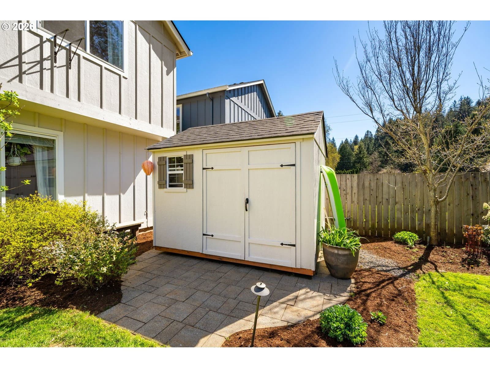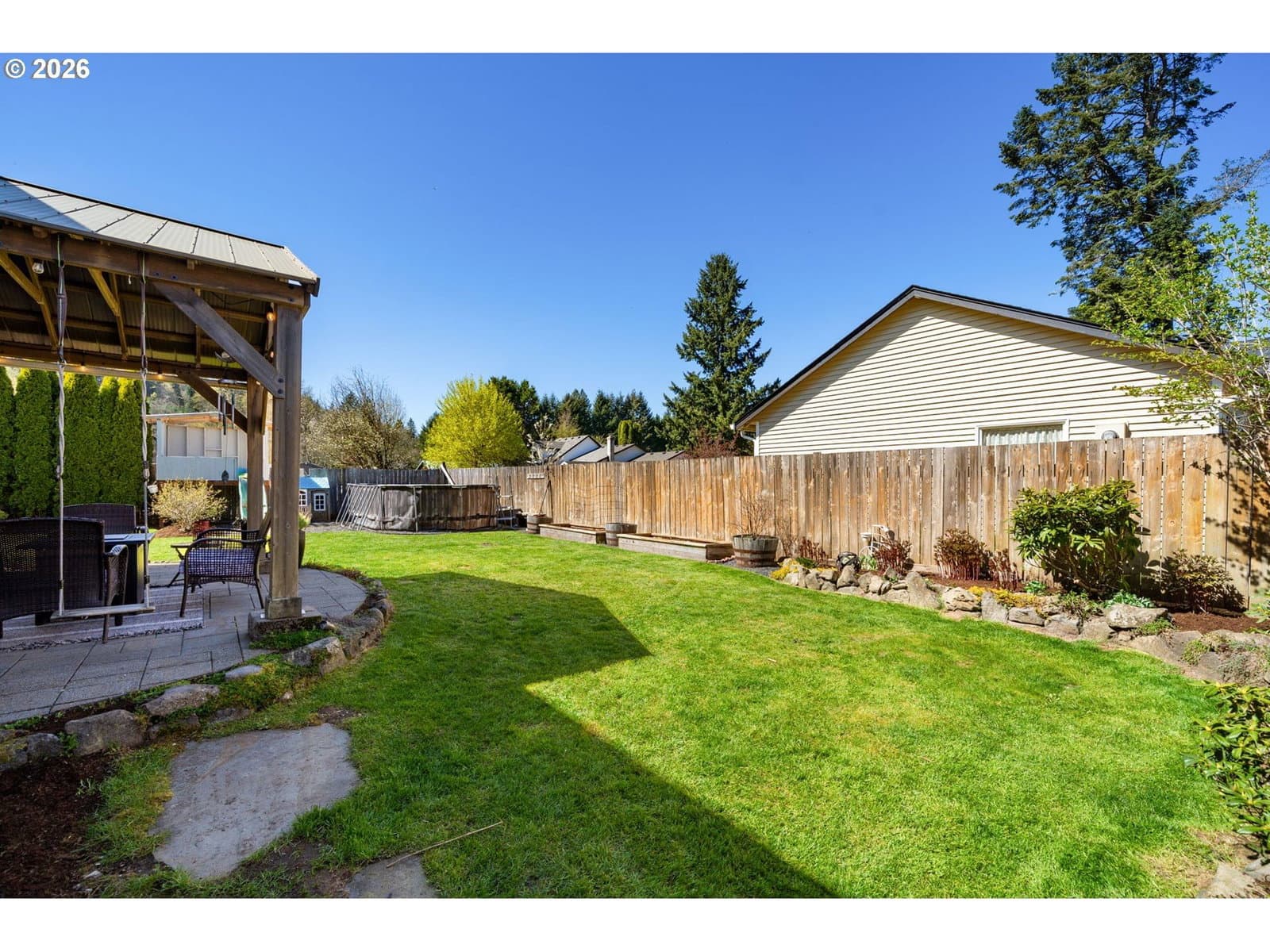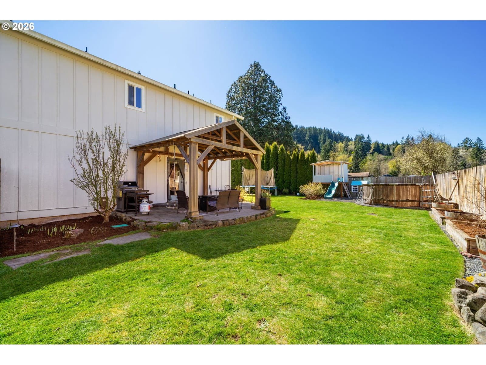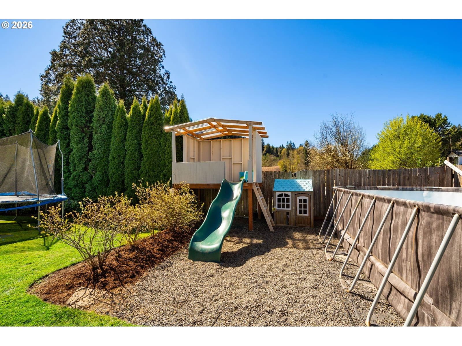 One of the best landscaped yards in Yacolt! Raised garden beds, hydrangeas, blueberry bushes covered patio, sprinklers and low voltage lighting. New roof in 2025 (nearly all new sheathing AND transferrable warranty), new exhaust vents and venting out of the attic. New carpet in 2024, LVT floors. Both bathrooms have new vanities, LVT flooring, new light fixtures and mirrors. 2023 Kitchen appliances replaced. Ceiling fans in every bedroom. Primary suite features accent wall, attached bathroom with walk in shower, separate water closet, and walk in closet. Upstairs Den/office makes a great hideaway! All of the included extras: Above ground pool, play structure, shed, Refrigerator.