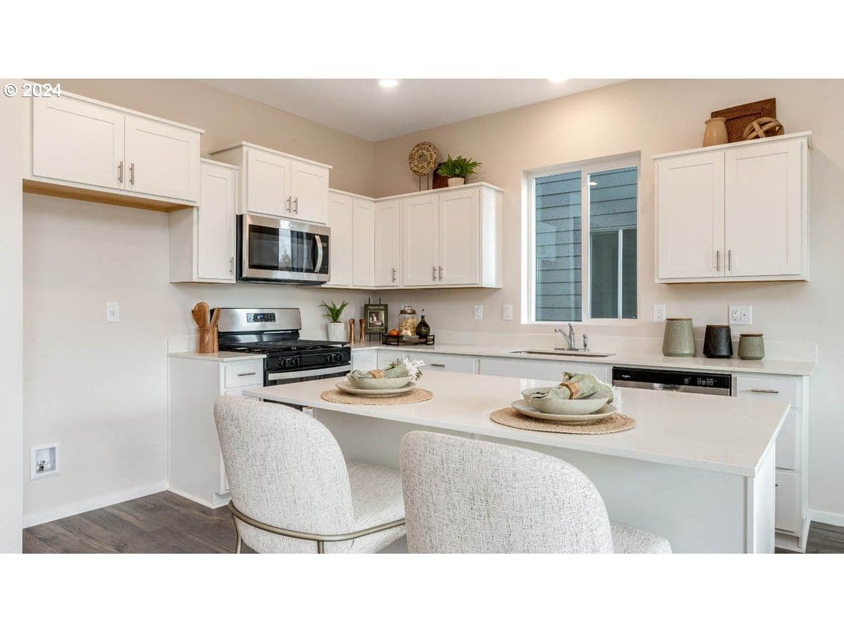 New construction in Salem! This dashing Dahlia floor plan is a beautiful home that features 4 bedrooms, 2.5 bathrooms, with a loft on the second floor that brings in ample amounts of natural light. There’s a light and bright open concept living space with tall ceilings and luxury features starring a kitchen with solid quartz countertops, shaker cabinetry, a roomy pantry, and an island that provides ample space for food preparation and extra seating. The kitchen comes equipped with lavish stainless-steel appliances including a free-standing gas range oven, dishwasher, and microwave with vent hood. The upstairs loft space offers a versatile area that can be used as an entertainment room or play area. The laundry room is located on the upper floor for swift convenience. The primary bedroom offers a true retreat with a spacious walk-in closet, double vanity sink, and a walk-in shower. Receive a closing cost credit with use of builder’s preferred lender, reach out for more details. Sales office hours 9:30am – 4:30pm daily. Be a part of this wonderful community at East Park Village! The community is located by Interstate 5 offering swift access to explore the Greater Salem area, and is just minutes away from the state capitol, outstanding local restaurants, and shopping centers like the Willamette Valley Center. Photos are representative of plan only and may vary as built.