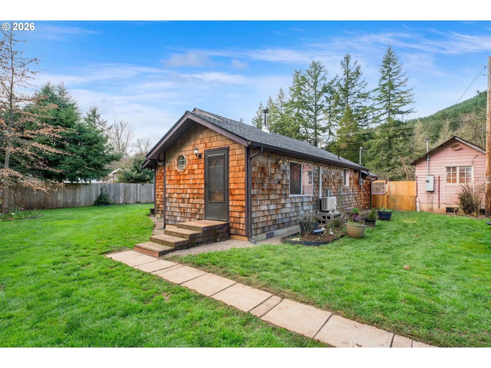 Enjoy this charming property along scenic Row River Rd, where peaceful surroundings and beautiful outdoor space create a truly inviting place to call home. Set on nearly half an acre, this well-maintained cottage offers comfortable living with a wonderful balance of indoor warmth and outdoor enjoyment. Step inside to a thoughtfully arranged living space featuring updated flooring, abundant natural light, and a welcoming layout that feels both open and cozy. The kitchen offers generous cabinet storage, ample counter space, and newer appliances including a stove range and refrigerator, making everyday cooking and entertaining both convenient and enjoyable while remaining connected to the main living area.The living room provides a comfortable gathering space, highlighted by a newer pellet stove that adds warmth and charm during the cooler seasons. Along with a ductless split system provides efficient year-round comfort in the warmer seasons. Two bedrooms and two bathrooms offer flexibility for everyday living, guests, or your home office needs.Several improvements for peace of mind, include a 2-year-old roof and updated hot water heater.Outside, the property truly shines. The spacious yard features mature landscaping and a wonderful variety of fruit trees including cherry, apple, plum, fig, mulberry, and walnut, along with blueberry plants. Garden beds and a greenhouse provide excellent opportunities for gardening, while open lawn areas offer space to relax, entertain, or expand outdoor living.Additional highlights include multiple outbuildings, RV parking, and a fenced yard offering privacy and versatility. Located just steps from the Row River Bike Trail, the property provides a peaceful setting while remaining a bike ride away to Dorena Lake and the convenient amenities in Cottage Grove, all a scenic drive away. Buyer to verify any and all information