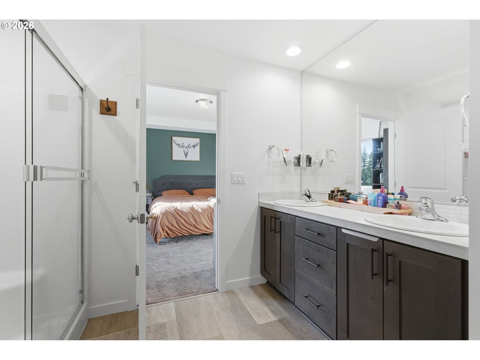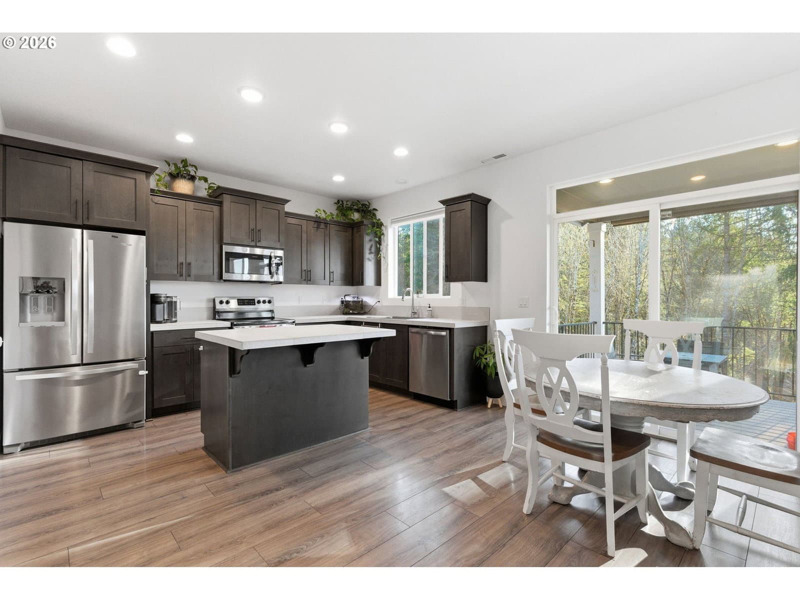 Contemporary 2023 gem in peaceful neighborhood. Open layout with electric fireplace accent wall, chefs kitchen, and private deck with forest views. Upstairs features a spacious primary suite with dual vanities and walk-in closet, alongside two additional bedrooms.