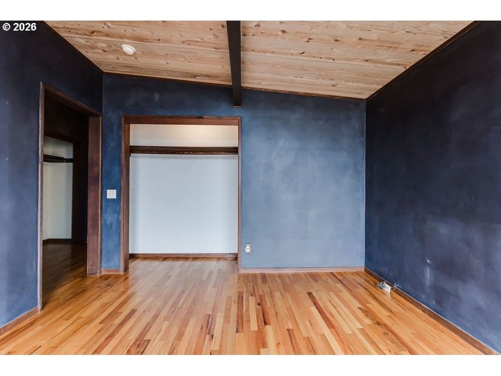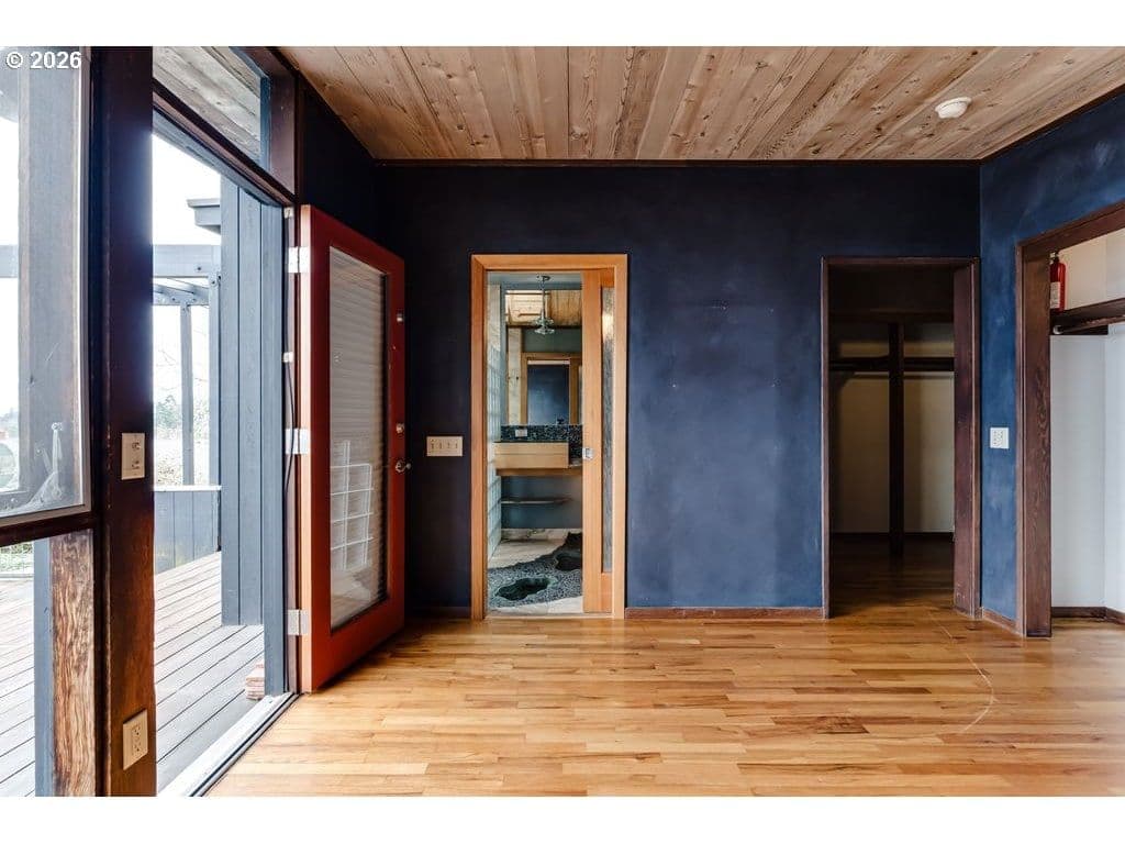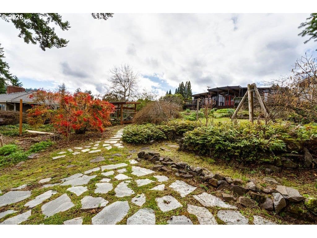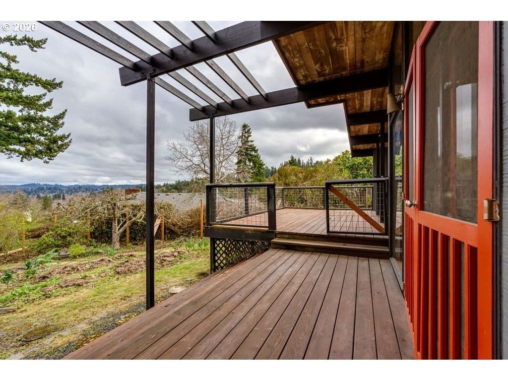 Tucked on one of the most desirable streets in Southwest Eugene and a neighborhood you will love coming home to, this light filled mid-century modern home blends character, comfort, and thoughtful organization throughout. Pull under the porte-cochere and enter through a covered atrium with tall double doors. Inside, a wall of windows spans the entire back of the home, framing sweeping valley views and filling the main living areas with natural light. The expansive covered deck extends your living space outdoors, offering a perfect place to relax or entertain while staying protected year-round. The interior features hardwood floors, warm cedar walls, open beamed ceilings, skylights, and two fireplaces — details that add both charm and functionality. The spacious living room and separate family room provide flexible options for gathering, working from home, hobbies, or quiet retreat. The primary suite has a large 7x9 closet and beautiful bathroom with one of a kind features. Outside, the fully fenced and private 1/3-acre yard is ready for gardeners and hobbyists alike, with fruit trees, generous planting space, and plenty of room to personalize. Pocket doors and smart layout choices throughout the home make everyday living easy and efficient. Two sheds and the carport provide plenty of storage. Washer and dryer are included for added convenience. Be sure to tour this desirable and distinctive home while it's available!