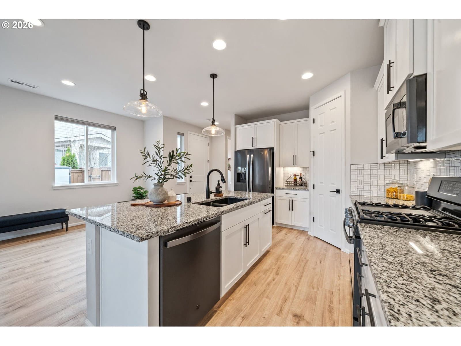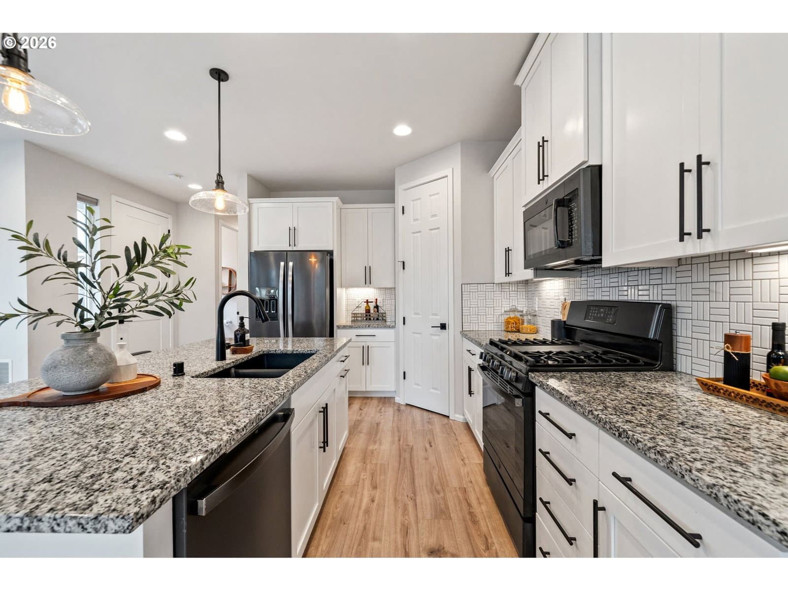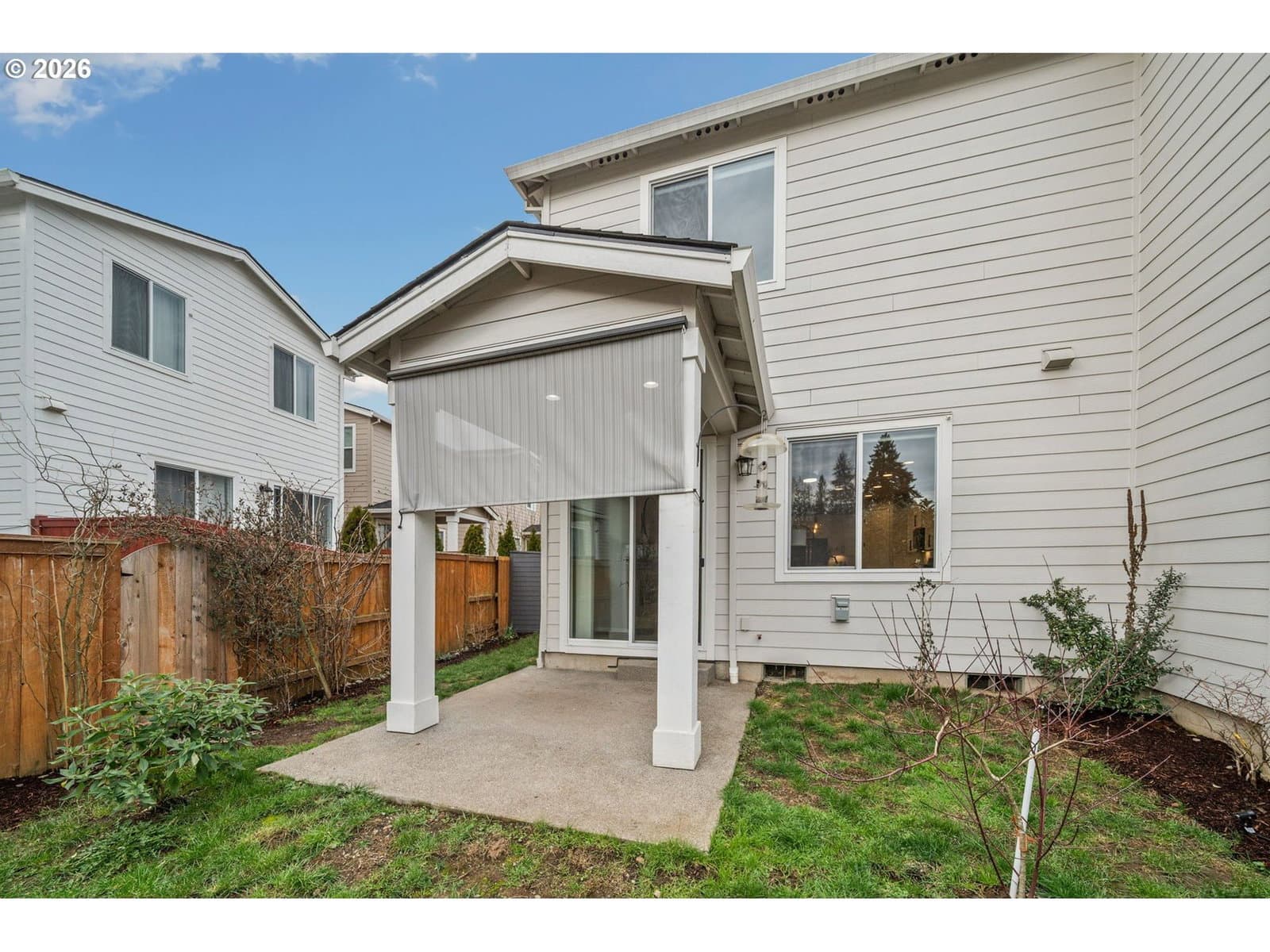 Located in Ridgefield’s desirable Kemper Grove neighborhood, this upgraded townhome offers a rare combination of privacy, modern finishes, and low-maintenance living with HOA dues of just $78 per month including front landscaping. Backing to greenspace with sweeping territorial views and set on a larger lot, the property features a fenced backyard with a covered patio plumbed for natural gas, three storage sheds, and direct access to peaceful outdoor surroundings just blocks from neighborhood parks, walking trails, and a future dog park. The modern elevation welcomes you into an open-concept floor plan featuring a spacious great room anchored by a tile-surround gas fireplace, creating a warm focal point for everyday living and entertaining. Upgraded can lighting enhances the light and bright feel throughout, complemented by durable LVP flooring on the main level, new carpet installed in 2026 upstairs, and fresh interior paint for a clean, move-in-ready finish. The kitchen showcases white cabinetry, granite countertops, and an upgraded stainless steel appliance package including refrigerator, built-in microwave, and dishwasher, along with a pantry and eat-in island designed for functionality and casual dining. A sliding glass door connects the dining area to the backyard, offering seamless indoor-outdoor flow. All bedrooms are wired for ceiling fans and all closets feature electrical outlets for added flexibility. Additional highlights: 8' Doors on main, extra insulation between homes for enhanced comfort and sound reduction, whole-house blinds, a high-efficiency tankless water heater, efficient furnace and air conditioning, and a two-car garage. Well-maintained and ideally located with convenient access to shopping, dining, services, and major commuter routes, this home delivers comfort, efficiency, and scenic living in one of Ridgefield’s most sought-after communities.