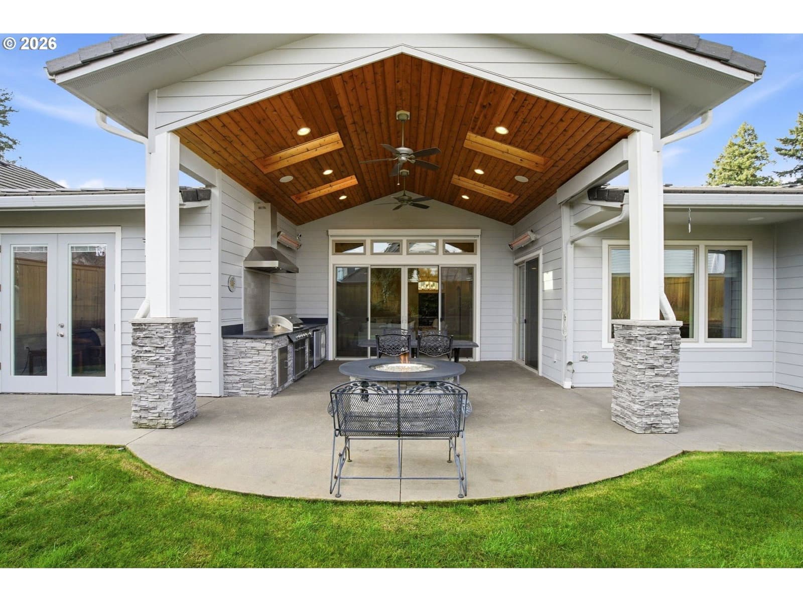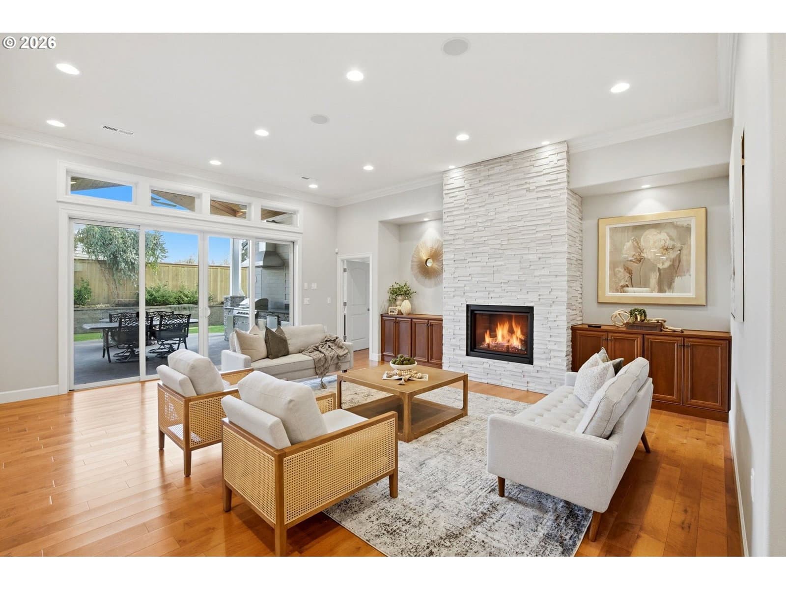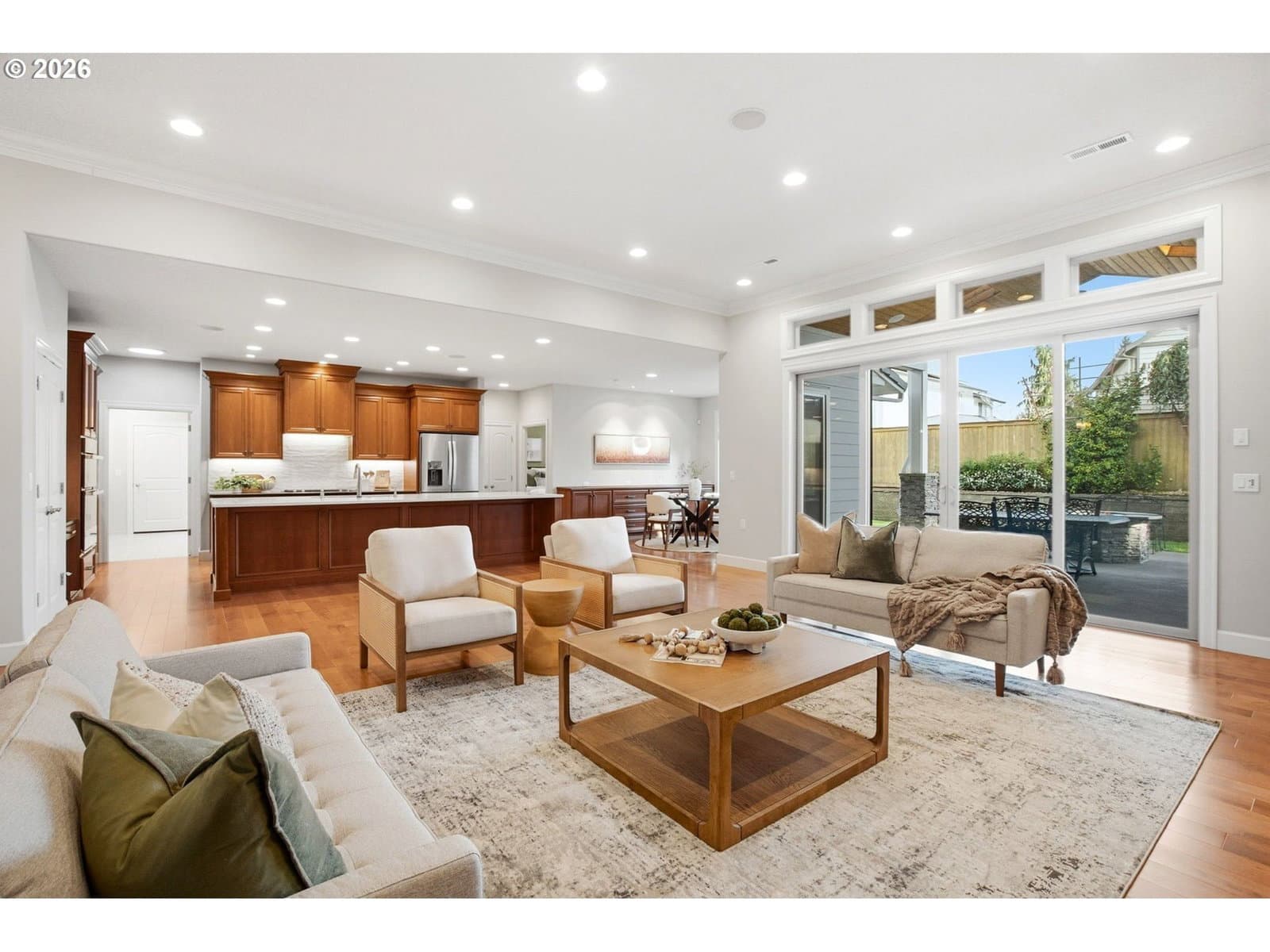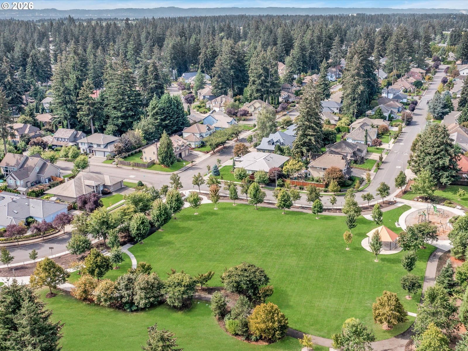No-step home! This custom built one owner single-story in popular First Place is tailored for aging in place. Experience refined living with exceptional functionality. 3 BD + office + 3 full BA. Designed for gathering, the spacious great room and well-appointed kitchen feature an impressive island that becomes the natural centerpiece of the home. The split bedroom layout provides separation between the primary suite and secondary bedrooms for increased privacy and quieter living spaces. Bdrm 2 has full bath just down the hall; bdrm 3 has adjoining full bath. Additional accessibility features include wide hallway, wide entrances, extra wide doors, roll in shower in primary, walk-in shower in hall bathroom. All rooms are large with most closets having motion sensor lighting including the walk-in pantry. Solar tubes bring in bright, diffused natural lighting. More highlights include: heated floors in primary bathroom, huge primary walk-in closet, generously sized laundry, slab granite and quartz, soft-close drawers/cabinets, two tankless water heaters, impeccable 3/4” hardwood flooring, abundant storage/closet space, built-in features, high ceilings, butlers pantry, under cabinet lighting, under eve lighting. Office/den with custom full-wall built-in desk designed for two. The large covered patio has remote/motorized shades, wood slat vaulted ceiling, skylights, fans, heaters and built-in fire pit (gas). Also featuring an outdoor entertaining station with built-in BBQ (propane), prep space, storage plus under counter refrigerator. 3 car garage with storage cabinets. Kitchen/patio refrigerators stay, Sonos sound system in great room included, 1-year home warranty included. Near the 3.5 acre neighborhood park featuring paved paths, benches, garden, gazebo, playground and open grass area. There are numerous resident-focused activities too. Conveniently located near groceries, restaurants, medical facilities, vet and easy access to I-205. Truly a standout home!