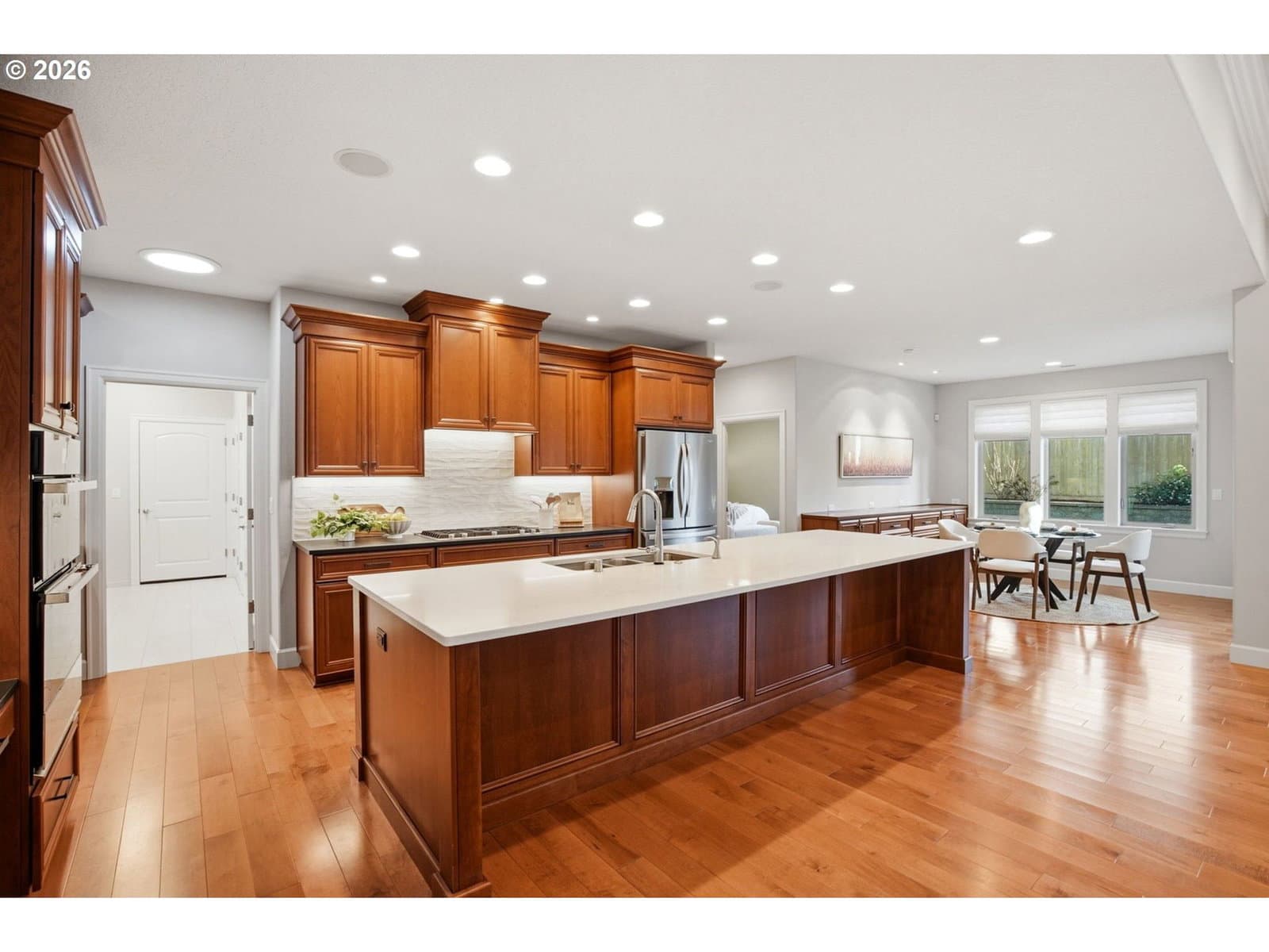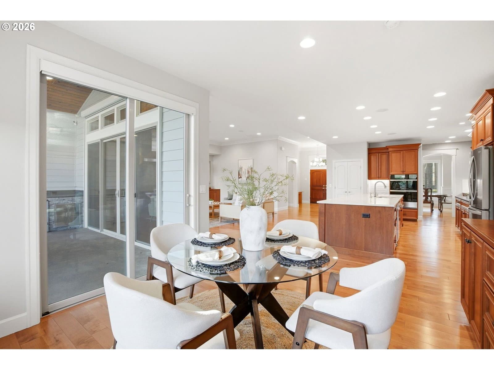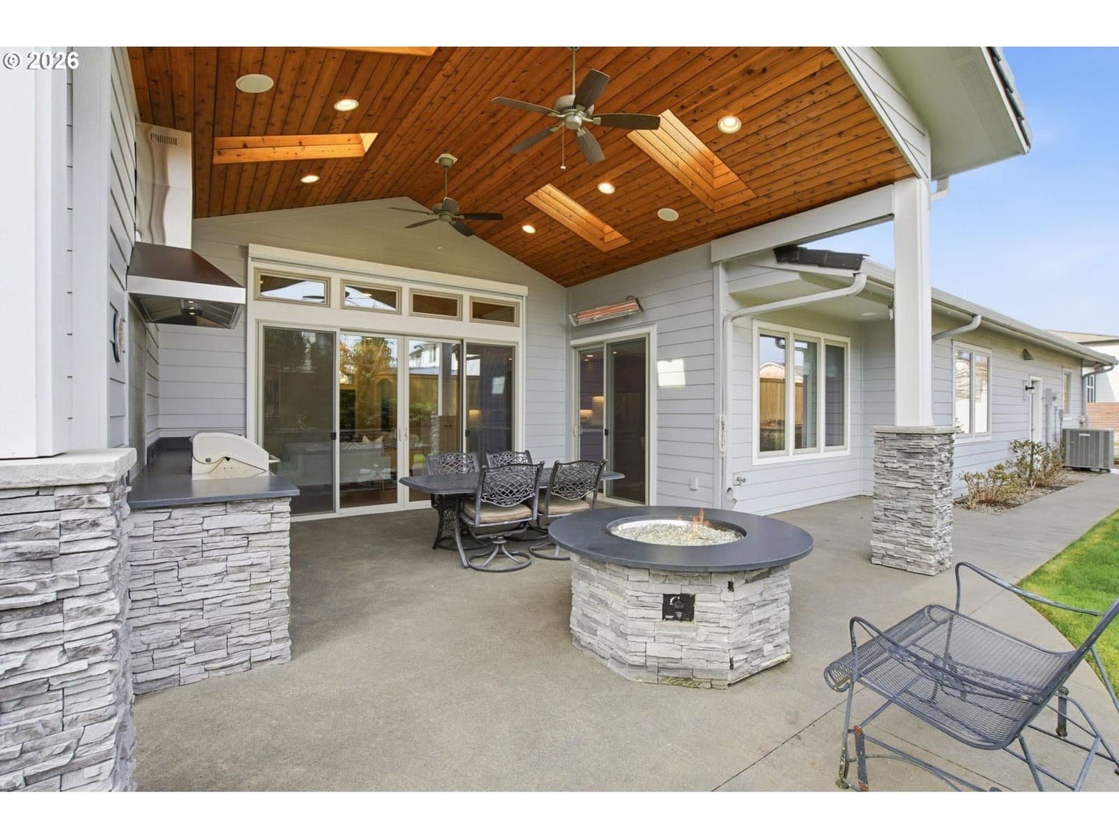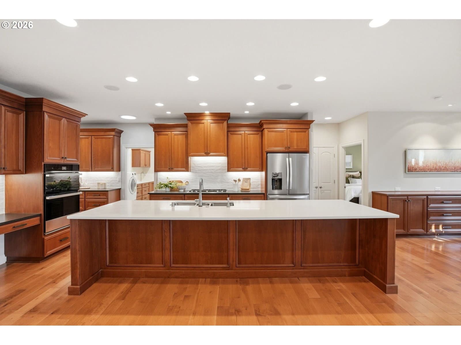 No-step home! This custom built one owner single-story in popular First Place is tailored for aging in place. Experience refined living with exceptional functionality. 3 BD + office + 3 full BA. Designed for gathering, the spacious great room and well-appointed kitchen feature an impressive island that becomes the natural centerpiece of the home. The split bedroom layout provides separation between the primary suite and secondary bedrooms for increased privacy and quieter living spaces. Bdrm 2 has full bath just down the hall; bdrm 3 has adjoining full bath. Additional accessibility features include wide hallway, wide entrances, extra wide doors, roll in shower in primary, walk-in shower in hall bathroom. All rooms are large with most closets having motion sensor lighting including the walk-in pantry. Solar tubes bring in bright, diffused natural lighting. More highlights include: heated floors in primary bathroom, huge primary walk-in closet, generously sized laundry, slab granite and quartz, soft-close drawers/cabinets, two tankless water heaters, impeccable 3/4” hardwood flooring, abundant storage/closet space, built-in features, high ceilings, butlers pantry, under cabinet lighting, under eve lighting. Office/den with custom full-wall built-in desk designed for two. The large covered patio has remote/motorized shades, wood slat vaulted ceiling, skylights, fans, heaters and built-in fire pit (gas). Also featuring an outdoor entertaining station with built-in BBQ (propane), prep space, storage plus under counter refrigerator. 3 car garage with storage cabinets. Kitchen/patio refrigerators stay, Sonos sound system in great room included, 1-year home warranty included. Near the 3.5 acre neighborhood park featuring paved paths, benches, garden, gazebo, playground and open grass area. There are numerous resident-focused activities too. Conveniently located near groceries, restaurants, medical facilities, vet and easy access to I-205. Truly a standout home!