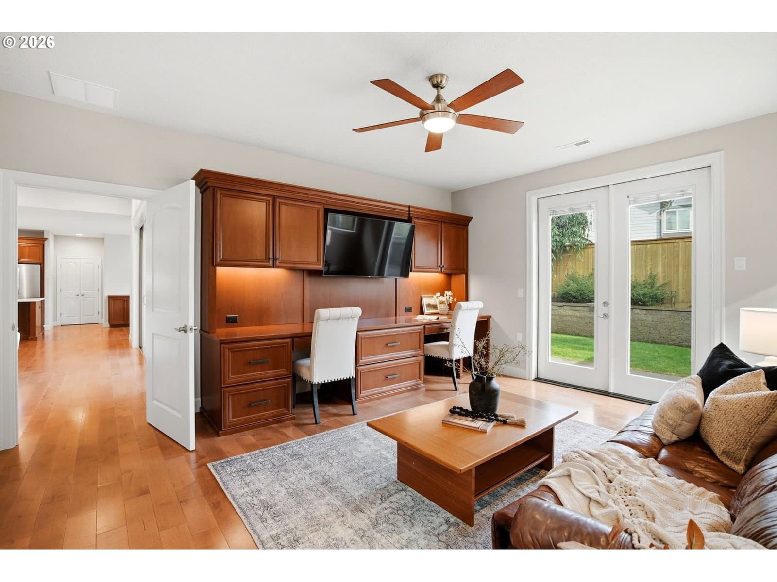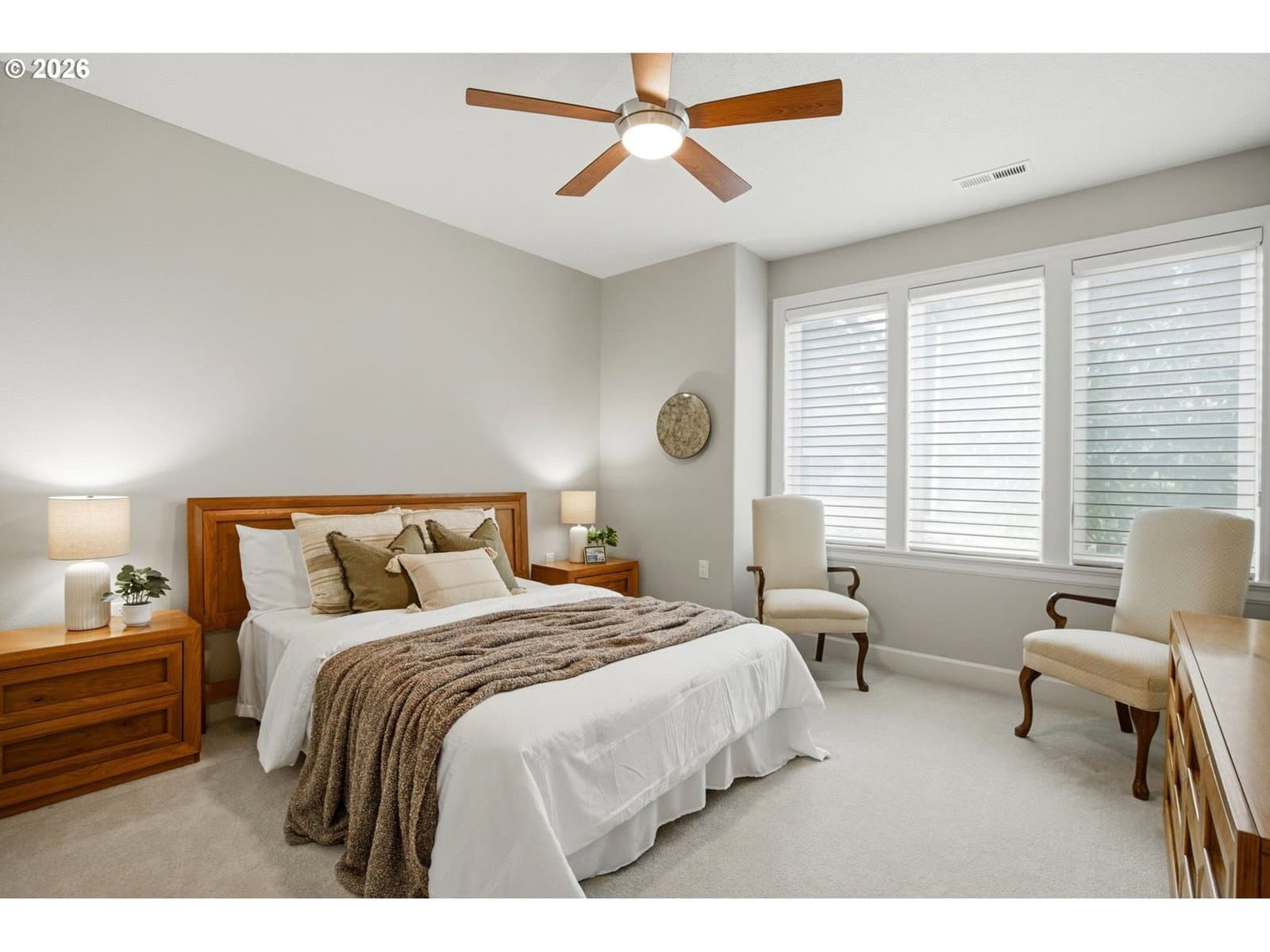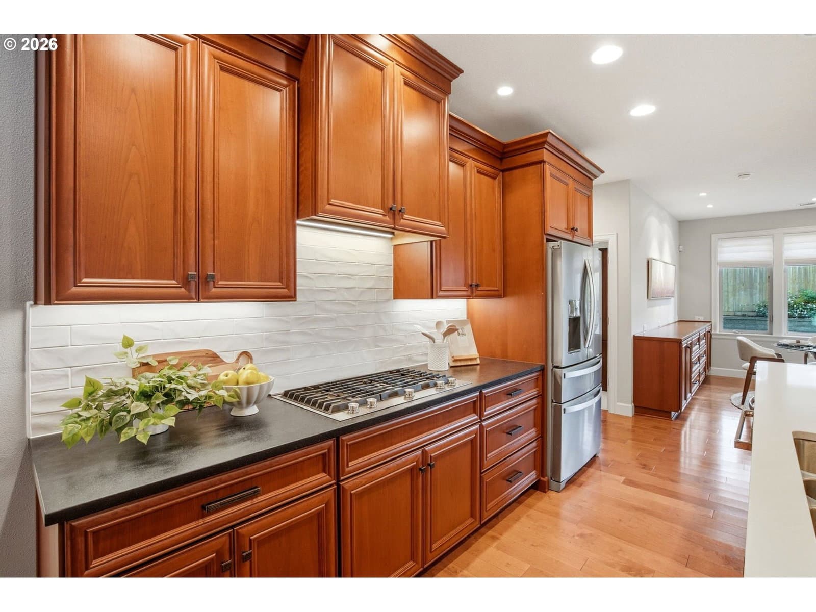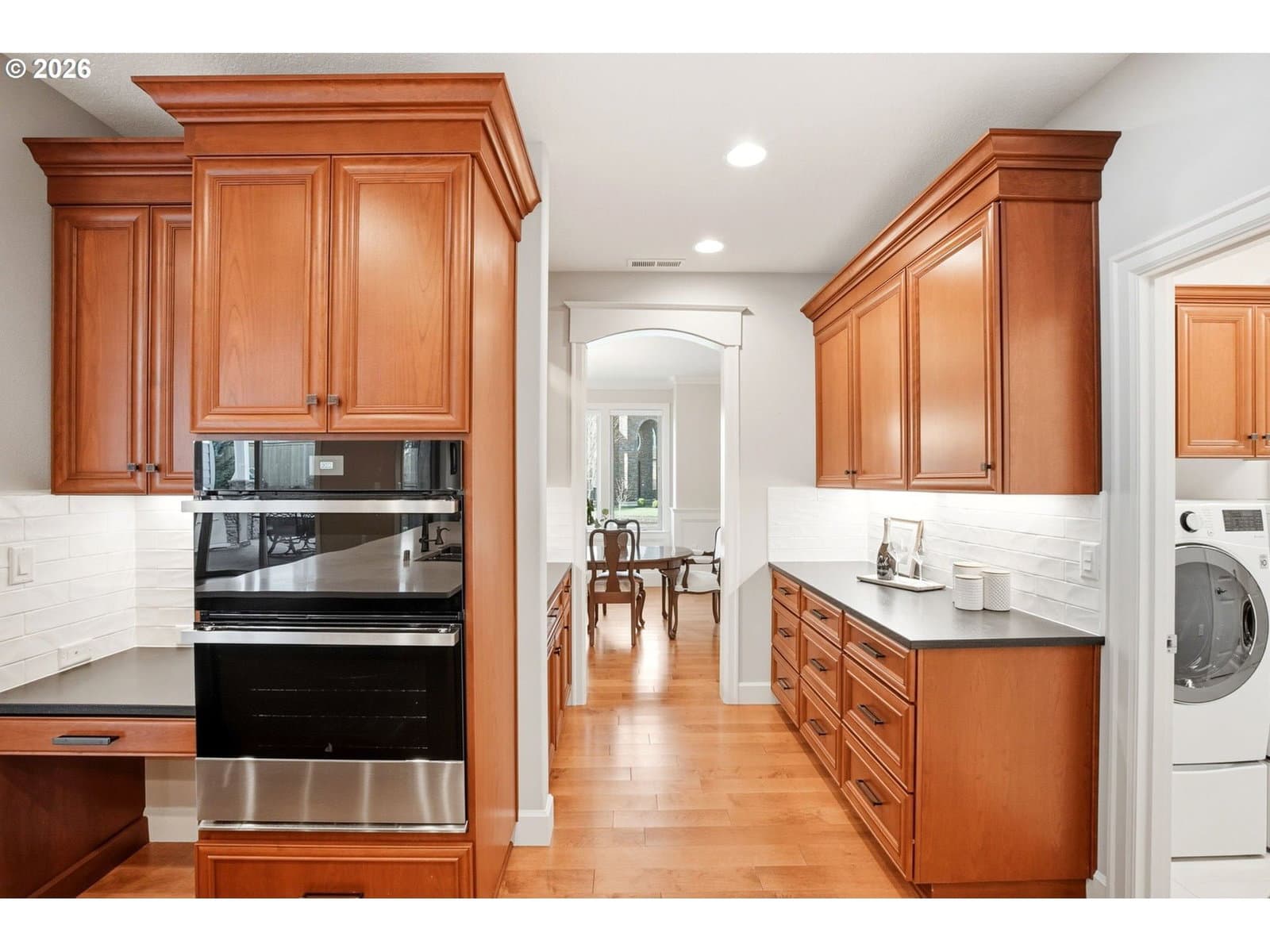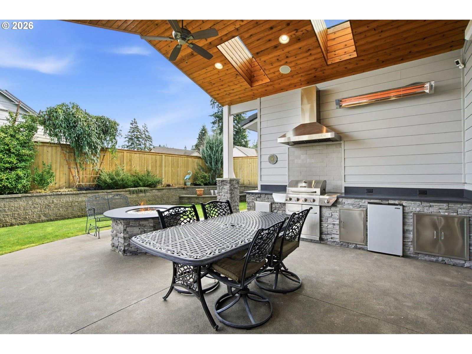 No-step home! This custom built one owner single-story in popular First Place is tailored for aging in place. Experience refined living with exceptional functionality. 3 BD + office + 3 full BA. Designed for gathering, the spacious great room and well-appointed kitchen feature an impressive island that becomes the natural centerpiece of the home. The split bedroom layout provides separation between the primary suite and secondary bedrooms for increased privacy and quieter living spaces. Bdrm 2 has full bath just down the hall; bdrm 3 has adjoining full bath. Additional accessibility features include wide hallway, wide entrances, extra wide doors, roll in shower in primary, walk-in shower in hall bathroom. All rooms are large with most closets having motion sensor lighting including the walk-in pantry. Solar tubes bring in bright, diffused natural lighting. More highlights include: heated floors in primary bathroom, huge primary walk-in closet, generously sized laundry, slab granite and quartz, soft-close drawers/cabinets, two tankless water heaters, impeccable 3/4” hardwood flooring, abundant storage/closet space, built-in features, high ceilings, butlers pantry, under cabinet lighting, under eve lighting. Office/den with custom full-wall built-in desk designed for two. The large covered patio has remote/motorized shades, wood slat vaulted ceiling, skylights, fans, heaters and built-in fire pit (gas). Also featuring an outdoor entertaining station with built-in BBQ (propane), prep space, storage plus under counter refrigerator. 3 car garage with storage cabinets. Kitchen/patio refrigerators stay, Sonos sound system in great room included, 1-year home warranty included. Near the 3.5 acre neighborhood park featuring paved paths, benches, garden, gazebo, playground and open grass area. There are numerous resident-focused activities too. Conveniently located near groceries, restaurants, medical facilities, vet and easy access to I-205. Truly a standout home!