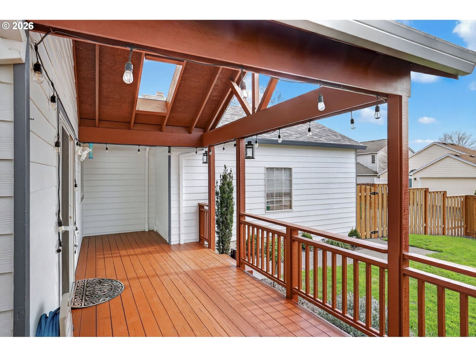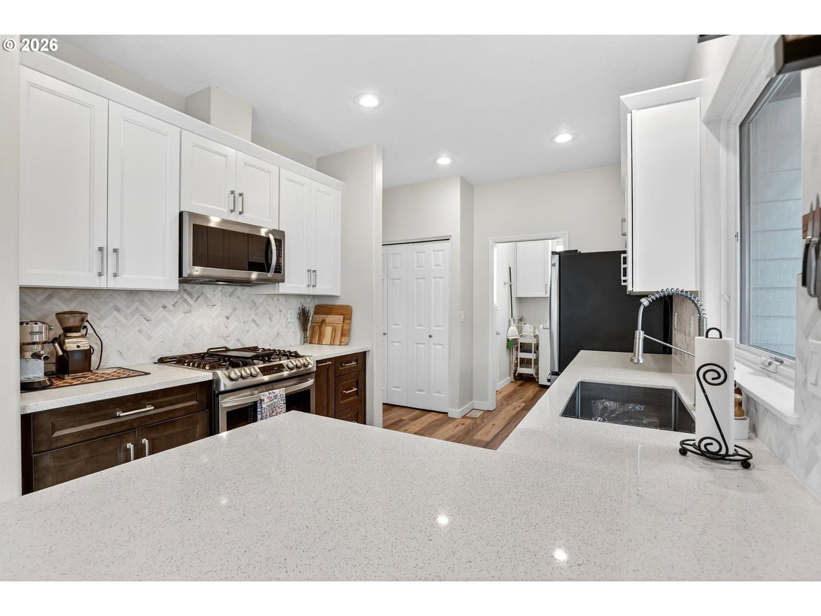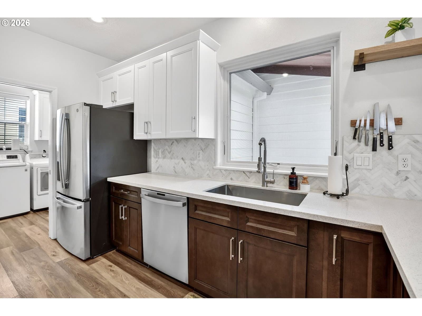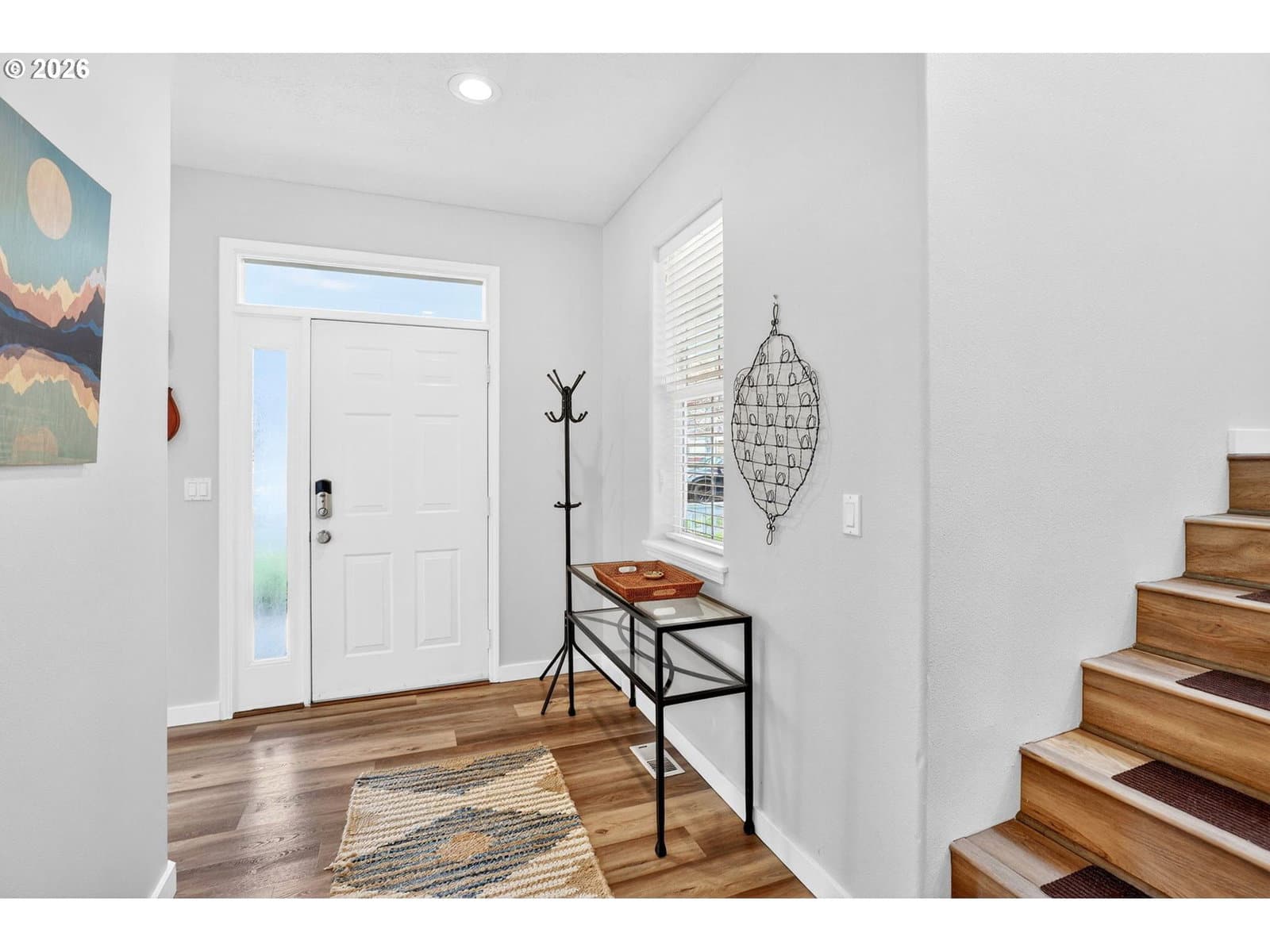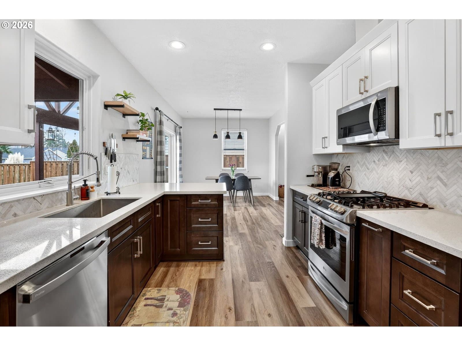 SUNNY & BRIGHT! Welcome to this 3 bed, 2.5 bath, 2 car garage home with lots of upgrades! This home features an updated kitchen with newer stainless steel-appliances, updated primary and downstairs half bathrooms, all new LVP flooring downstairs, and fresh paint throughout. The pride in ownership in this home is obvious with a newer roof, furnace, air conditioning and, water heater in 2015-2017 and new exterior paint in 2022. Future-proofed with smart-home solar technology, minimizing utility costs, and Internet powered by Ziply. Included with the sale: 2021 LG Washer & Dryer. Enjoy outdoor living in the newly fenced (2025) south-facing backyard, and all-day sunshine for the raised garden beds! Perfect for entertaining or relaxing on the covered deck. Your move-in-ready home is conveniently located near Happy Valley's hospitality hub, shopping, restaurants and food carts. Walking distance to the elementary school, library, and parks!