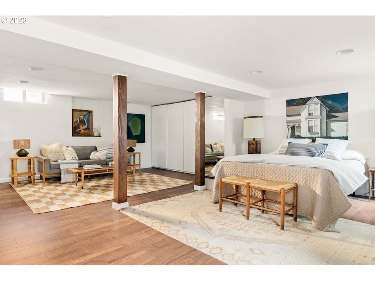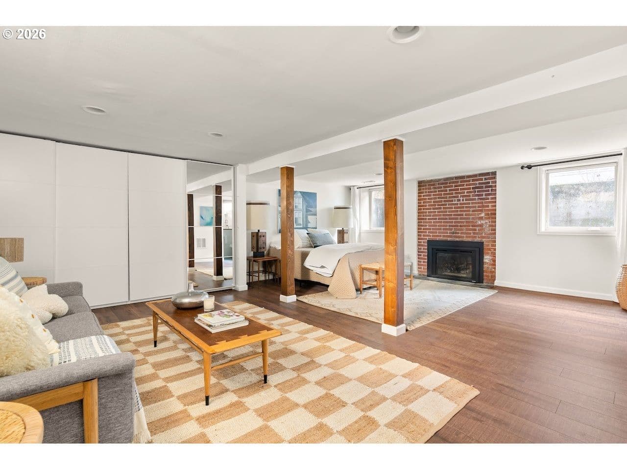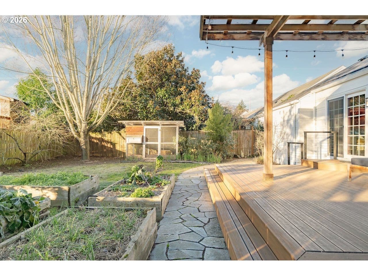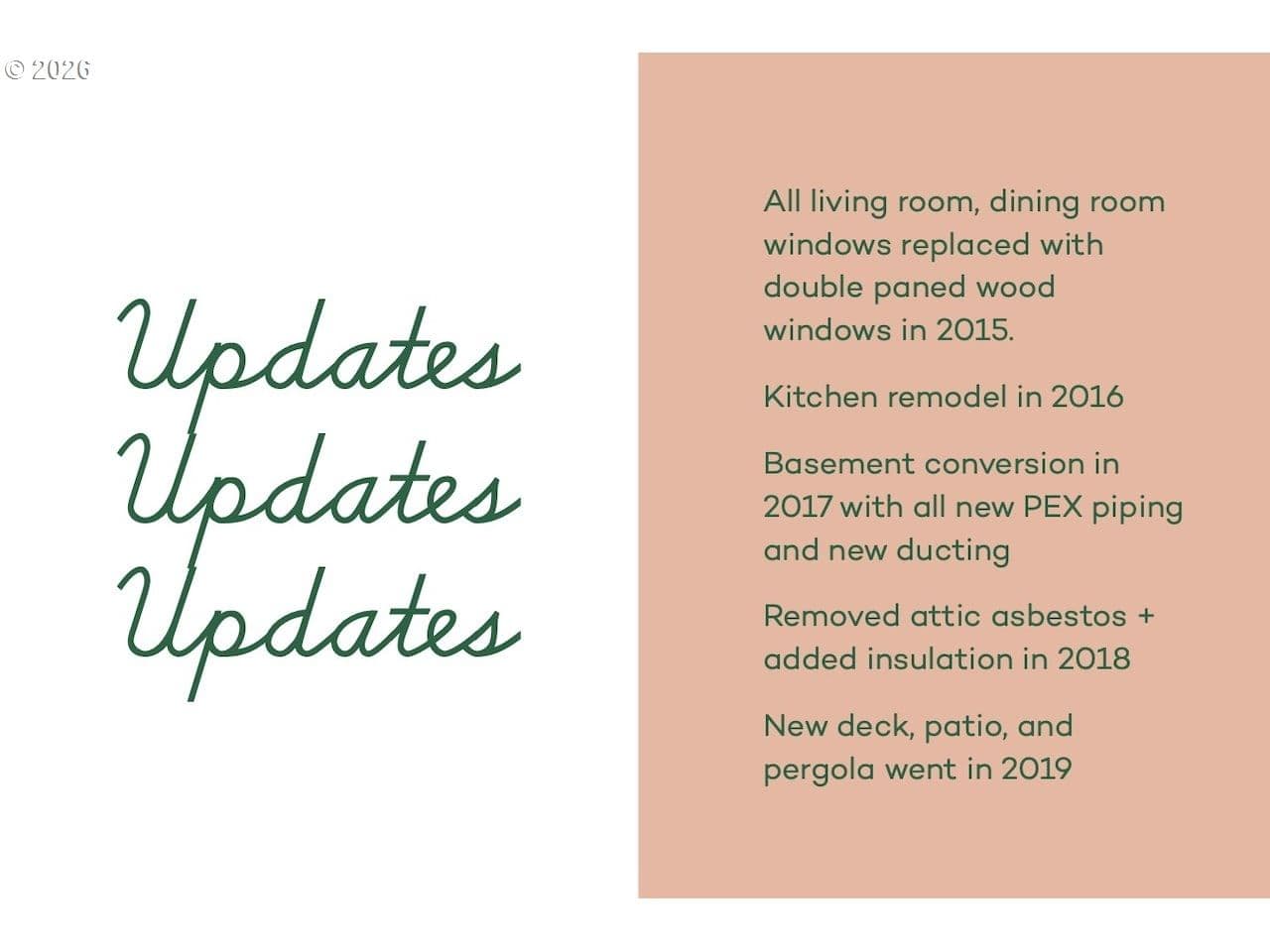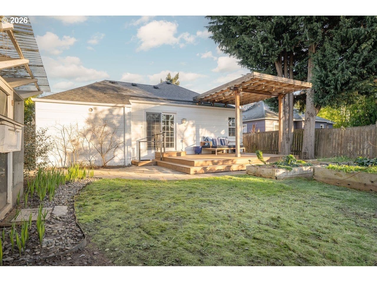 Presenting: The Overlook Ranchita, delivering classic 1941 charm with double the living space and a backyard that feels more like a small urban farm than a city lot. This light-filled ranch offers 4 bedrooms and 2 bathrooms, thoughtfully split across two fully finished levels. On the main level, hardwood floors, a wood-burning fireplace, and oversized picture windows create an easy, welcoming flow between the living and dining spaces. The efficient and bright kitchen has been updated with quartz counters and stainless appliances and has quick access to both the basement and a convenient side entry from the driveway - perfect for groceries, muddy shoes, or garden days. Downstairs, the 2017 remodel adds a dreamy primary suite (or flexible family room) with a gas fireplace and dual egress windows. It works equally well as a private retreat or movie-night headquarters. Also on the lower level, bedroom #4, a custom tile bathroom, storage and laundry with washer & dryer included. Nearly every major system has been handled: new roof and AC (2023), fresh interior and exterior paint (2026), new lighting, updated bathrooms, PEX plumbing, newer windows, added insulation, and new ducting. The work is done. The vibe is intact. Outside is where this home quietly shows off. A south-facing yard features a Trex deck with pergola, stone patio, and what the owners lovingly call Berry Lane: raspberries, blackberries, boysenberries, strawberries, blueberries, figs, persimmons, pomegranates, grapes, herbs, roses, garlic beds, and more. There is even a chicken coop ready for 3 - 4 hens, plus drip irrigation and raised beds built for serious growing. Set on the quieter stretch of Alberta, you are moments from Killingsworth, Mississippi, Stacks Coffee, Old Gold, Milk Glass Market, food carts, parks, bike routes, and downtown. Walk Score 84. Bike Score 100. Community score: off the charts. Classic ranch. Fully finished. Garden-forward. Effortlessly livable.
