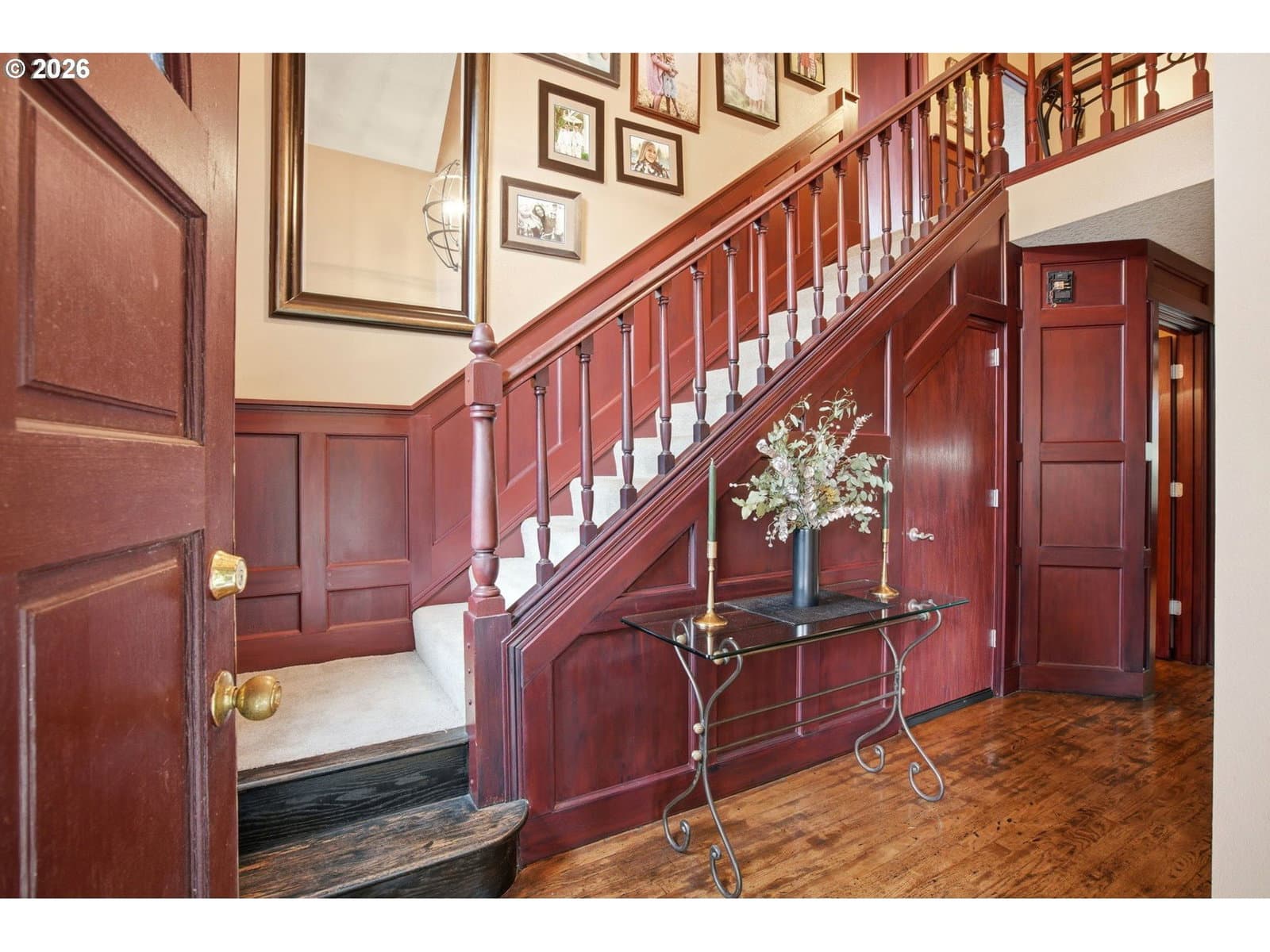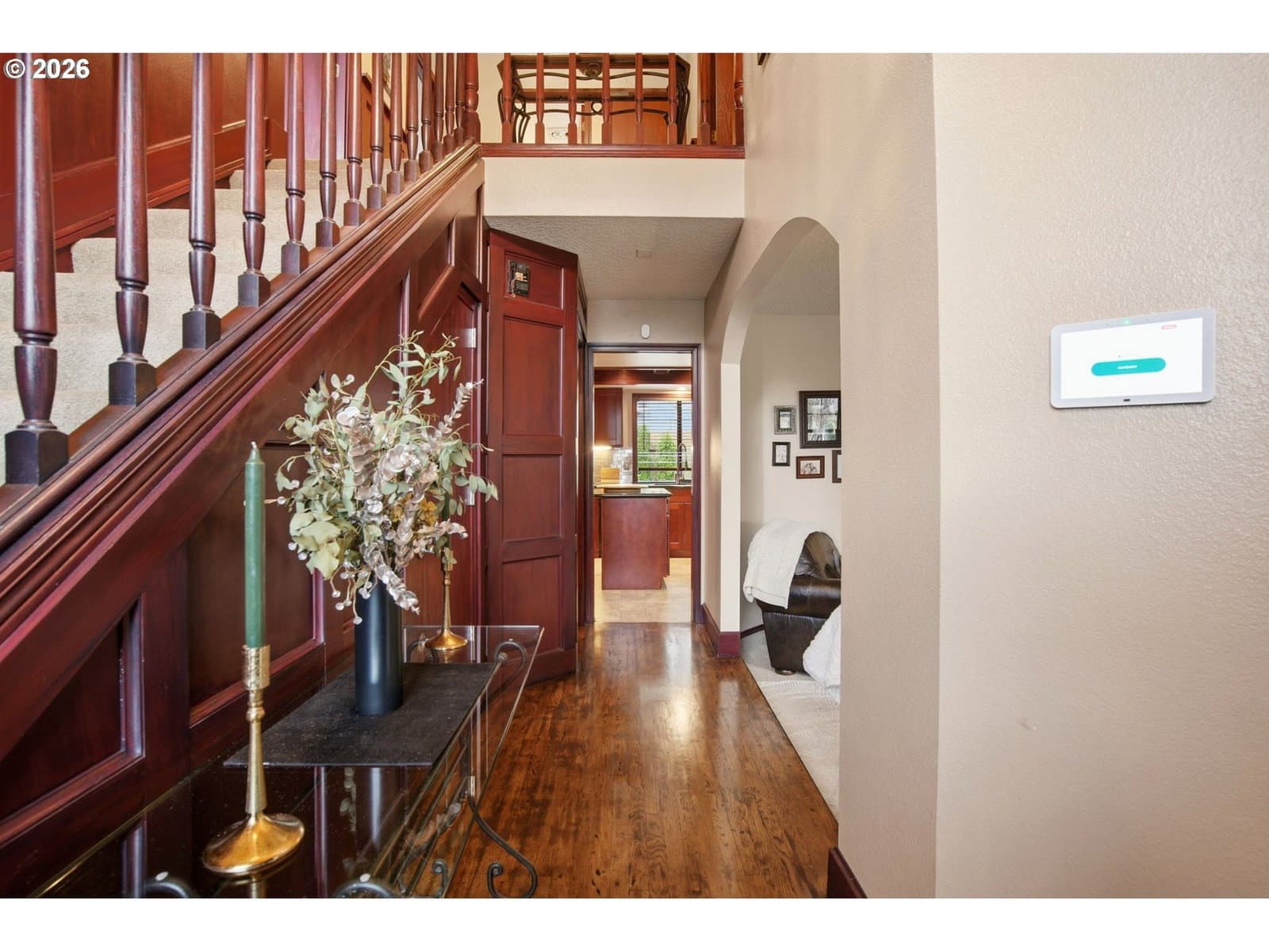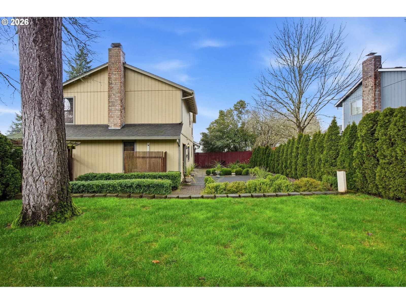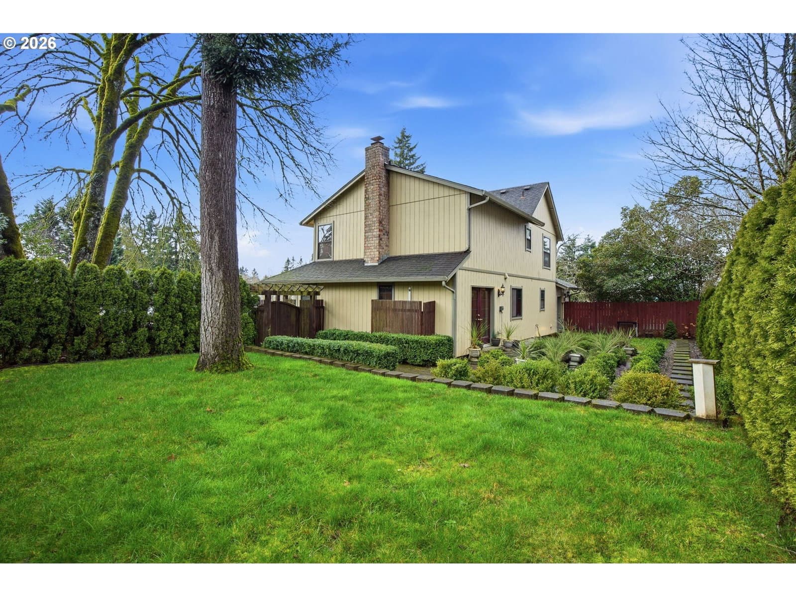 Beautiful home on corner lot, just 1 block from Bella Vista Park! Enter to the rich, cherry finish, wainscoting throughout entry, stairwell and carried into kitchen with coiffured ceiling. Shaker style, solid cherry cabinets. Granite countertops and great window above sink, overlooking private back yard. Dining room with French Doors, lead you to spacious, paver outdoor patio. Visualize yourself cozied up to the floor to ceiling, brick, wood burning fireplace, in sunken living room, with a glass of wine and a good book! Upstairs hosts a landing, overlooking grand entry. Primary en suite w/ large walk-in closet. So much to love about this enchanting home! Minutes to SE Side restaurants, shopping and PDX! Don't miss this one!