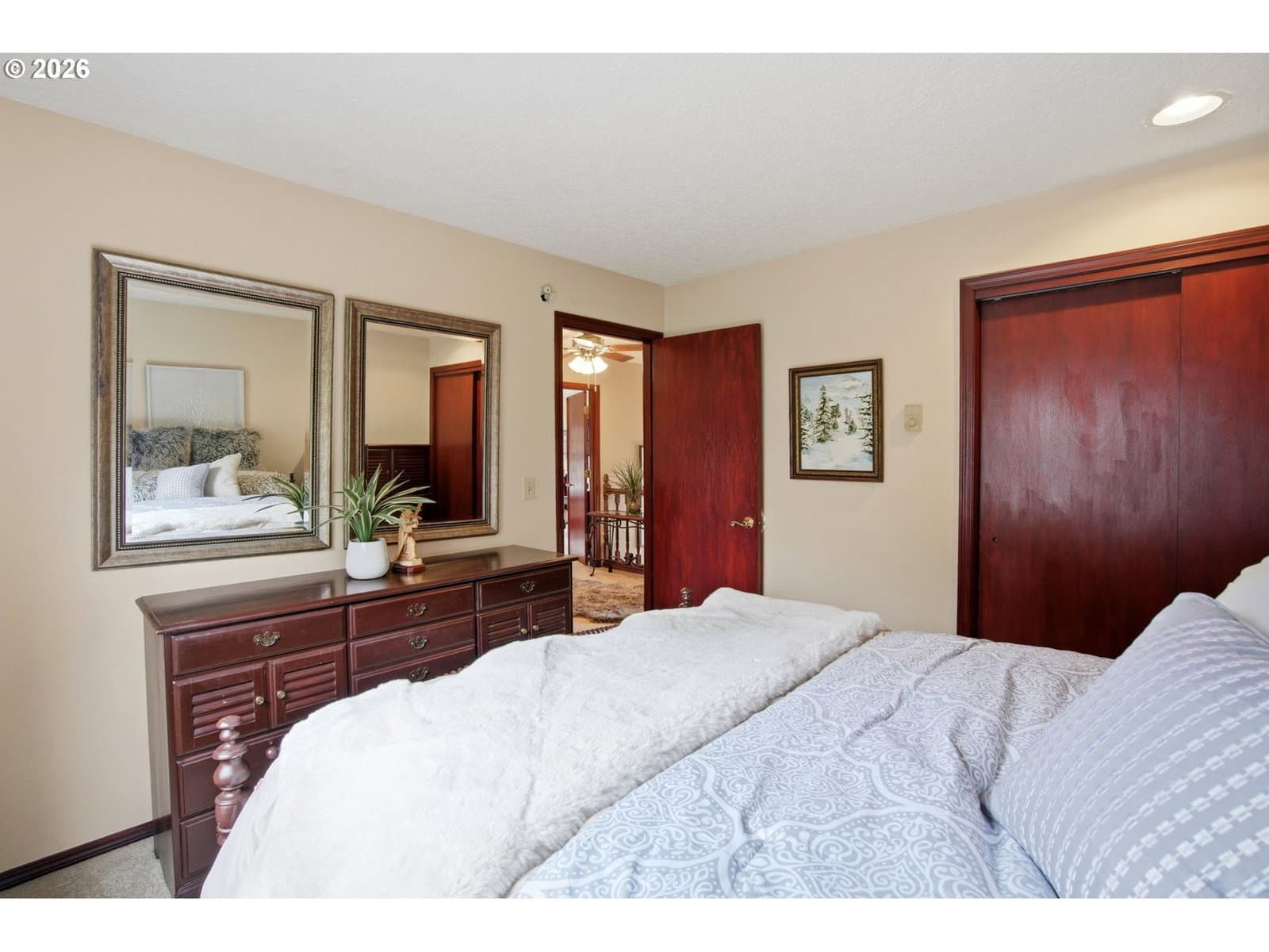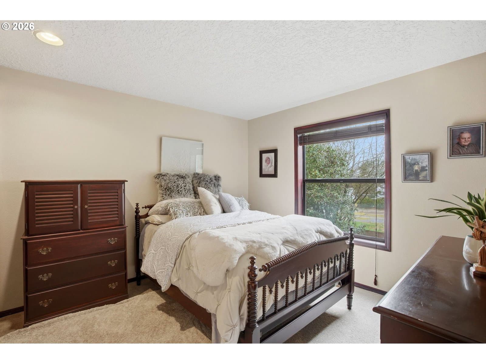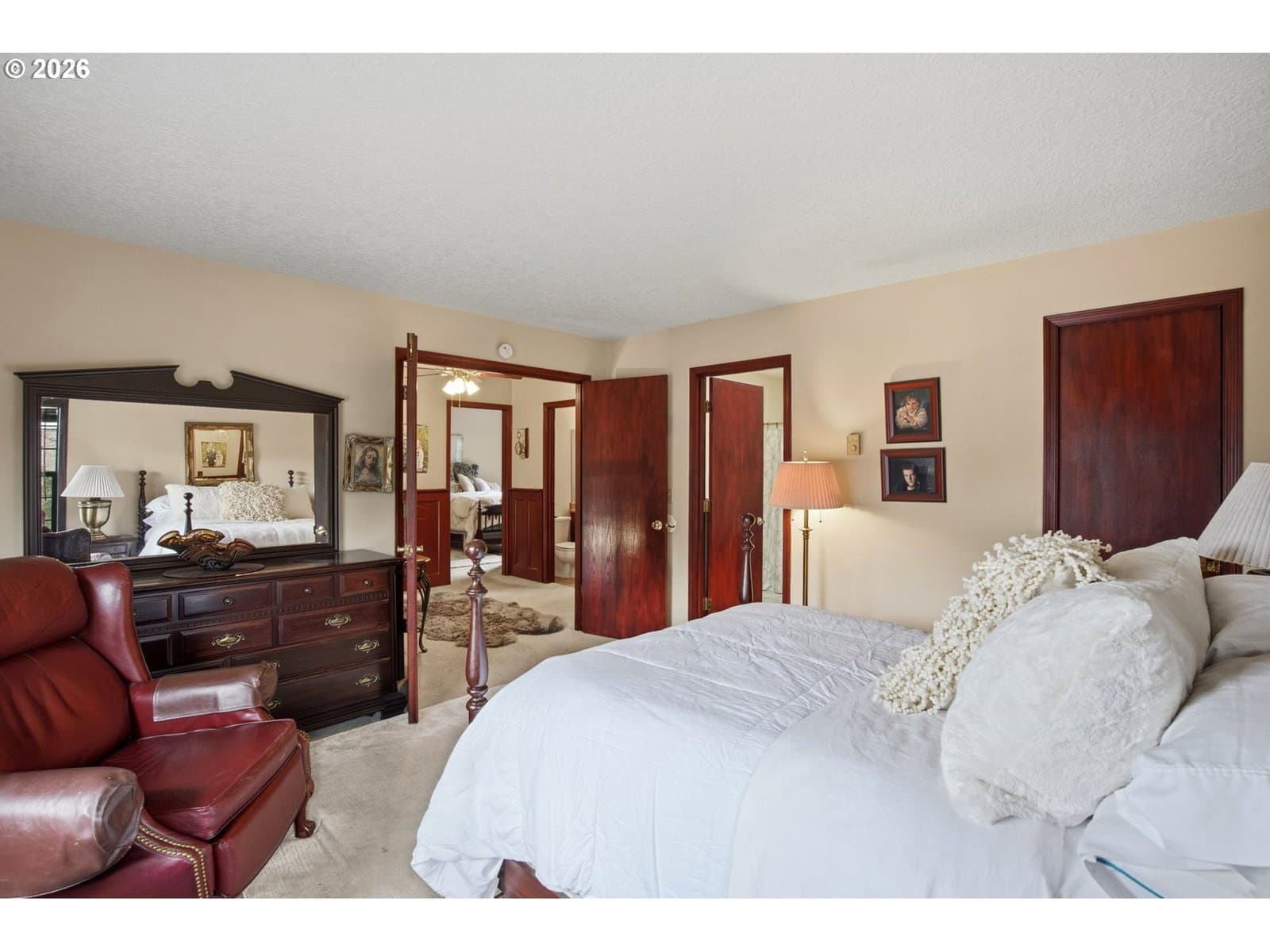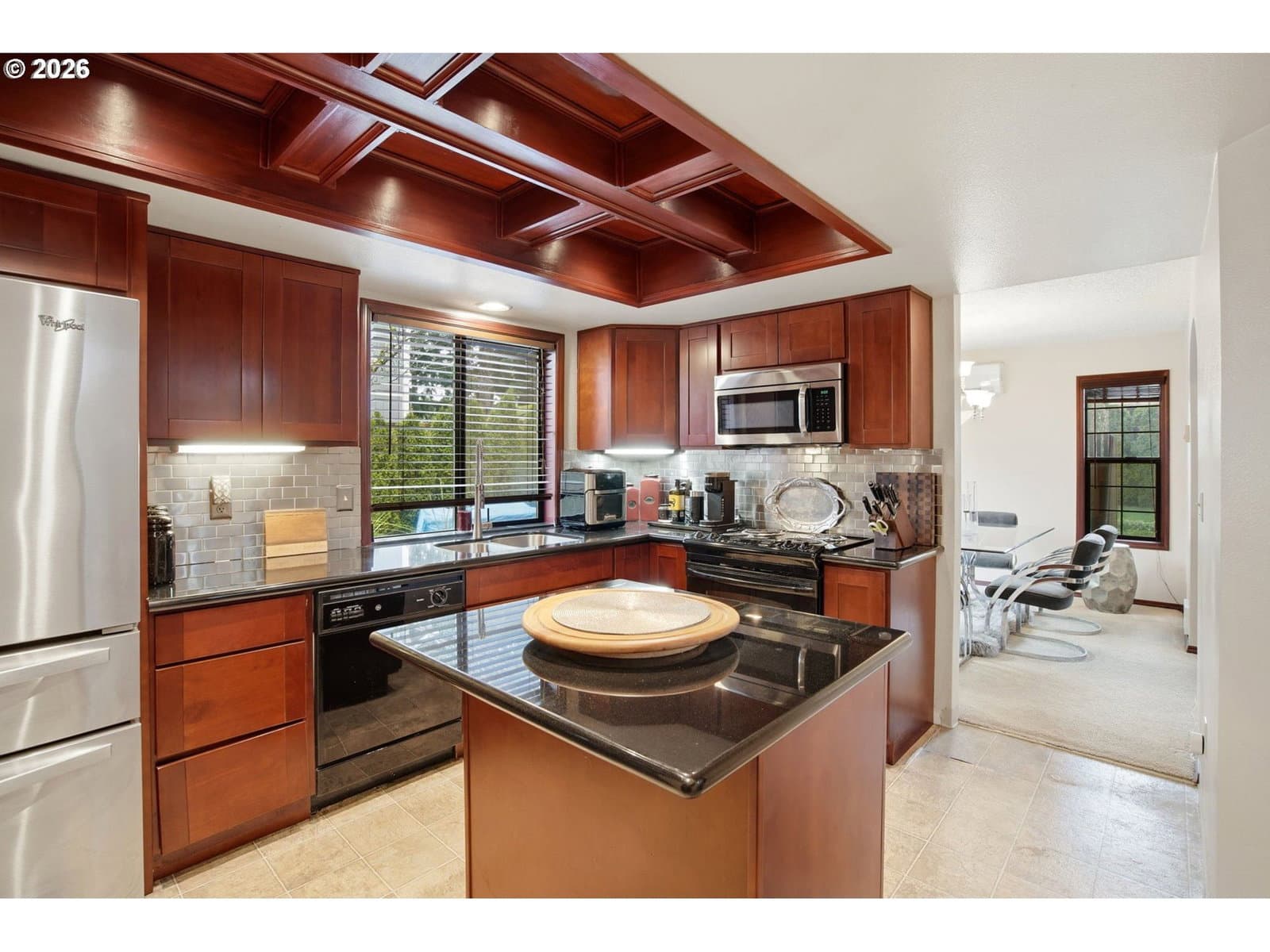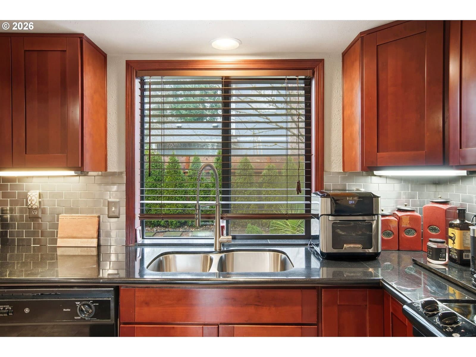 Beautiful home on corner lot, just 1 block from Bella Vista Park! Enter to the rich, cherry finish, wainscoting throughout entry, stairwell and carried into kitchen with coiffured ceiling. Shaker style, solid cherry cabinets. Granite countertops and great window above sink, overlooking private back yard. Dining room with French Doors, lead you to spacious, paver outdoor patio. Visualize yourself cozied up to the floor to ceiling, brick, wood burning fireplace, in sunken living room, with a glass of wine and a good book! Upstairs hosts a landing, overlooking grand entry. Primary en suite w/ large walk-in closet. So much to love about this enchanting home! Minutes to SE Side restaurants, shopping and PDX! Don't miss this one!