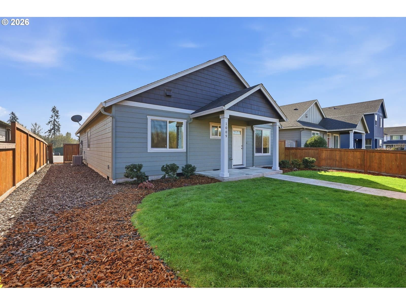 Skillfully crafted modern two-bedroom home with a spacious office and two baths sets a higher standard with its thoughtful design and elevated finishes throughout. A dramatic vaulted ceiling crowns the open-concept living room, creating an airy, light-filled environment that feels both expansive and warmly inviting. At the heart of the home, the kitchen is designed to impress and perform. Featuring a gas range, sleek stainless-steel appliances, a pantry, abundant counter and cabinet space, it seamlessly supports both everyday living and effortless entertaining. The primary suite offers a generous walk-in closet and a well-appointed bath with tile flooring. A dedicated laundry room adds convenience with tile floors, shelving, and a washer and dryer included. Stylish laminate flooring flows throughout the main living areas, delivering a refined aesthetic paired with easy maintenance. Plush carpeting in the bedrooms and office enhances comfort. Forced air heating and efficient air conditioning provide dependable year-round comfort in every season. Step outside to a covered back patio and fully fenced yard with gated access, a private and practical extension of the living space, perfect for relaxing or entertaining. Ideally positioned on a quiet dead-end street, this low-maintenance property is exceptional. Enjoy being within half a mile of the Battle Ground Farmers Market, Fairgrounds Park, Al & Ernie's Bakery & Cafe, and the Battle Ground Community Center — placing local favorites and community amenities just moments from your doorstep. Whether you are purchasing your first home or seeking to downsize without compromising style or convenience, this property delivers modern comfort, quality craftsmanship, standout features, an unbeatable location — and the added benefit of no HOA.