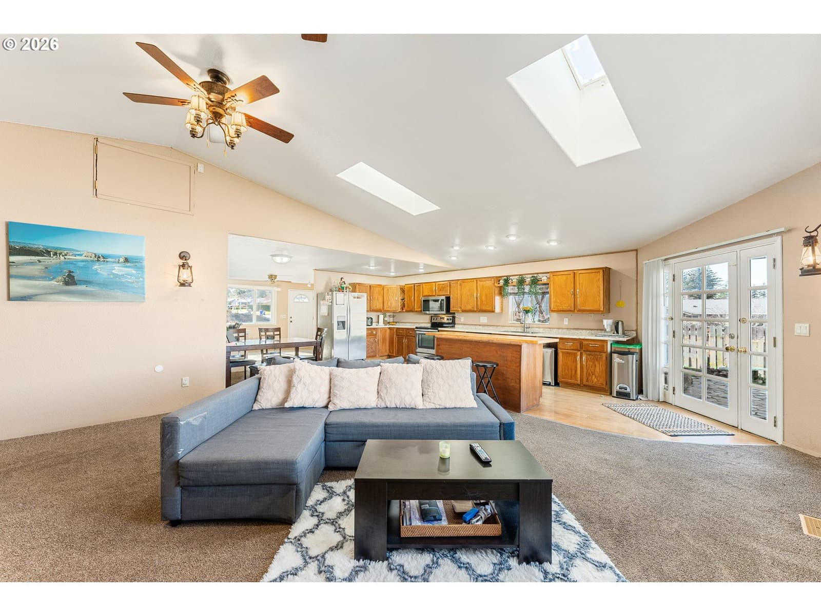 Charming one-level ranch on a spacious corner lot in Gresham! This 4-bedroom, 2-bath home offers a functional layout with nearly 2,000 sq ft of living space. The kitchen features stainless steel appliances, a freestanding range, built-in microwave, island, and durable vinyl flooring, with French doors that open to the backyard—perfect for indoor-outdoor living. Multiple living areas include a family room with vaulted ceilings and skylights, plus three fireplaces for added character and comfort. The bonus room is a great home office or media room. Enjoy the fully fenced yard with garden space and fire pit—an ideal spot to relax year-round. Convenient RV/boat parking, outbuildings for storage, and accessible one-level living complete the package. Easy access to local amenities, schools, and major routes.