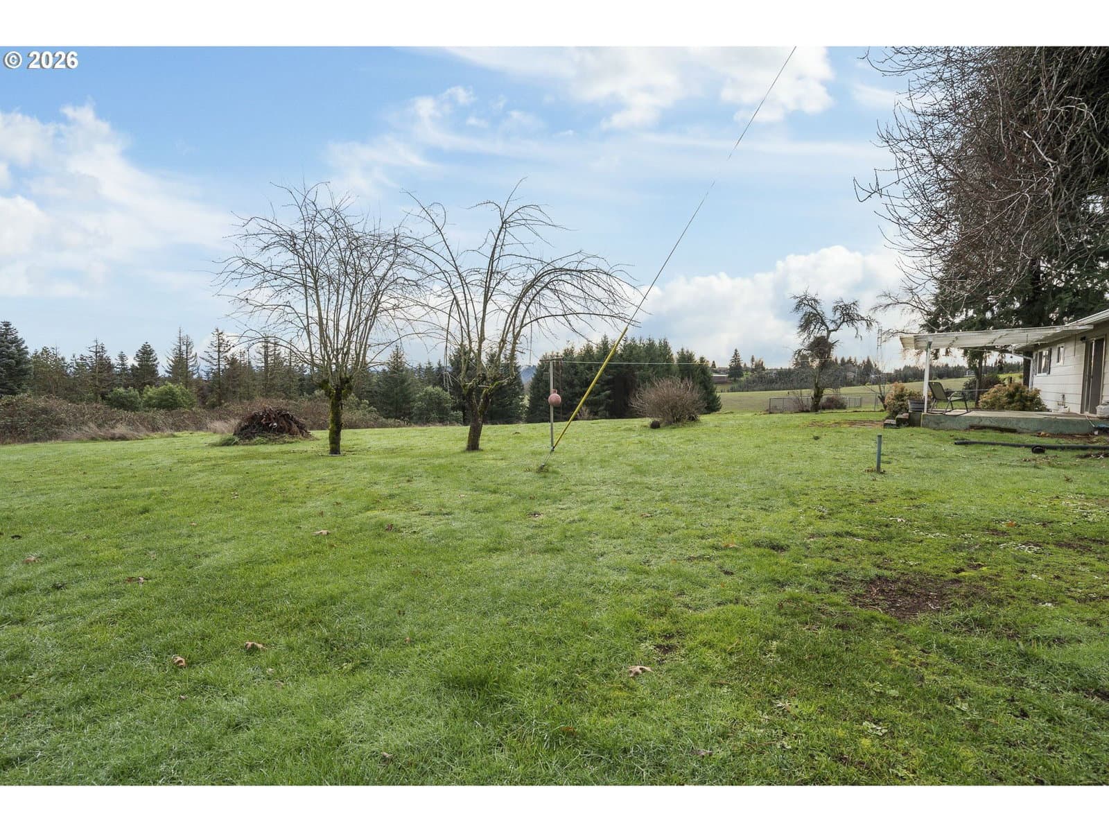 One-level country living on prime mountain-view acreage just minutes from town with four-car garage parking and a shop/barn with stalls. Inside: Welcoming living room with brick hearth and pellet stove opens to a kitchen/dining combo space with a covered back patio, perfect for outdoor entertaining with a scenic backdrop. The kitchen is peninsula-style with stainless oven/range and black dishwasher. Still plumbed for drop-in range, if preferred. Forced-air heat and double-pane vinyl windows assure your comfort in any season. Attached garage space combined comprises 1,056 square feet. Convert one garage to add 500 sf additional living space for a rainy day play room, home gym or family room-- so much potential -- or retain it to park all your toys and extra vehicles. Bedroom floors are oak. The house is well away from the road and backs to a former Christmas Tree farm, making it both private and peaceful, and the terrain is level enough for horses and livestock or extensive gardens. This is your chance to own Sherwood acreage affordably!