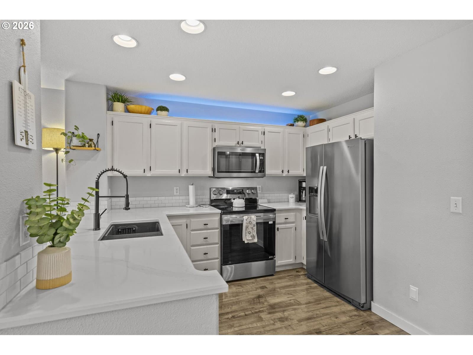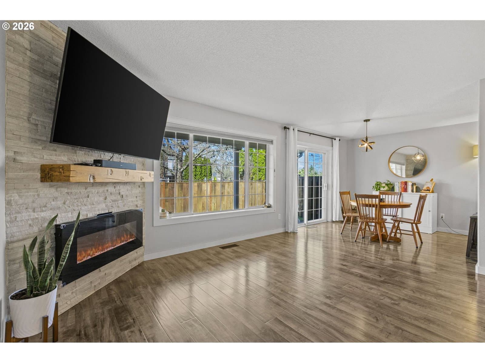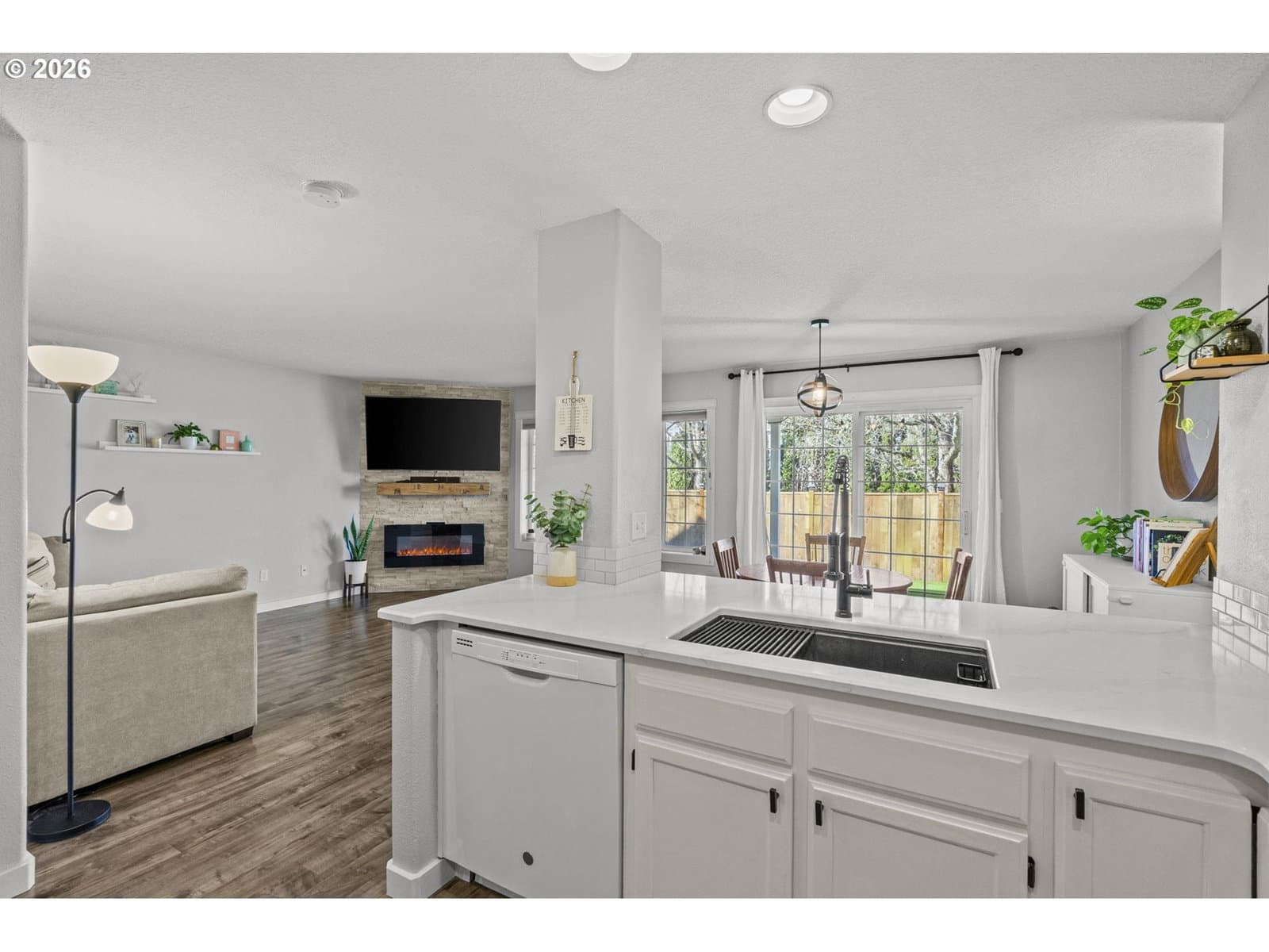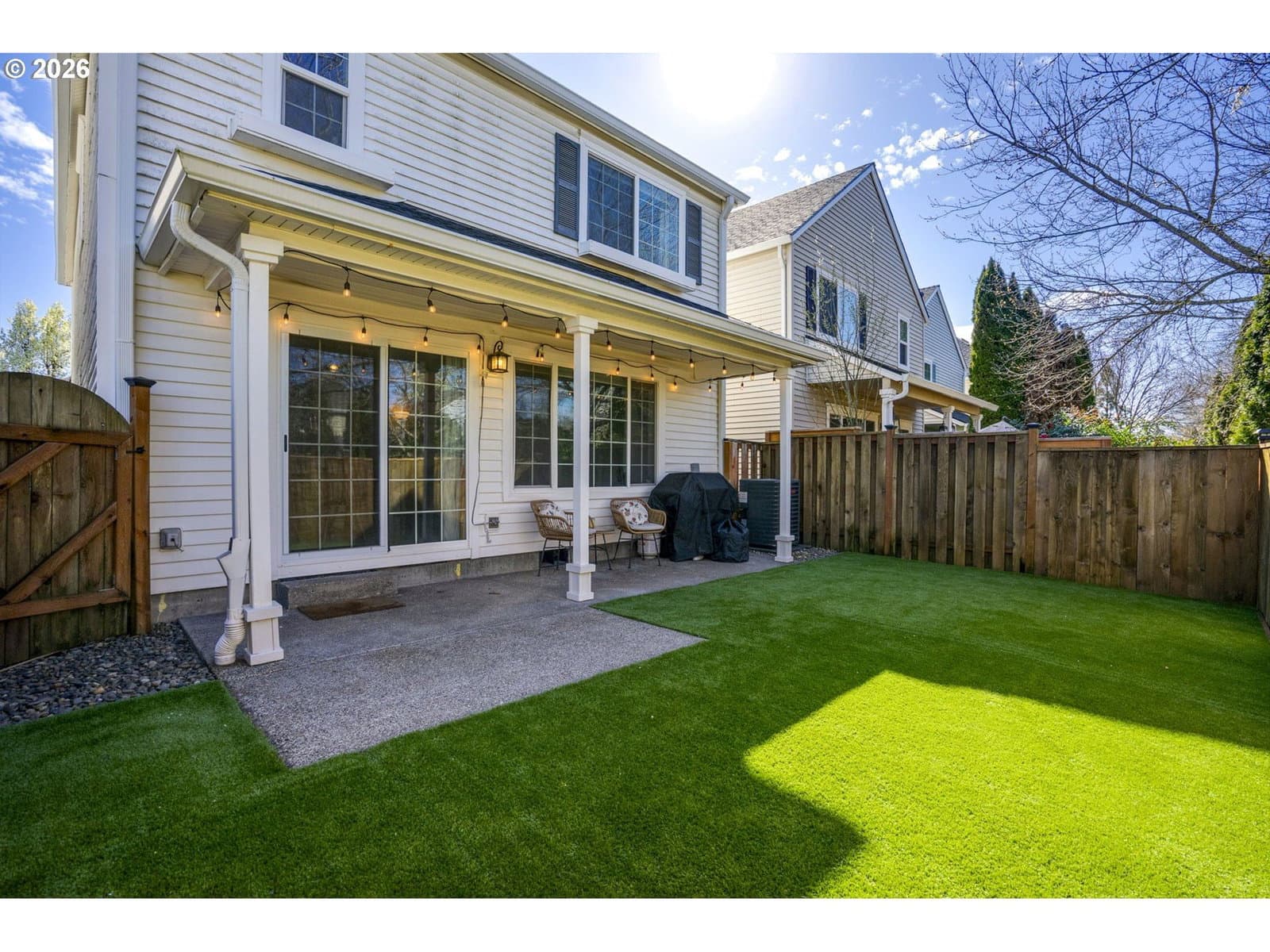 Wonderful home with SO MANY UPDATES! New ROOF and GUTTERS installed 2023. NEW A/C UNIT and FURNACE installed 2024. Gorgeous kitchen updates include quartz countertops and backsplash, new stove, microwave, undermount sink and faucet. Stainless steel appliances. Quartz eat bar great for conversations during meal prep, and a place for work/homework. Great laminate flooring on main, electric fireplace, and glass sliding door from dining room to backyard. Backyard features covered patio, NEW PRIVACY FENCE, river-rock walkways, and NEW TURF LAWN--looks so good! Perfect for outdoor fun with low maintenance. Upstairs has large primary suite with new ceiling fan, and updates in bathroom. Garage has built-in storage. GREAT LOCATION--park with playground and gazebo just steps from your door. Close to schools, shopping. TOO MUCH TO MENTION! A must see!