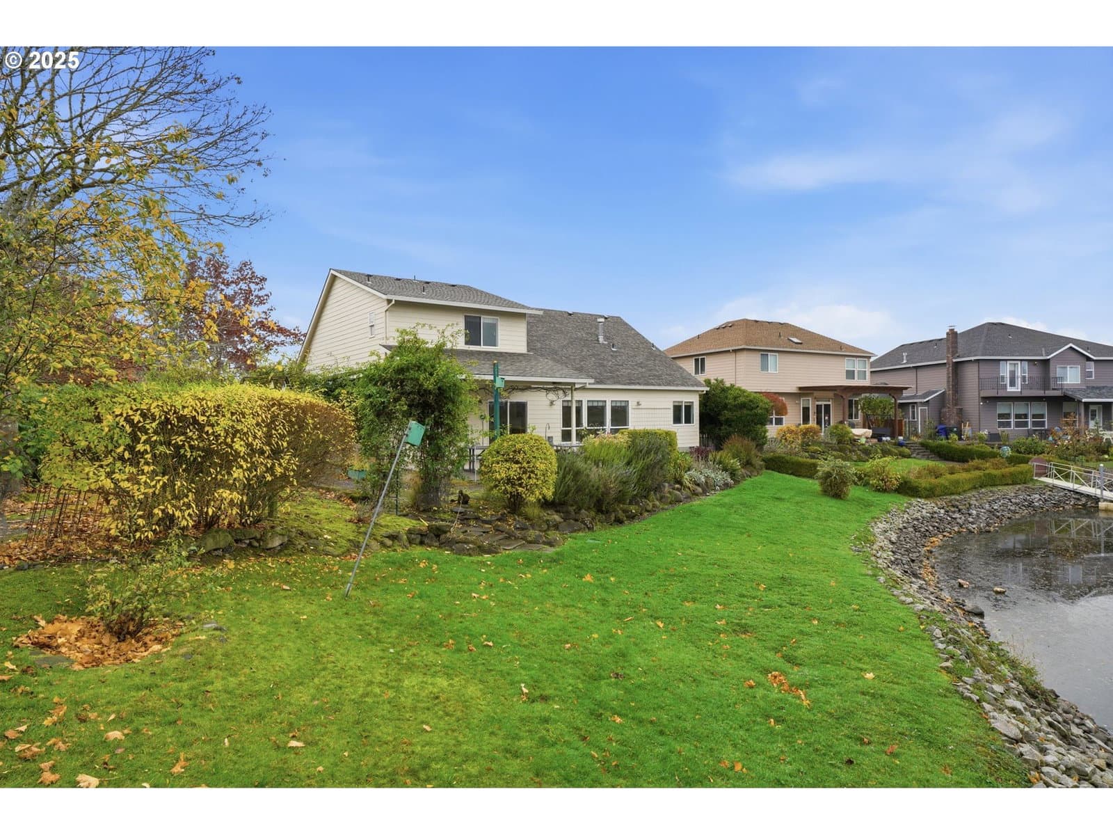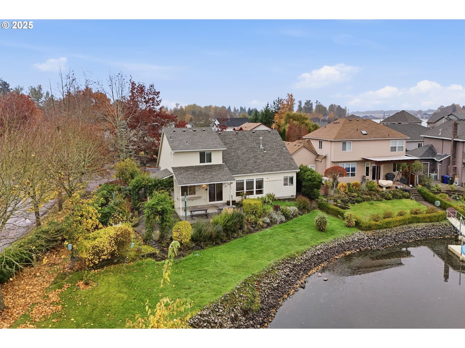 Serene lakeside living! Welcome to your private retreat on Fairview Lake, where nature, light, and thoughtful design come together in perfect harmony. This custom-built home rests on a .26 acre corner lot with a 140 feet of lake frontage, surrounded by lush landscaping, fruit trees, and peaceful water views. Inside, warmth and craftsmanship define every detail. The main level offers true single level living with a primary suite featuring a jetted tub and walk-in closet, a dedicated office with built-ins, and laundry room equipped with washer and dryer. Hardwood and tile floors flow throughout the great room layout, where a gas fireplace anchors the space and expansive windows frame the ever-changing beauty of the lake. The island kitchen is as functional as it is beautiful, complete with double ovens, a gas cooktop, pantry, and stainless steel appliances - perfect for everyday living or entertaining with ease. Just beyond, the covered patio invites you to enjoy quiet mornings or golden-hour sunsets reflected on the water’s surface, often accompanied by visits from ducks, herons, and other wildlife that make Fairview Lake their home. Upstairs, you’ll find two spacious bedrooms and a full bath, ideal for guests, hobbies, or relaxation. With 2,196 square feet of living space, this home blends openness and comfort, offering room to breathe while remaining intimately connected to its natural surroundings. Located in Lake Shores Estates, just minutes from Blue Lake Regional Park, Salish Ponds Trail, downtown Fairview, and I-84, this property offers the rare balance of privacy and accessibility - where lakefront tranquility meets everyday convenience.Discover a home that feels more like a sanctuary - beautifully built, gracefully lived in, and ready for its next chapter.