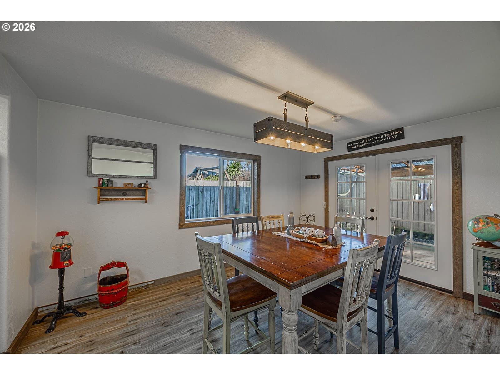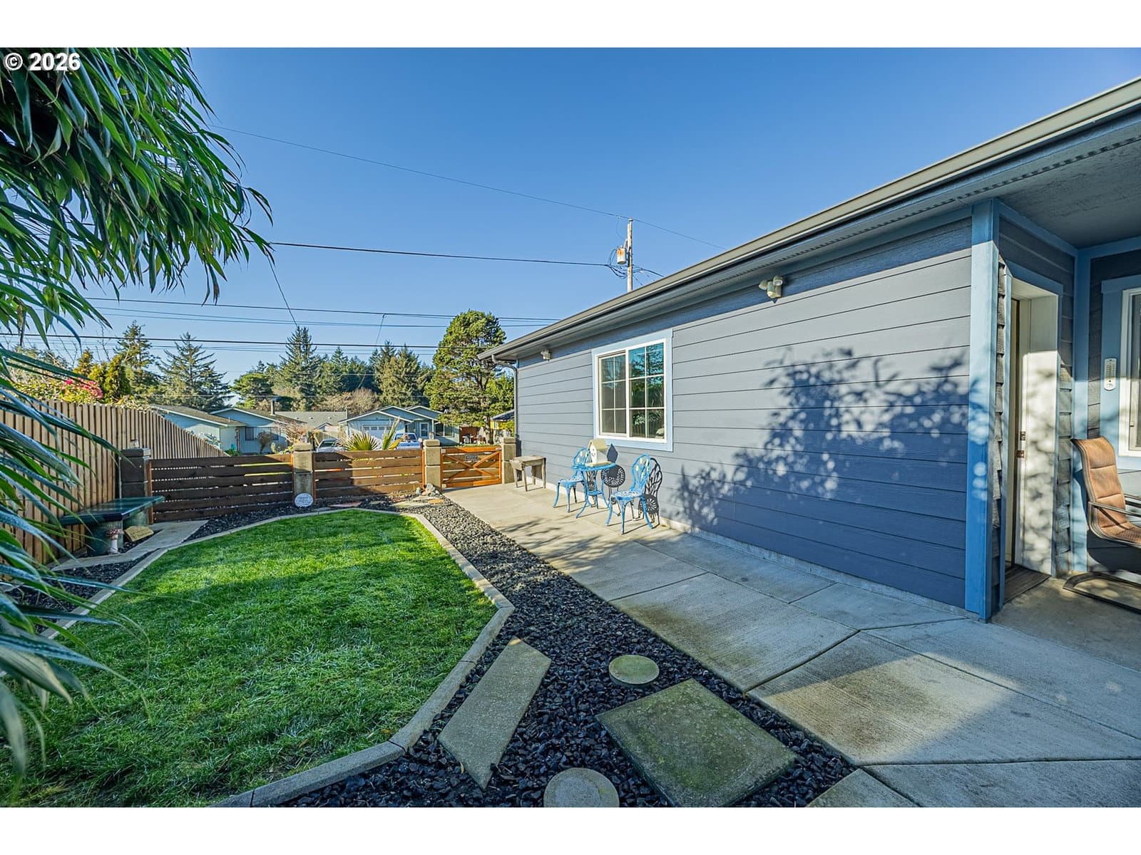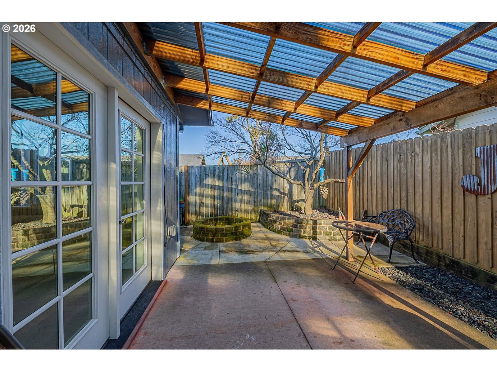 Impeccably remodeled with a rustic flair, this 3 bedroom/2 full bath single-level home is clean and move-in ready! Improvements include new flooring throughout, new vinyl double pane windows, updated lighting, and thoughtfully designed concrete shower surrounds & vanities. Spacious kitchen features custom concrete countertops, stainless steel appliances, pantry, and bright, inset lighting. Overall layout flows intuitively from entrance through main living space to large primary bedroom with attached en suite bath. Dedicated dining room with French doors opens onto an outdoor patio, ideal for indoor-outdoor living. Low maintenance exterior features covered patio with fire pit and hot tub, two outbuildings, terraced garden boxes and newly poured custom-concrete driveway. Exterior improvements include new roof, gutters, garage door, and fresh paint—too many improvements to list! Contact your Realtor to schedule a showing of this beautiful, turn-key home!