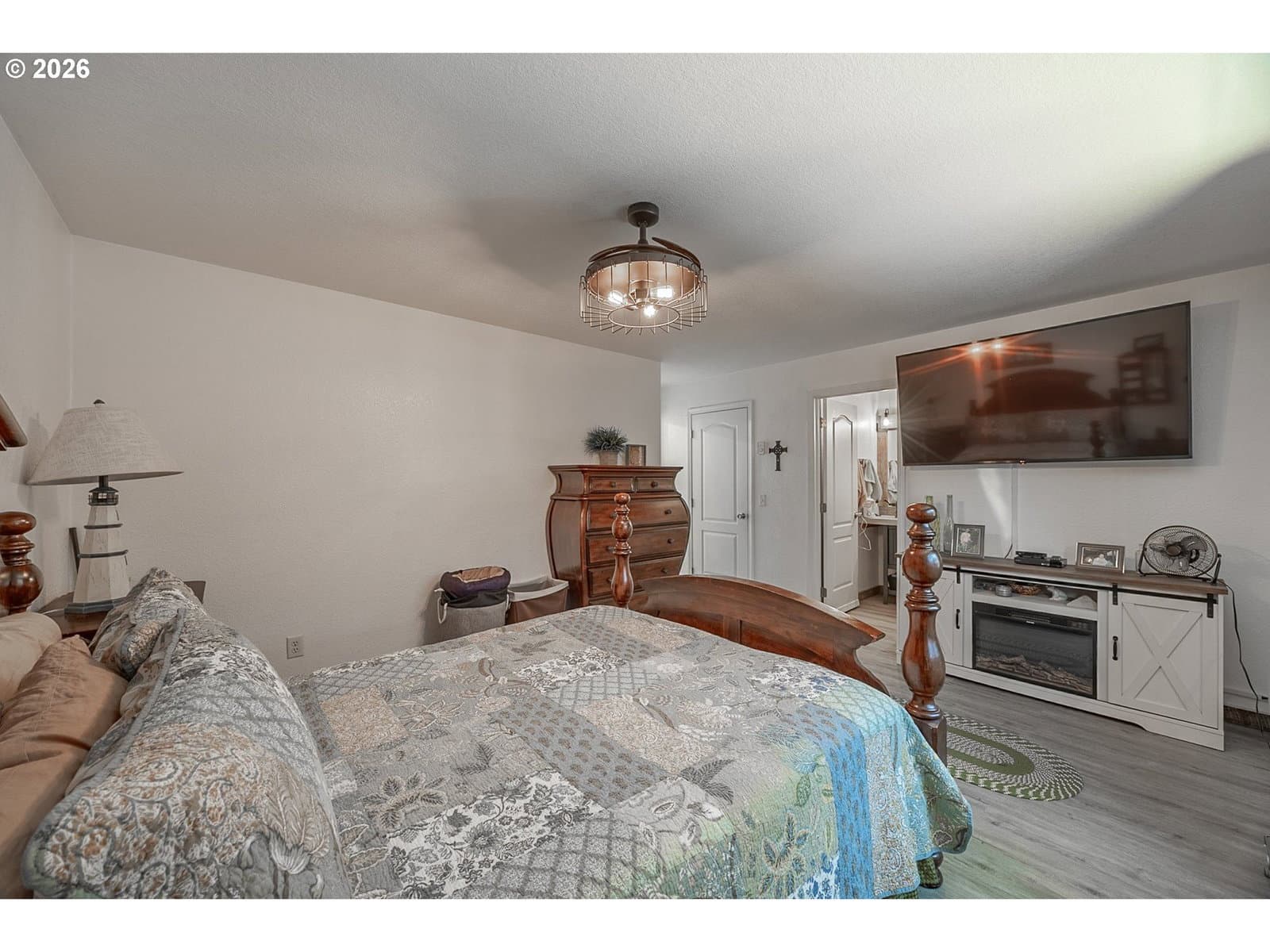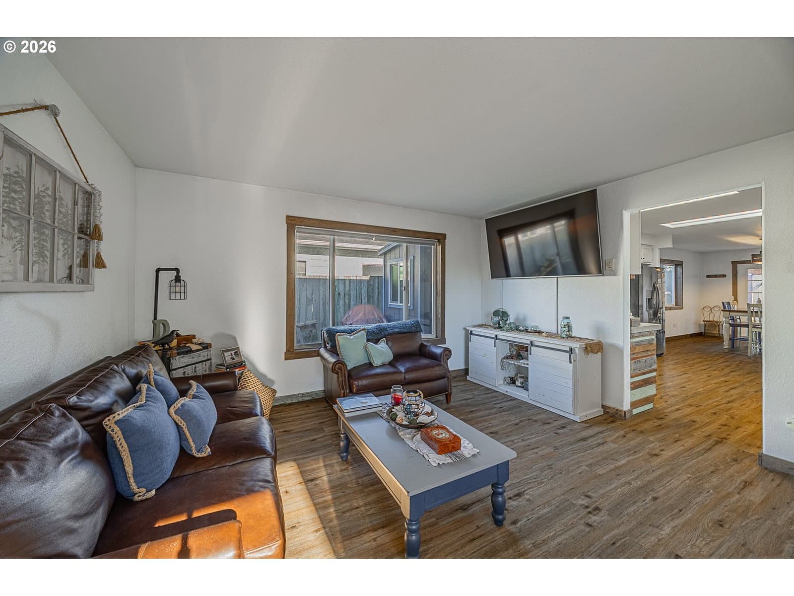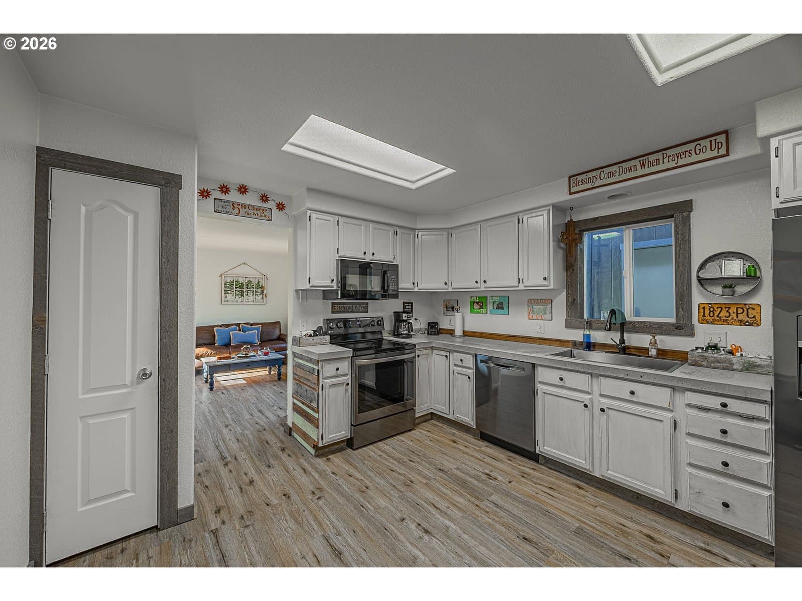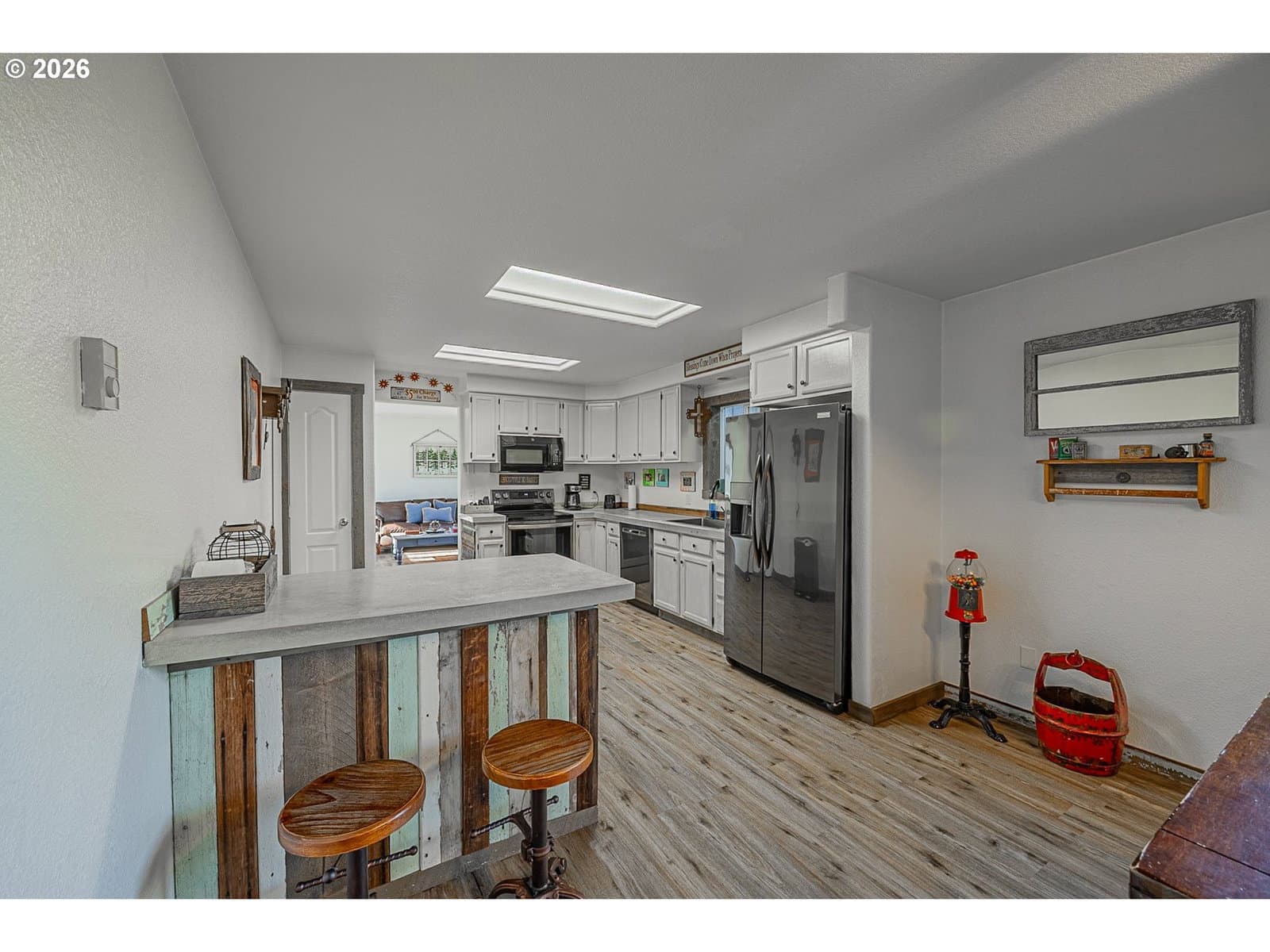 Impeccably remodeled with a rustic flair, this 3 bedroom/2 full bath single-level home is clean and move-in ready! Improvements include new flooring throughout, new vinyl double pane windows, updated lighting, and thoughtfully designed concrete shower surrounds & vanities. Spacious kitchen features custom concrete countertops, stainless steel appliances, pantry, and bright, inset lighting. Overall layout flows intuitively from entrance through main living space to large primary bedroom with attached en suite bath. Dedicated dining room with French doors opens onto an outdoor patio, ideal for indoor-outdoor living. Low maintenance exterior features covered patio with fire pit and hot tub, two outbuildings, terraced garden boxes and newly poured custom-concrete driveway. Exterior improvements include new roof, gutters, garage door, and fresh paint—too many improvements to list! Contact your Realtor to schedule a showing of this beautiful, turn-key home!