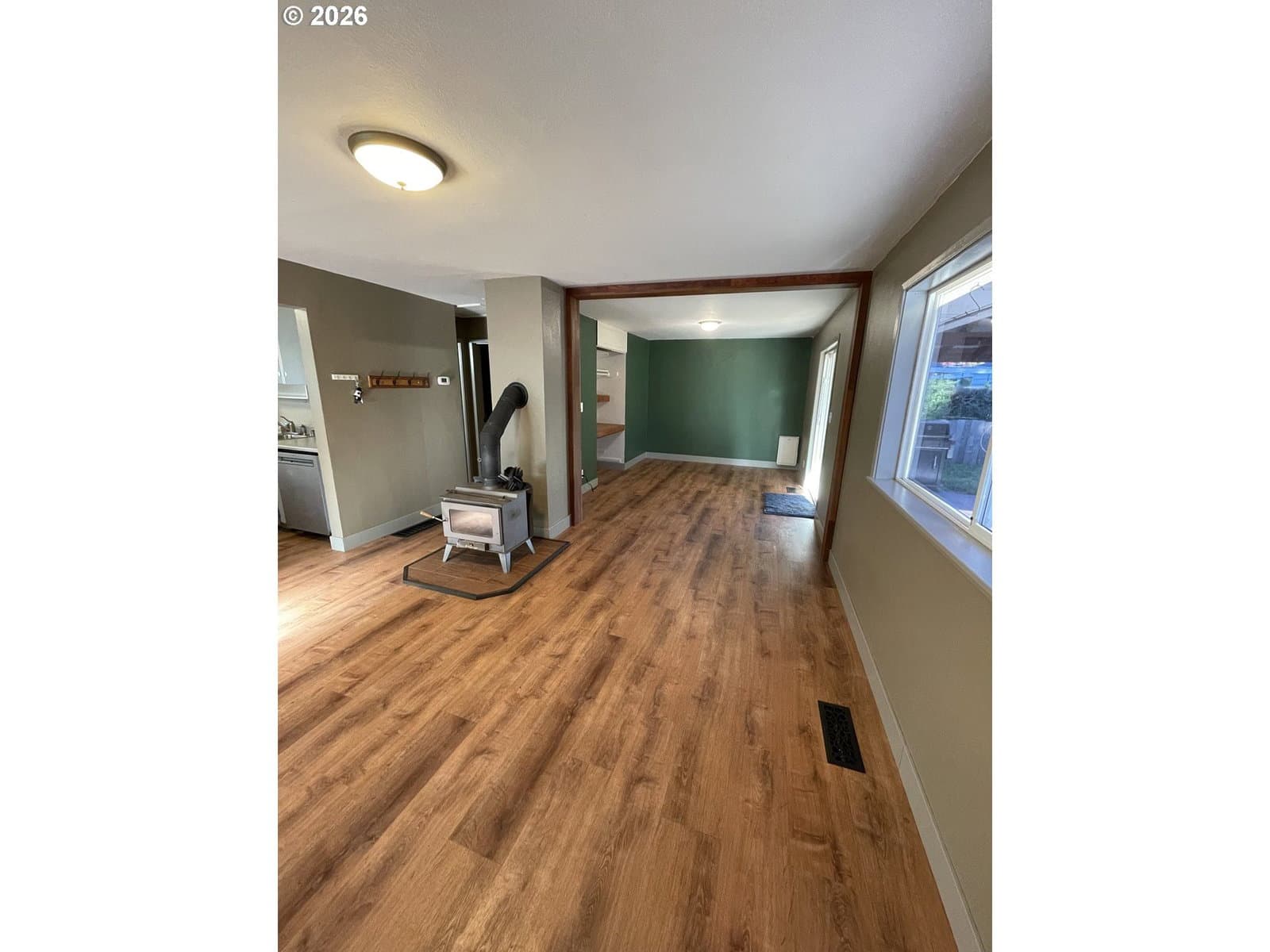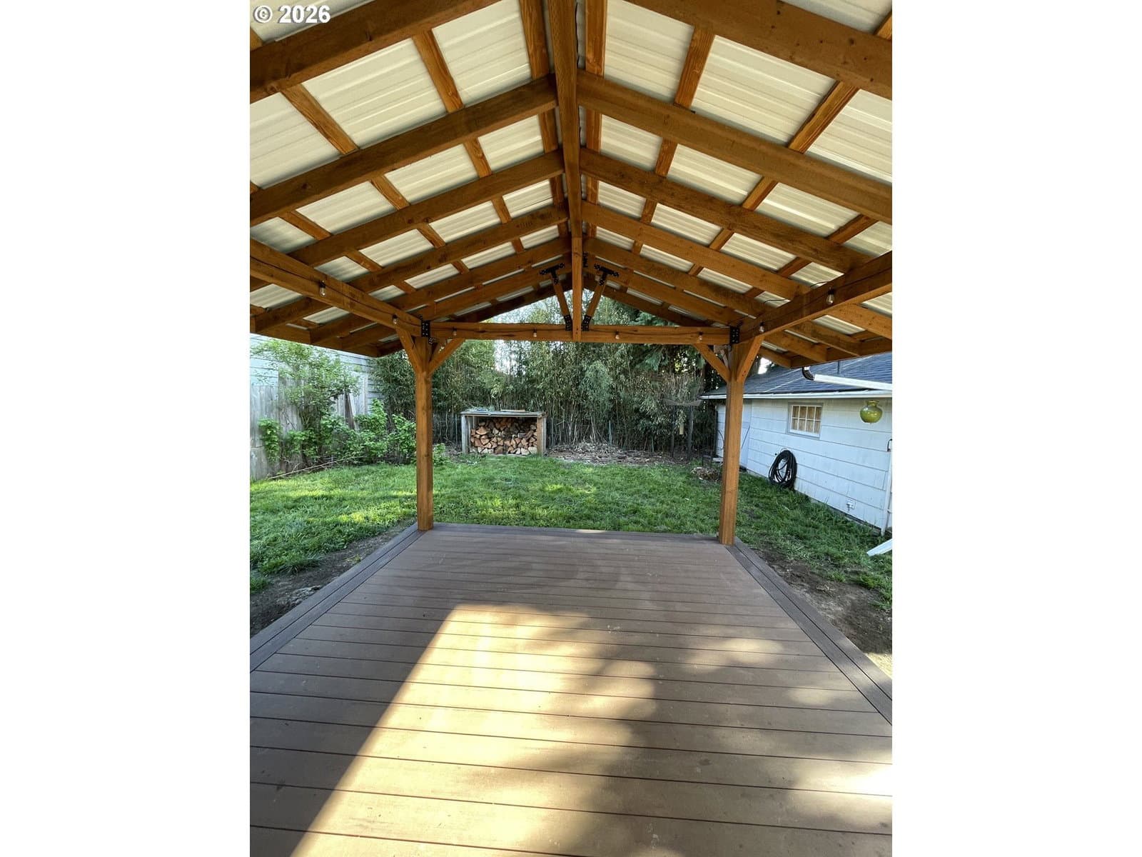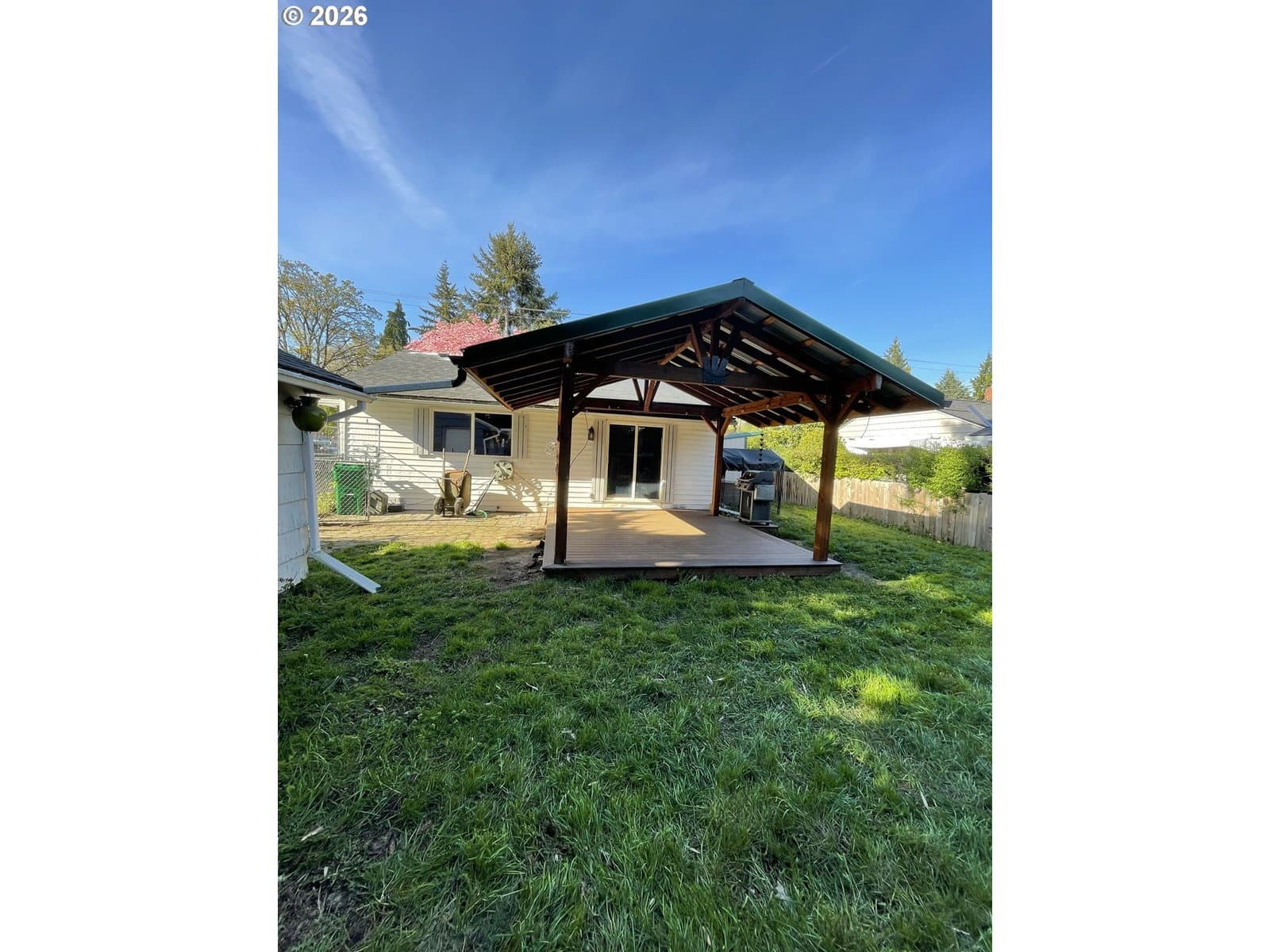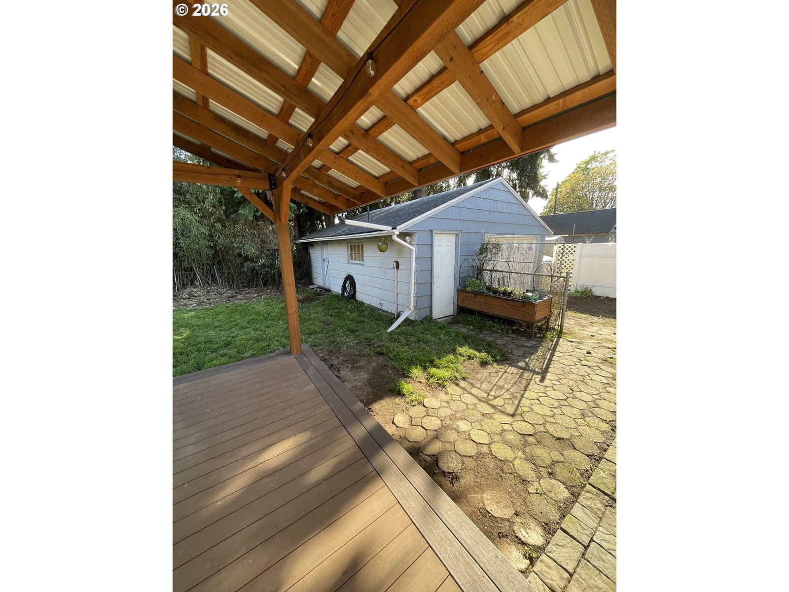 Charming and well-maintained what was once a 2-bedroom and is now a 1-bedroom, 1-bath home with solid construction and thoughtful updates throughout. Seller changed the floor plan layout by increasing the space for the living room area by taking down the wall between the living room and the 2nd bedroom. Easy project to put a wall back if 2 bedrooms are needed. Features include a heat pump with A/C, refinished hardwood floors, and updated windows for improved comfort and efficiency. The fully fenced yard offers privacy and functionality, complete with a garden area in the backyard featuring raspberries, blueberries, and raised vegetable garden in the front. The garage provides versatile space—one side functions as a 1-car garage with a new door and opener, while the other includes a laundry area, partial bath, and additional storage. All appliances are included, making this home move-in ready. 2015 new electrical panel... 2021 new water heater... 2021 new roof on home and garage... 2021 Plumbing, re-piped & new water main... Cold and hot water to the garage with utility sink... 2024 new life proof flooring throughout... 2025 new LG refrigerator... 2025 new Dishwasher... 2025 Chimney inspection and cleaning & Chimney has stainless steel liner... 2026 new electrical sub panel... Custom built 6x6 garden shed... Custom built timber teck deck & patio cover... Garage has 120 and 240 power... Garage has additional working toilet... Heat pump & forced air.
