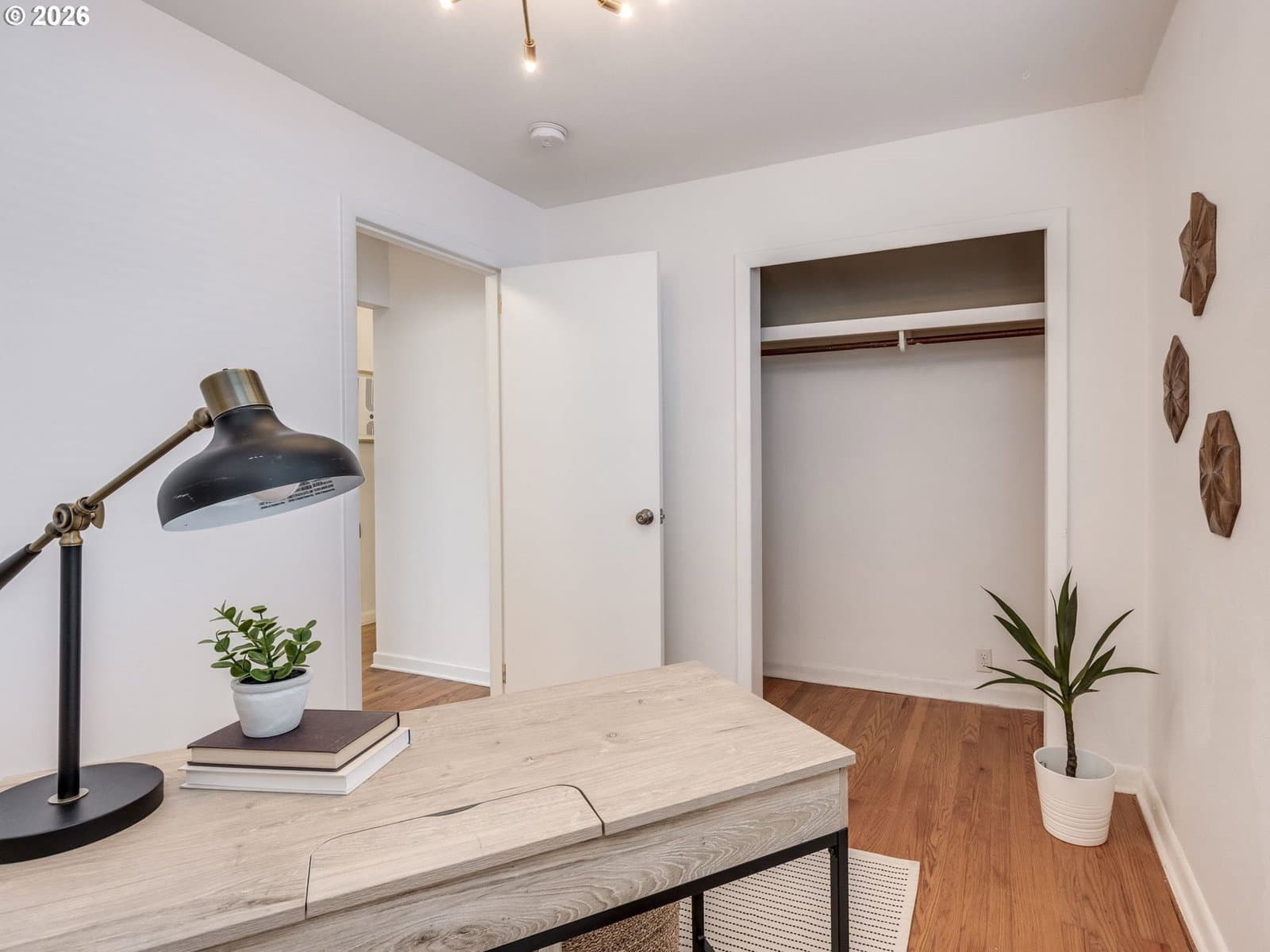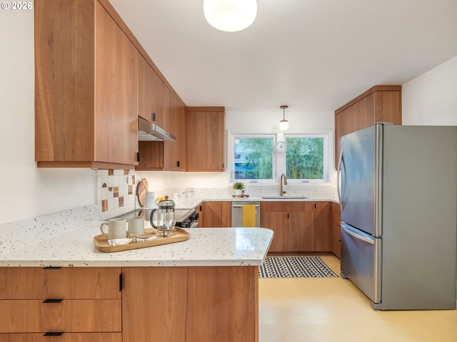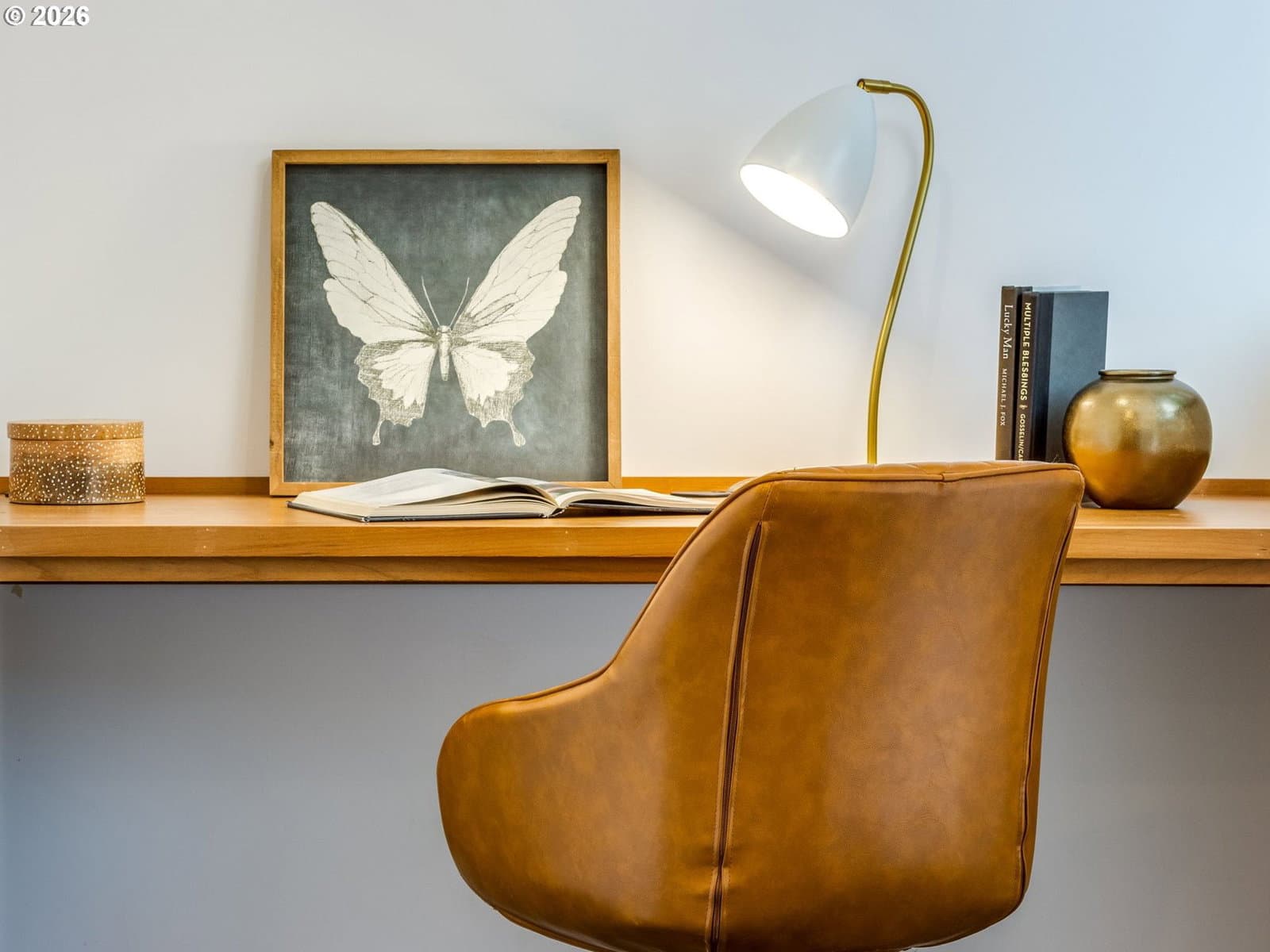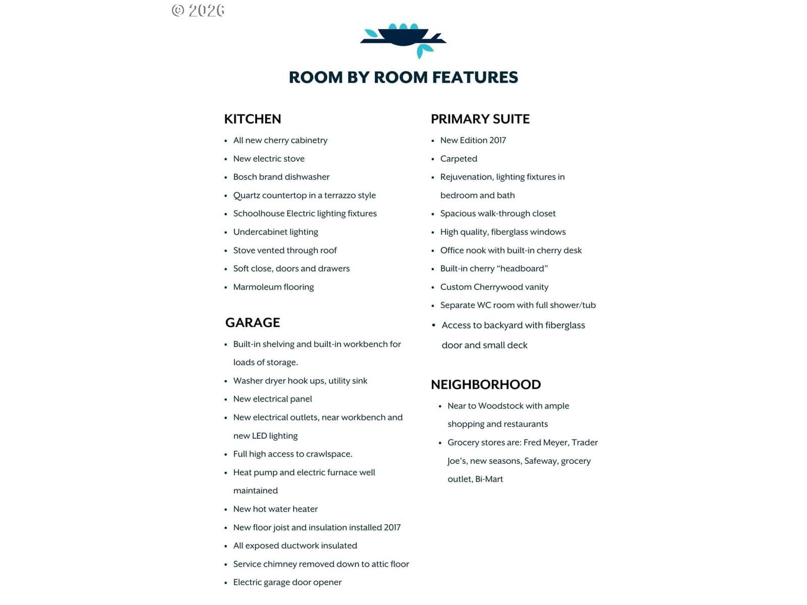 This quintessential 1950s cottage is seamlessly blended with an Architect-designed primary suite addition and gorgeously remodeled kitchen. It is an iconic example of the era with a supremely cozy and efficient layout, deep eaves protecting the original cedar-shake siding, and an attached single-car garage loaded with built-in shelving ready for projects and storage. The large primary bedroom was added in 2017 with cherrywood accents, harkening back to the area's days as a cherry orchard, custom floating vanity in the new en-suite full bath, a walk-in closet, and a built-in office nook providing maximum flexibility. The eye-popping kitchen was reimagined in 2023 in a style that nods to the era with color choices and materials but lives fully modern with loads of storage and ample prep space. The two additional bedrooms provide opportunities and options to fit your lifestyle. The bedrooms and kitchen all have updated, energy-efficient windows. A newer roof, new driveway, insulation in the walls, floors and attic, a recent electrical panel upgrade, and an energy efficient heat pump furnace system are just some of the thoughtful upgrades awaiting the new inhabitants of this fantastic home! [Home Energy Score = 7. HES Report at https://rpt.greenbuildingregistry.com/hes/OR10243392]