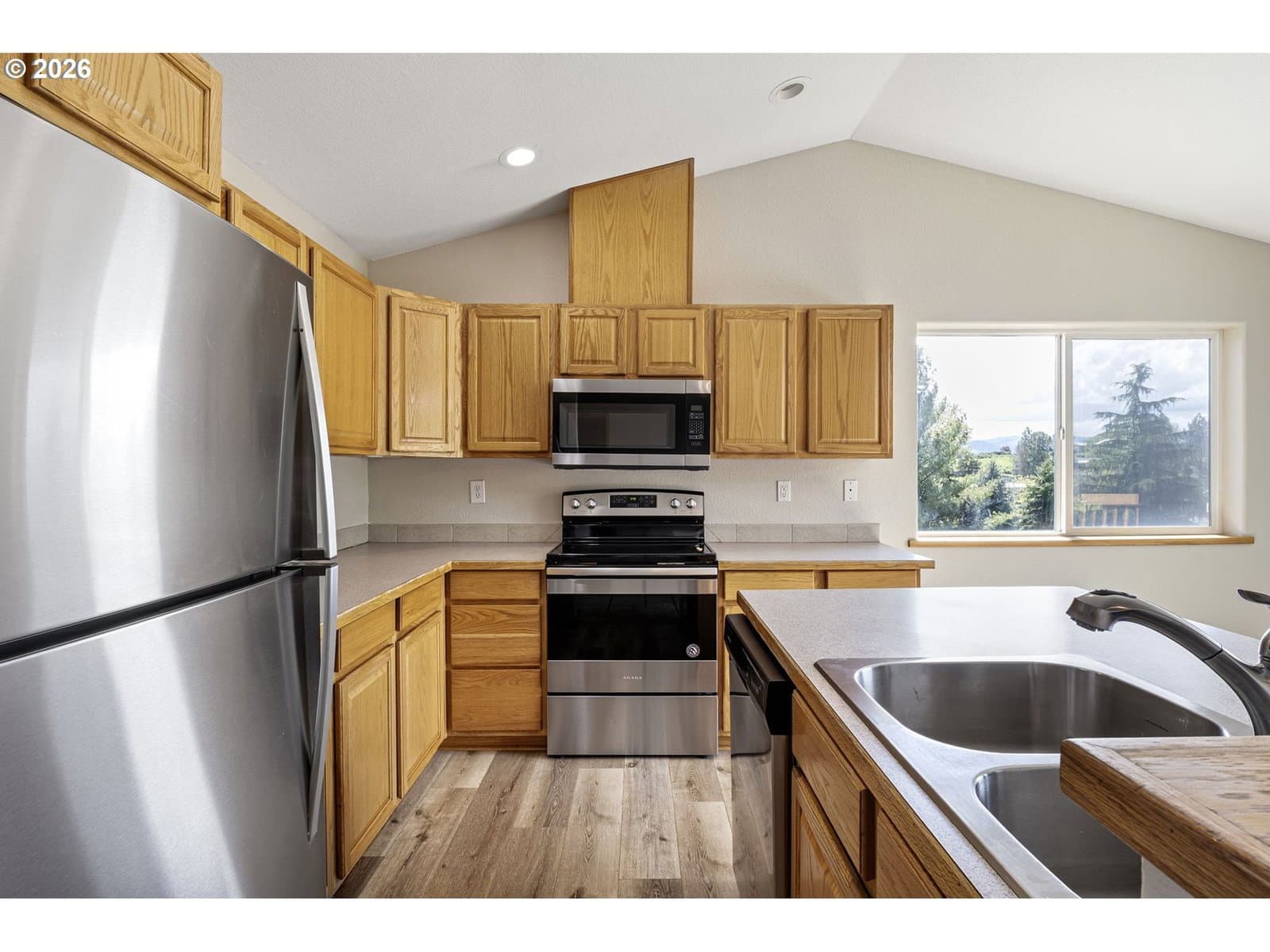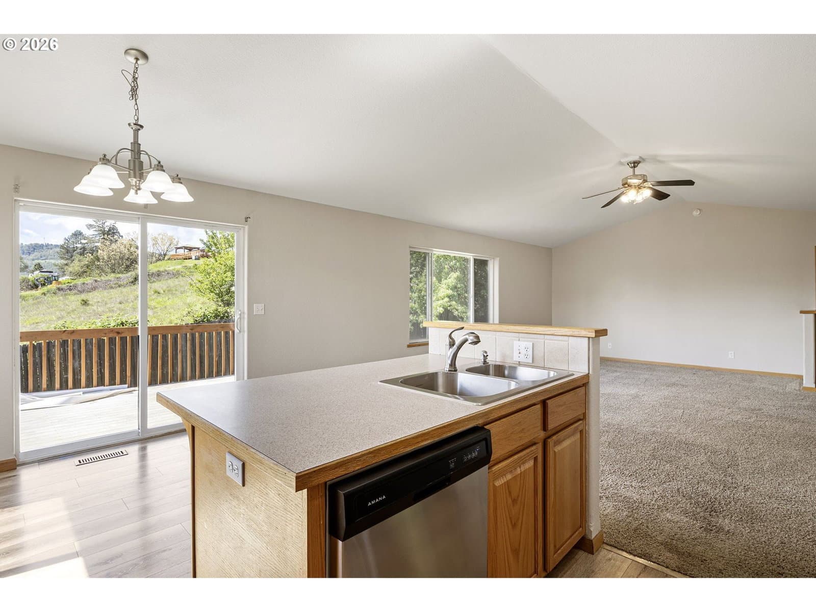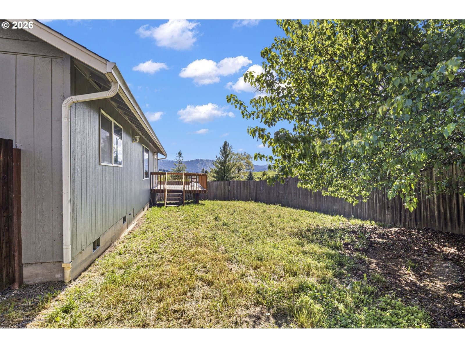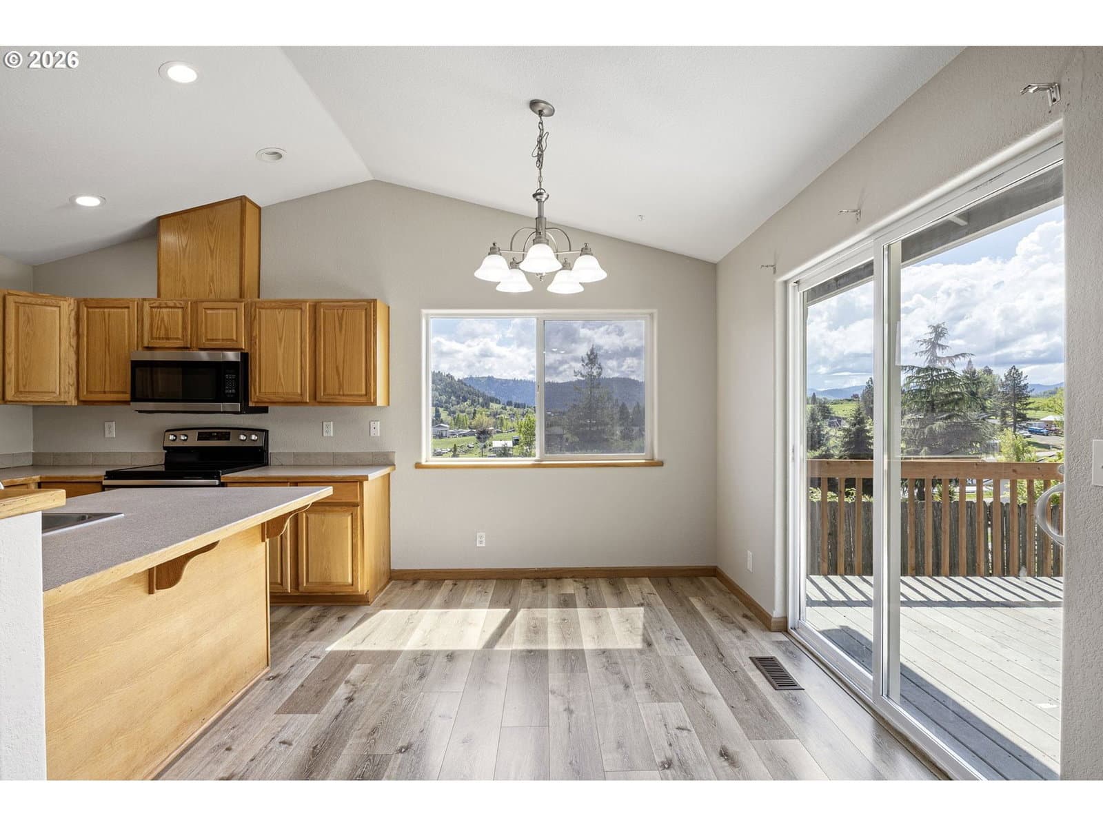 This property is a newer 3 bed 2 bath home that is move-in ready with fresh interior paint, newer flooring, and stainless steel appliances. Features a large primary bedroom with bathroom attached and a walk in closet. The open kitchen flows into to main living room that include desirable vaulted ceilings. You’ll find central heating and air conditioning throughout the home. An oversized laundry room adds convenience and is attached to a 2 car garage for ample storage. Just off of the kitchen there is a large sized deck in the backyard that has beautiful views which are great for both relaxing, hosting and entertainment.