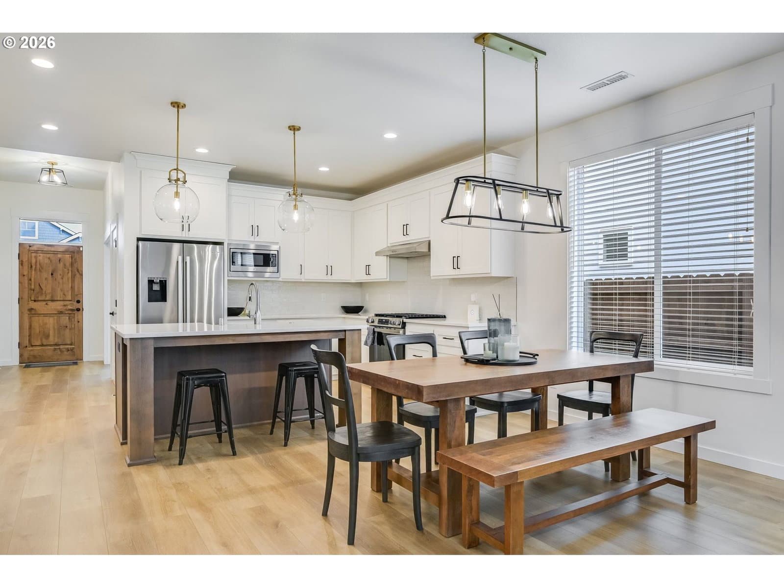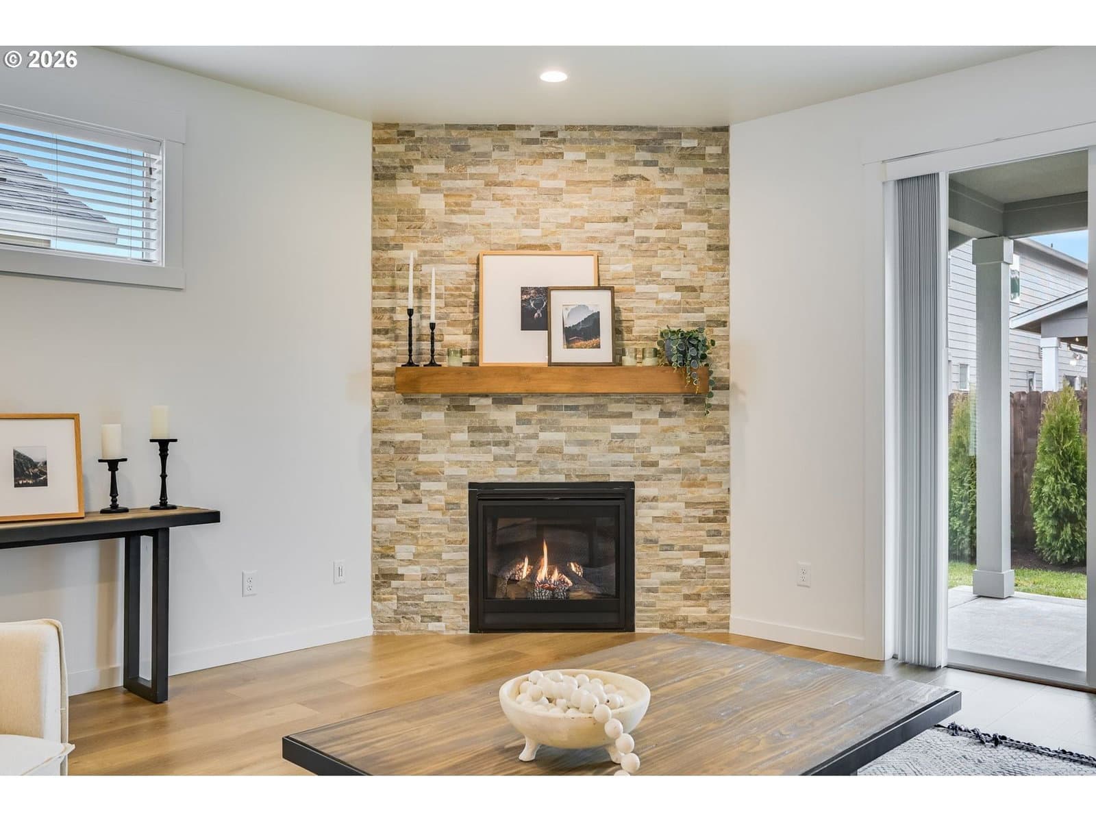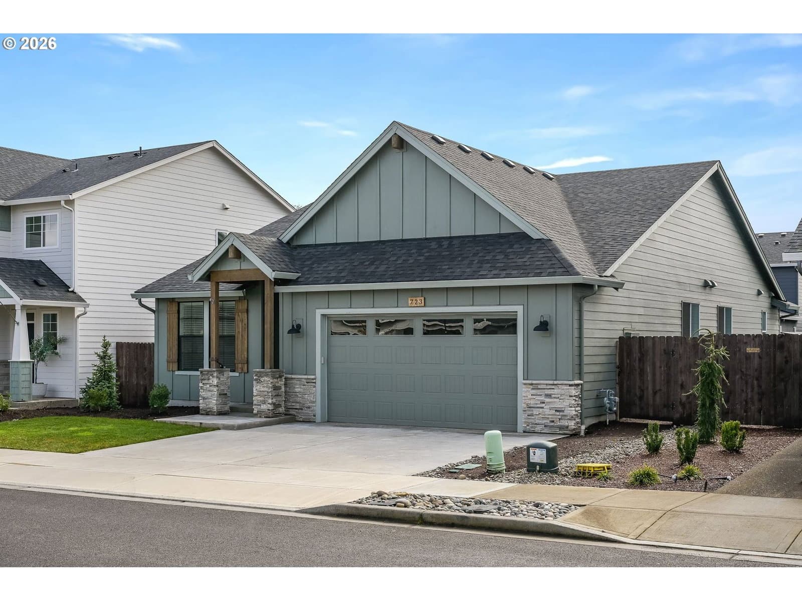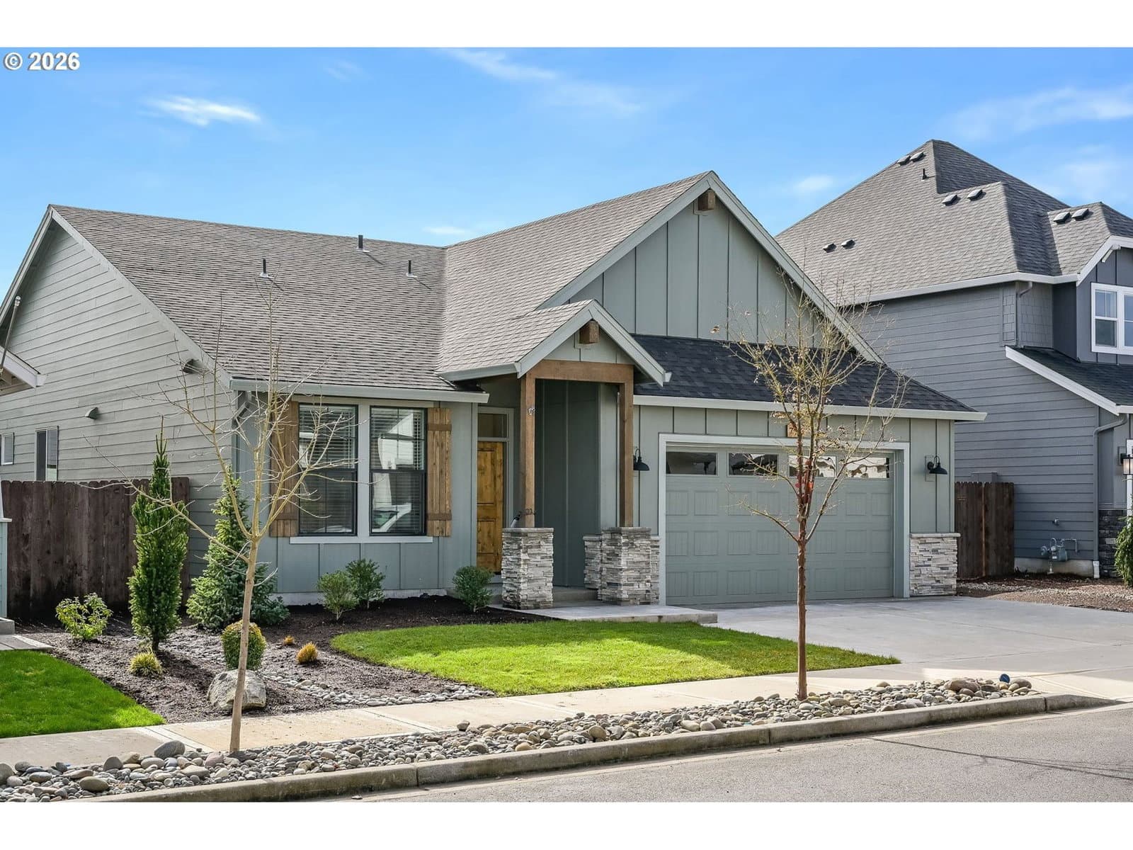 Designed for effortless one-level living, this modern farmhouse style, 2022-built Generation Homes property offers an elevated, low-maintenance lifestyle. The interior features gorgeous LVP flooring, brand new carpets, high ceilings, spacious rooms, and thoughtfully selected modern fixtures and finishes throughout. The open kitchen showcases sleek quartz countertops, full tile backsplash, stainless appliances, a brand new gas range, and an inviting kitchen island perfect for casual mornings or gathering with friends. The living room is anchored by a striking floor-to-ceiling stone gas fireplace and large wood mantel, creating a warm focal point. Sliding doors open to a large covered patio and fully fenced backyard with privacy trees. The spacious owner’s suite features a tray ceiling, plush carpet, and a spa-inspired ensuite with double sinks, tiled walk-in shower, and a large walk-in closet with wood shelving. A large laundry room with Samsung washer and dryer included completes this polished home where comfort, quality, and simplicity come together beautifully. A sprinkler system keeps upkeep minimal and low HOA dues include front landscaping – so you can spend less time on upkeep and more time enjoying life. Very lightly lived in and priced better than brand new construction! SELLER OFFERING TOWARDS CLOSING COSTS!