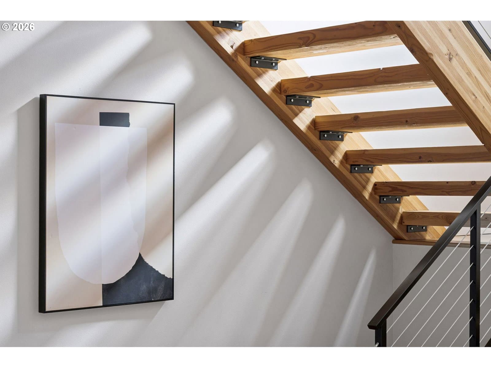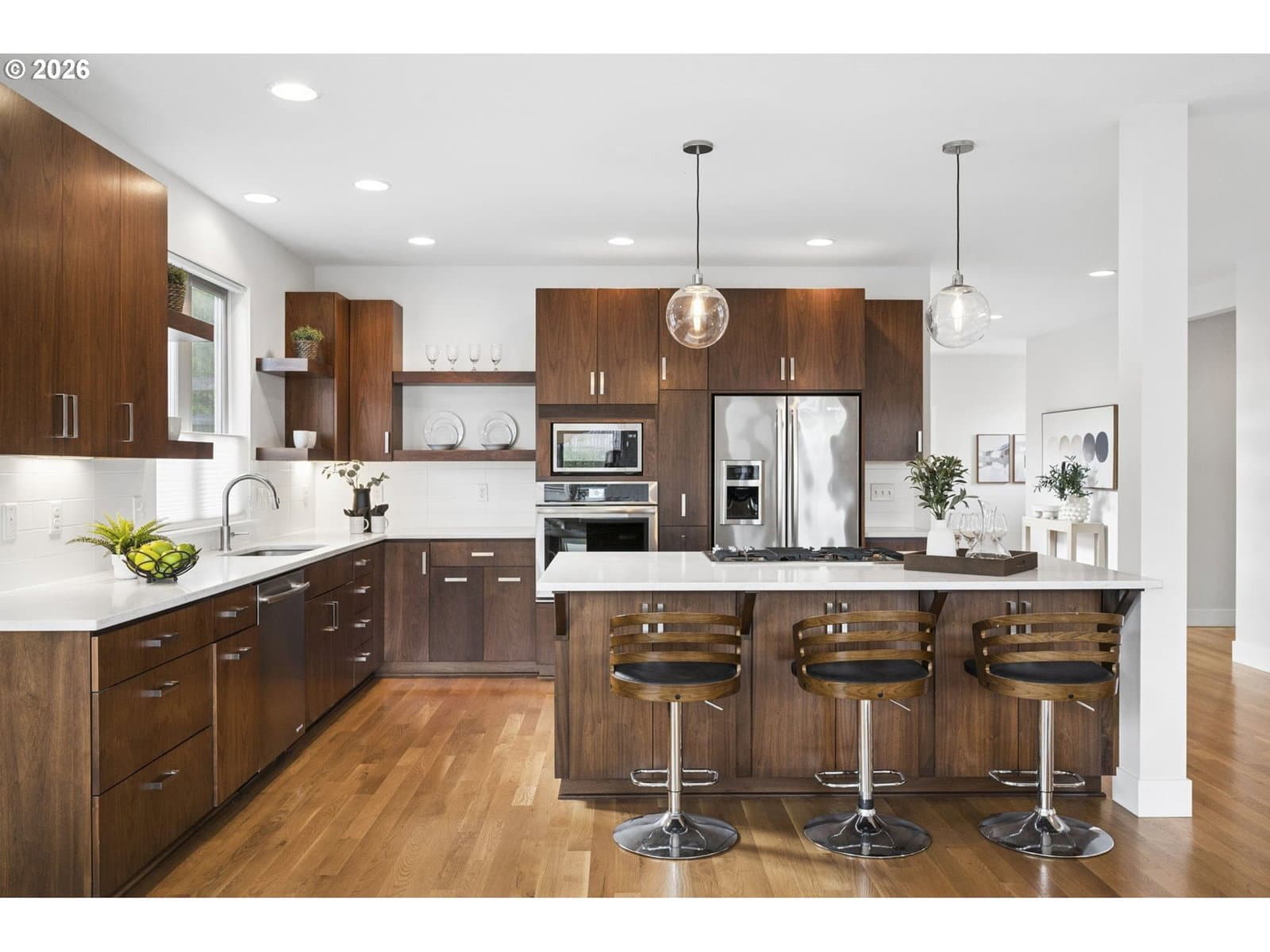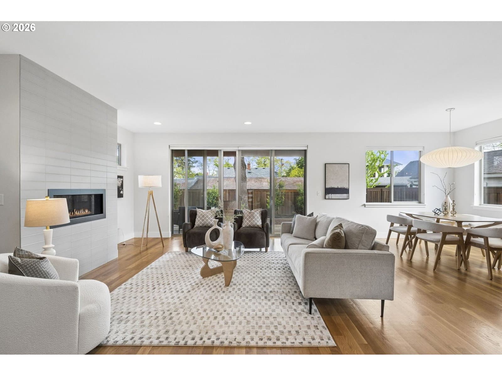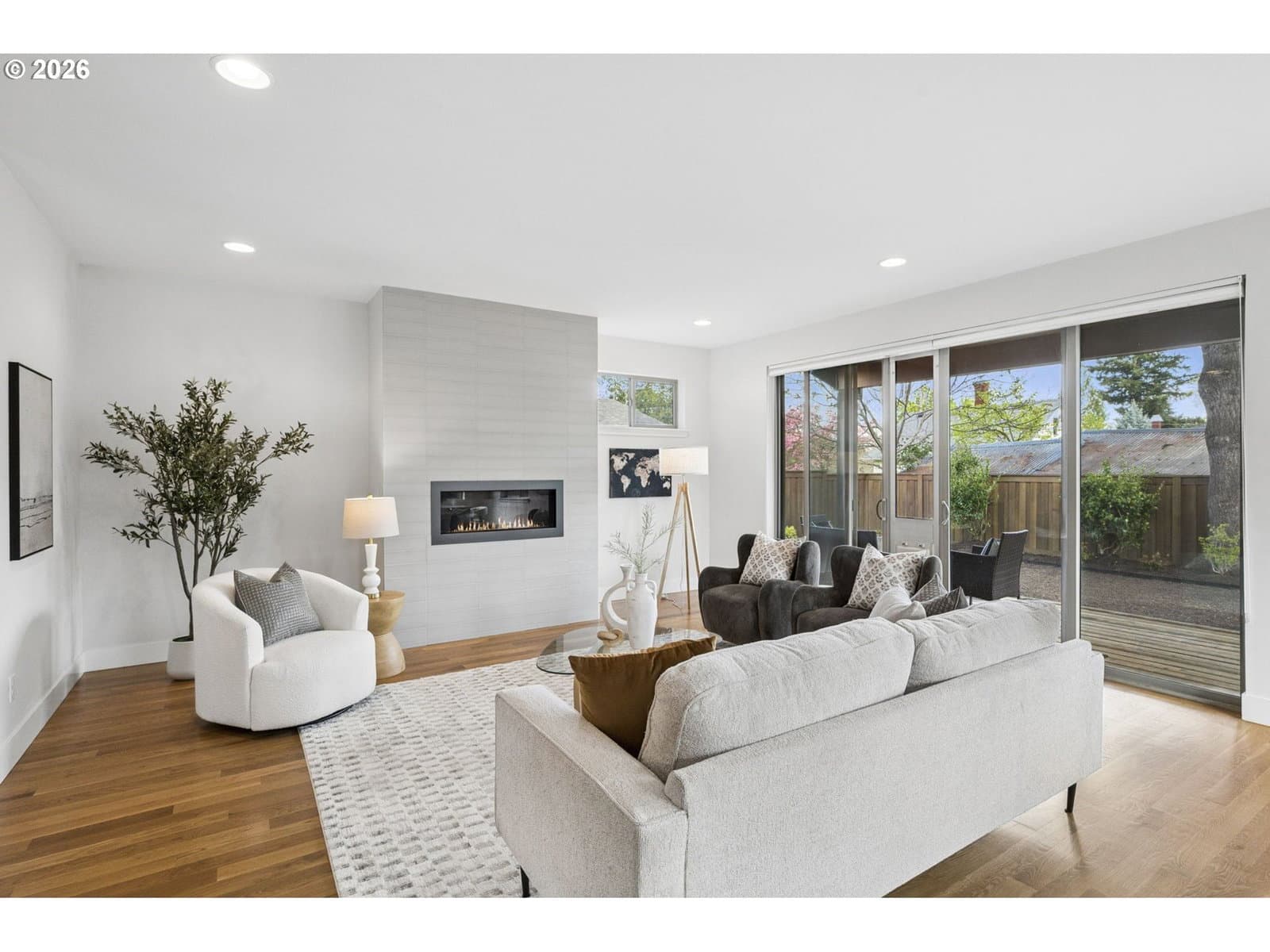 Immaculate modern masterpiece just steps from Dekum’s vibrant dining scene. This light-filled home features a spacious Great Room layout with soaring ceilings and beautifully finished hardwood floors—perfect for both everyday living and entertaining. A grand entry welcomes you with a generous foyer, private office/den, and striking staircase. The chef’s kitchen shines with rich walnut cabinetry, Caesarstone countertops, and a large island with seating—ideal for morning coffee or casual gatherings. The living room is anchored by a sleek gas fireplace, while floor-to-ceiling double doors open to a covered deck and fully fenced backyard—perfect for year-round outdoor enjoyment. Statement George Nelson pendant lighting elevates the dining area and stairwell. Upstairs, the vaulted primary suite offers a true retreat with a spa-inspired ensuite featuring a soaking tub, expansive walk-in rain shower, double vanity, and a spacious walk-in closet. Meticulously maintained and feeling like new construction, this home is complemented by a professionally landscaped yard—ready to enjoy from day one.