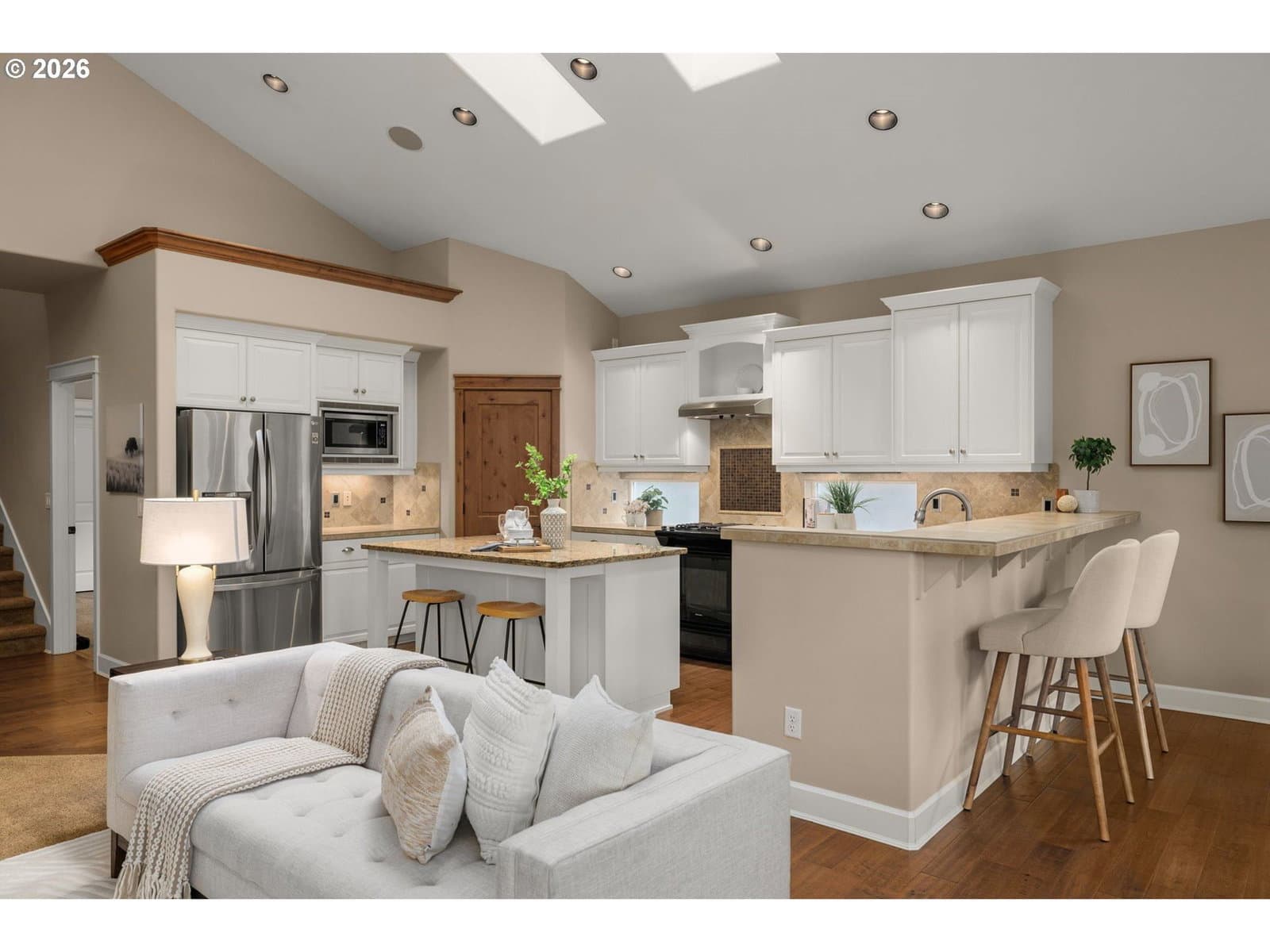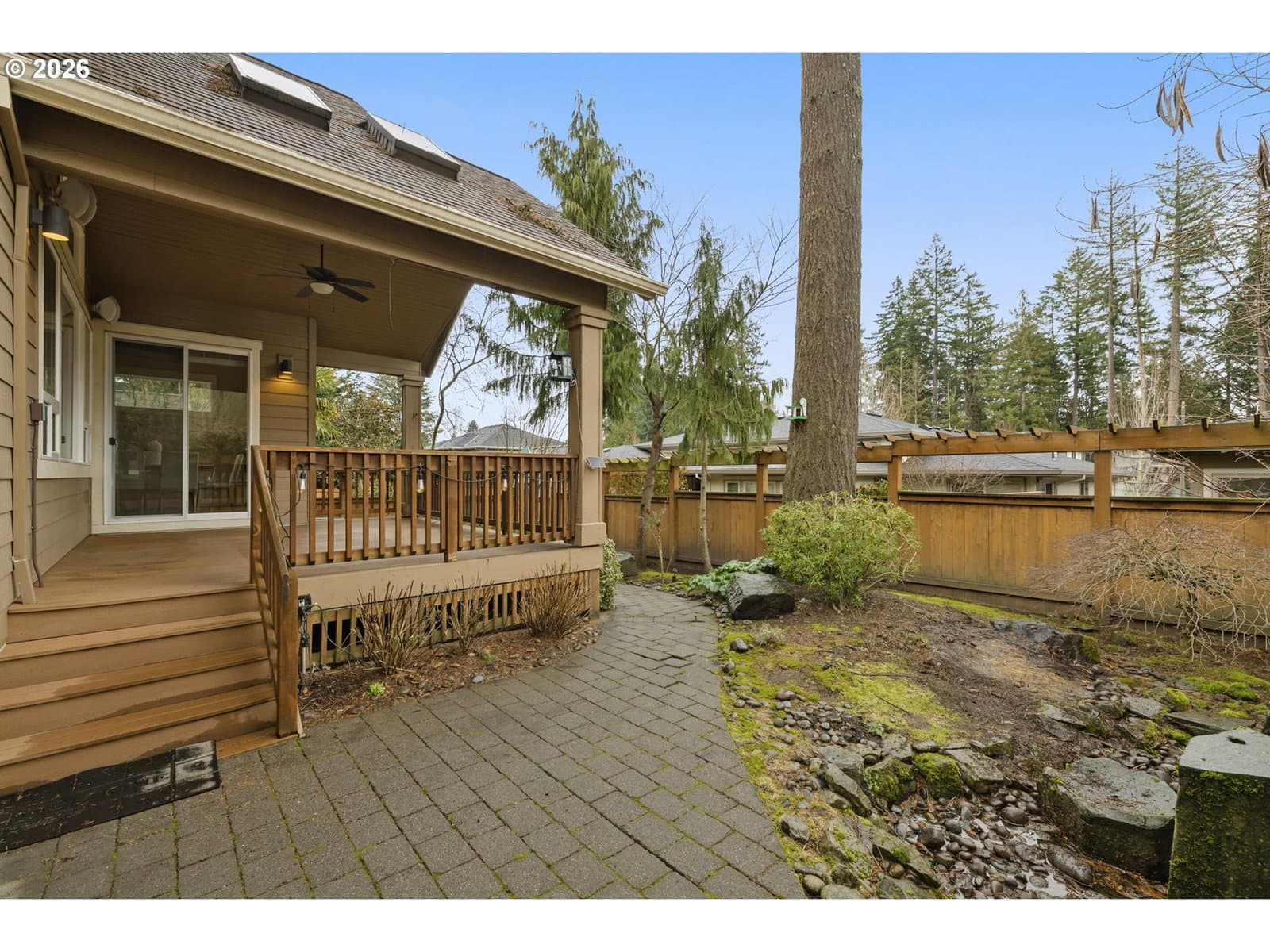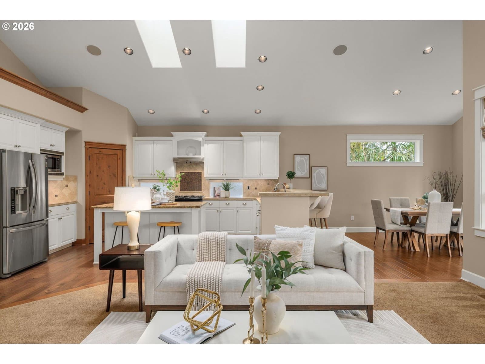 True single-level living defines this beautifully designed custom residence by Pahlisch Homes, featuring a primary suite and two additional bedrooms on the main floor, plus a flexible bonus room upstairs.The vaulted open living area seamlessly connects the kitchen, dining, and living room -which is anchored by a stone surround gas fireplace with custom built-in cabinetry.The kitchen offers modern white cabinets, a large granite island, gas range, built-in microwave, pantry, and distinctive raindrop-glass windows beneath the cabinetry that bring in natural light while maintaining privacy. The dining area opens directly to a covered cedar deck, creating an easy and inviting indoor-outdoor connection.The main-level primary suite features a frameless glass step-in shower, walk-in tub, granite double vanity, and large walk-in closet. Two additional main-level bedrooms share a full bathroom, with one bedroom showcasing custom floor-to-ceiling built-in shelving and a rolling ladder, which doubles as a great home office.Upstairs, the fourth bedroom or bonus room sits behind French doors and offers vaulted ceilings, skylights, a built-in projector and screen, workstation, window seat, full bathroom, and additional storage—an ideal media room/play room or guest suite.Additional highlights include a laundry room off the garage—perfect for a drop zone, a hall closet with wine storage, centralized lighting and sound controls, EV charging, a tankless water heater, and a fully fenced, low-maintenance yard with pavers and a rock garden.Conveniently located near Scholls Ferry and Hwy 217 with easy access to Beaverton, Portland, the westside tech corridor, parks, dining, and Washington Square Mall. This well-maintained beauty is light and bright with a great functional floorplan and everything you need to move right in!