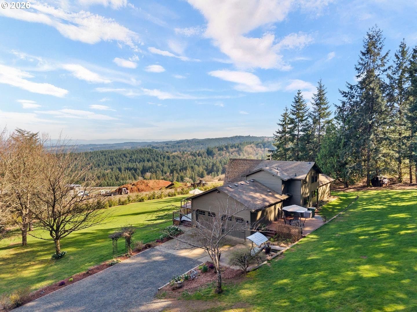 Set on 2.32 private acres with incredible territorial and mountain views including Mt Hood. This custom NW contemporary offers a peaceful setting surrounded by trees while still within reach of town. The home is thoughtfully positioned to capture light and views, with a dramatic window wall and expansive deck that create an easy connection between indoor and outdoor living. Inside, vaulted ceilings, hardwood floors, and a wood burning stove anchor the main living space, which has been tastefully updated and flows into the kitchen with wood counters, pantry, and stainless appliances. A flexible work or sunroom off the great room adds versatility, complete with skylights and direct access to the deck via a slider. Huge deck gives you a great place to relax and enjoy the views along with friend and family. The main level includes three bedrooms, while the upper level is dedicated to a private primary suite with vaulted ceilings, lofted feel, and soaking tub. Additional features include new Anderson windows, heat pump with AC, potential RV parking, and a generous yard with room to enjoy the natural surroundings.