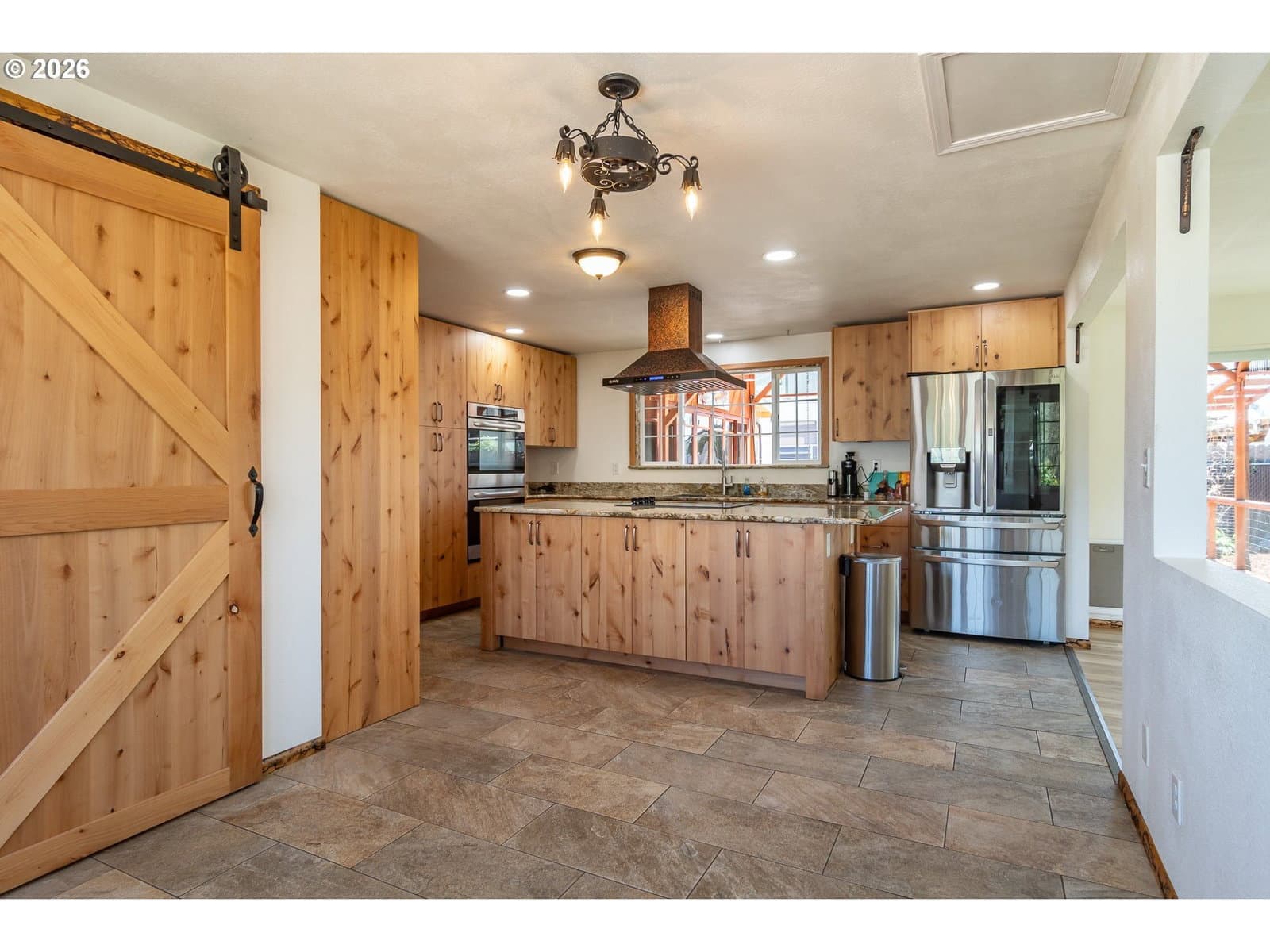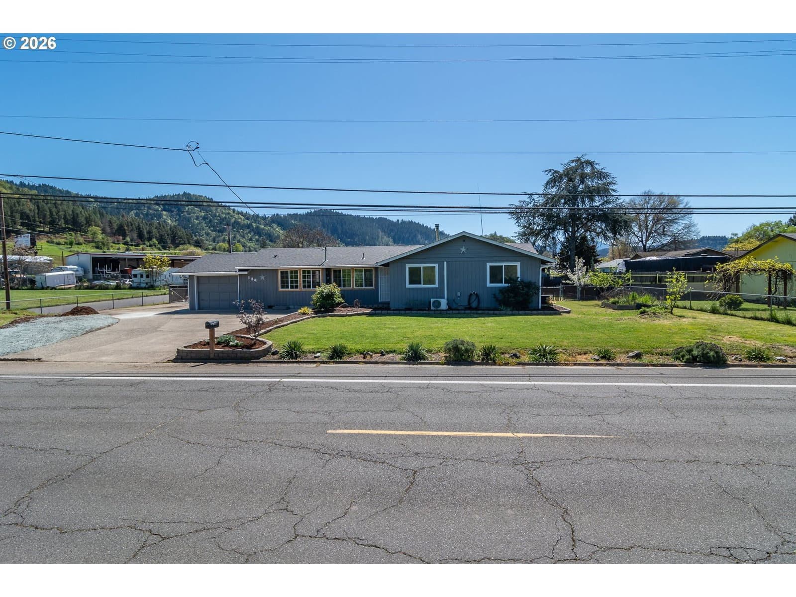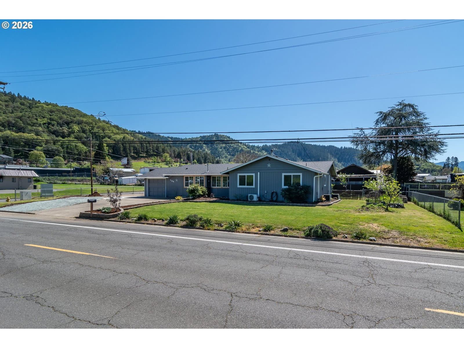 Beautifully maintained home on a spacious corner lot in an established Myrtle Creek neighborhood with mountain views, close-in amenities, and minutes to I-5. Inside, the home is filled with natural light and features double-pane vinyl windows throughout. The front entry opens to a large great room offering flexible living and family space, anchored by a cozy woodstove and complemented by ductless heating/cooling units throughout for efficient year-round comfort.The fully remodeled kitchen is a standout, featuring granite countertops, beautiful custom hardwood cabinetry, a cook island with glass-top stove, custom hood vent, double oven, stainless steel appliances, abundant storage, and a large pantry. The dining area offers a peek-a-boo opening to the living space, creating a wonderful balance of openness and separation. A bathroom with custom barn-style door adds charm and convenience. The home includes 3 bedrooms plus an attached exterior bedroom ideal for guests, extended family, office, or hobby use. Custom trim throughout completes this inviting and versatile home.Outside, the property continues to impress with well-landscaped front and back yards, fruit trees, gardening space, and a fully fenced backyard designed for privacy and enjoyment. The living room opens to a covered patio oasis featuring a porch swing, brick patio, fire pit area, and access to a an enclosed windowed hot tub room. A small fenced border creates excellent separation of space while opening to the expansive backyard beyond.