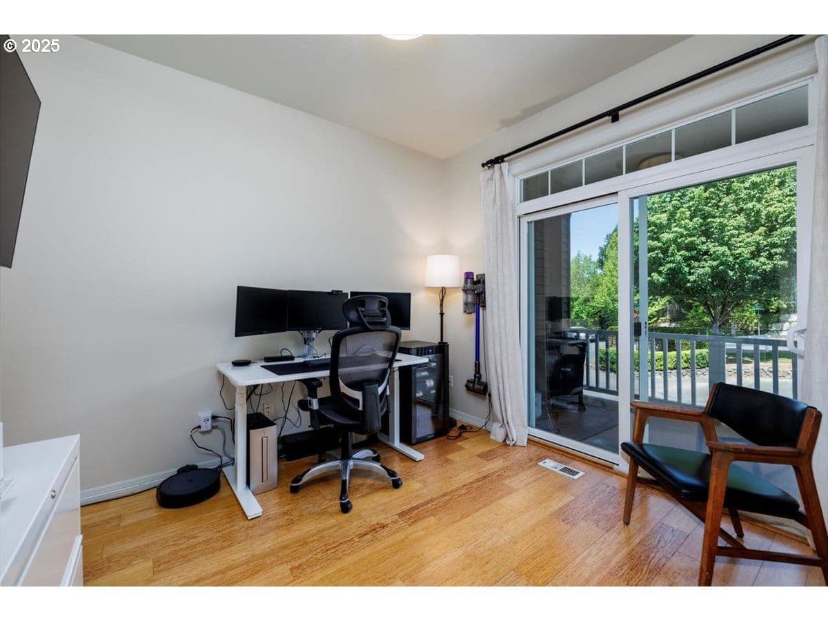 Welcome to this meticulously maintained townhouse nestled in the tranquil tree-lined setting of Cedar Mill and Forest Heights. This light-filled home features beautiful bamboo flooring throughout the main living areas and a slate tile entryway that sets the tone for refined living.The spacious living room opens to a private entertaining deck with serene views of lush green space—perfect for relaxing or hosting guests. The kitchen boasts granite countertops, gas range, and ample cabinetry for all your culinary needs. The generous primary suite includes an en-suite bath, while the expansive second bedroom spans the width of two rooms and features two full closets. The third bedroom offers direct access to a second deck through a sliding glass door, ideal for a home office or guest retreat. Enjoy three distinct outdoor living areas, a deep two-car garage with an electric car charging station, and additional storage space. Conveniently located near Cedar Hills shopping center, grocery stores, and popular restaurants. Minutes from Forest Heights trails, Mill Pond Park, and scenic walking paths. Experience the perfect blend of nature, comfort, and accessibility in this exceptional townhouse.
