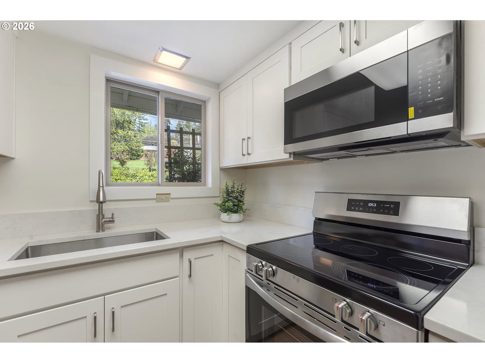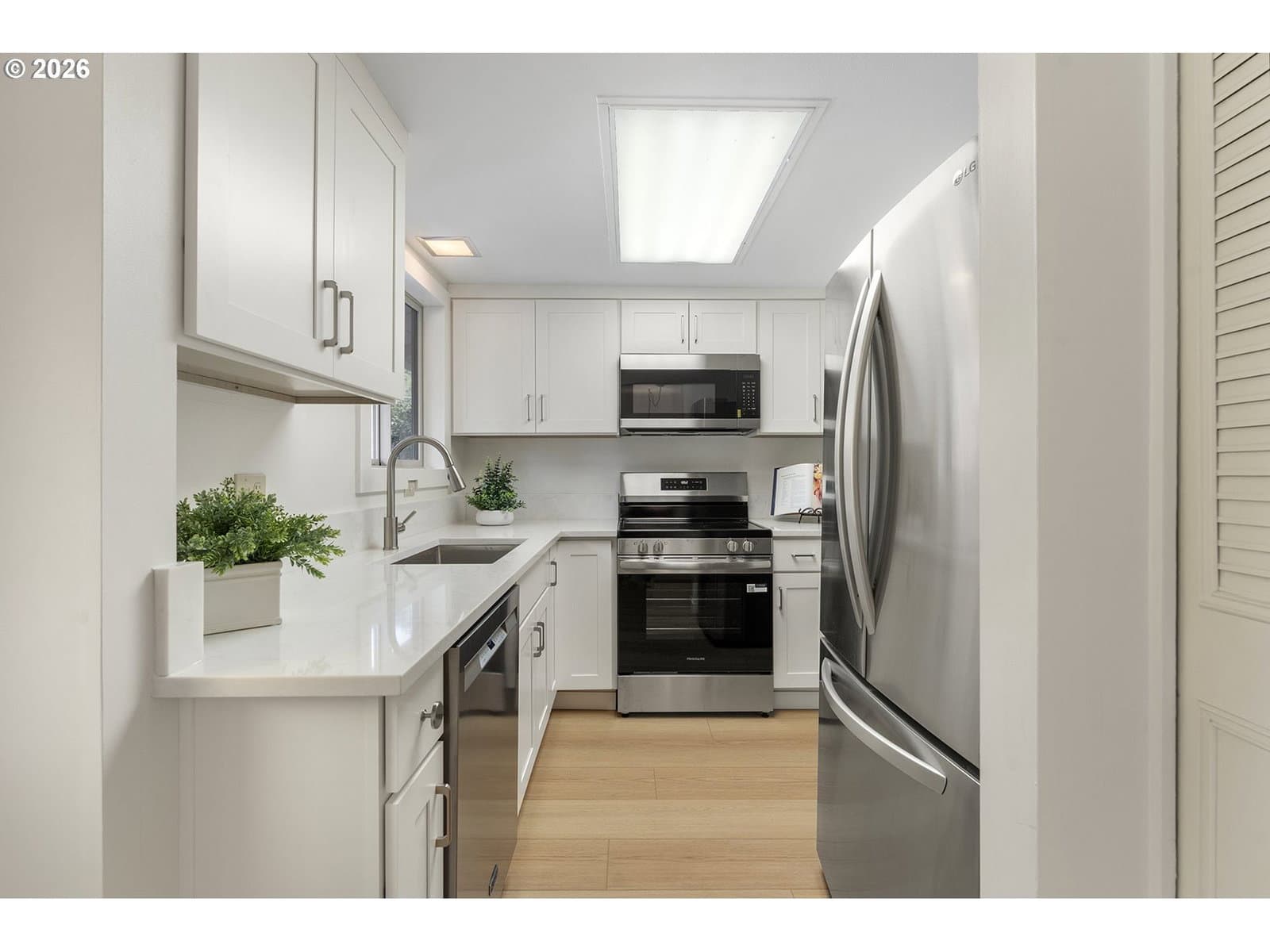 10days on marketTucked into a quiet corner of the sought-after King City Civic Association, this charming 1-bedroom, 1-bath condominium at 11575 SW Crown Ct Unit #2 offers the perfect blend of ground floor access with no step entry, comfort, style, and easy living—all in a beautifully updated 672 sq ft package. Step inside and feel instantly at home. Fresh interior paint, new doors, molding, and baseboards create a crisp, modern feel, while luxury vinyl plank flooring flows throughout (with cozy carpet in the bedroom). Sunlight pours through vinyl windows and the sliding glass door, illuminating a thoughtfully refreshed interior. The kitchen shines with new cabinetry, sleek countertops, stainless steel appliances, and a built-in microwave—making everyday living and entertaining effortless. The bathroom has been tastefully updated with a new vanity and a stunning walk-in tile shower. Year-round comfort is yours with an efficient mini-split system for heating and cooling. Step outside to your large view deck—perfect for morning coffee as the sun rises or unwinding at the end of the day. Just a short “Par 3” stroll to the clubhouse, you’ll enjoy access to golf, a pool, a library, and a vibrant calendar of activities. The HOA simplifies life by covering water, sewer, garbage, cable, exterior maintenance, landscaping, and more. With parking right in front (plus optional carport rental) and a dedicated storage unit, convenience is built in. Ideally located near shopping and major routes, this home offers both tranquility and accessibility. Whether you're relaxing at home or embracing the active community lifestyle, this inviting condo is your gateway to the best of King City living.