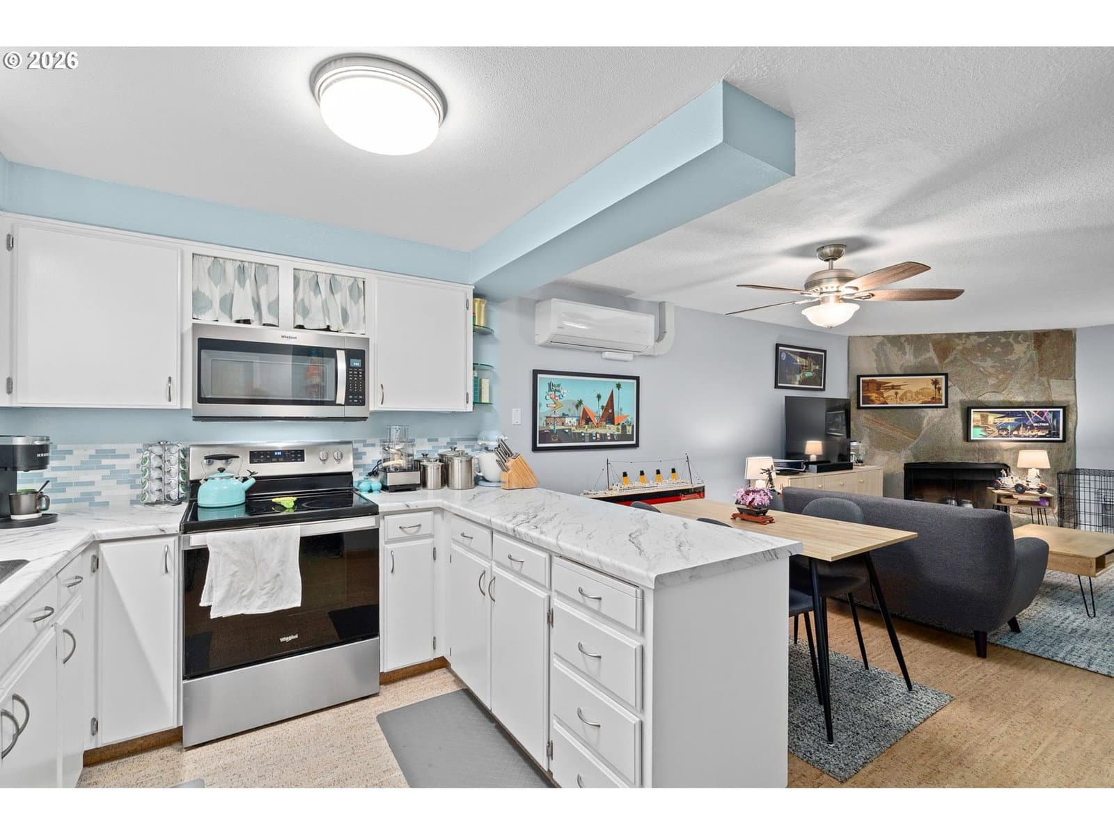 Nestled in the trees of Wood Village, this townhome on Treehill Drive is more than meets the eye. From the front of the home, an oversized garage encompasses the full lower level with room to park and store all your favorite things in one place. Down a tree filled path at the back of the property, a deck leads you to the back door or the second level of the town home. An open concept living space with remodeled kitchen, cork flooring and wood burning fire place make for an even more cozy feel amongst the trees. The top floor features two bedrooms both with ensuite bathrooms and a laundry closet. A mini-split heat pump system was recently installed for energy efficient heating and cooling. Schedule a showing and see why we love Wood Village!