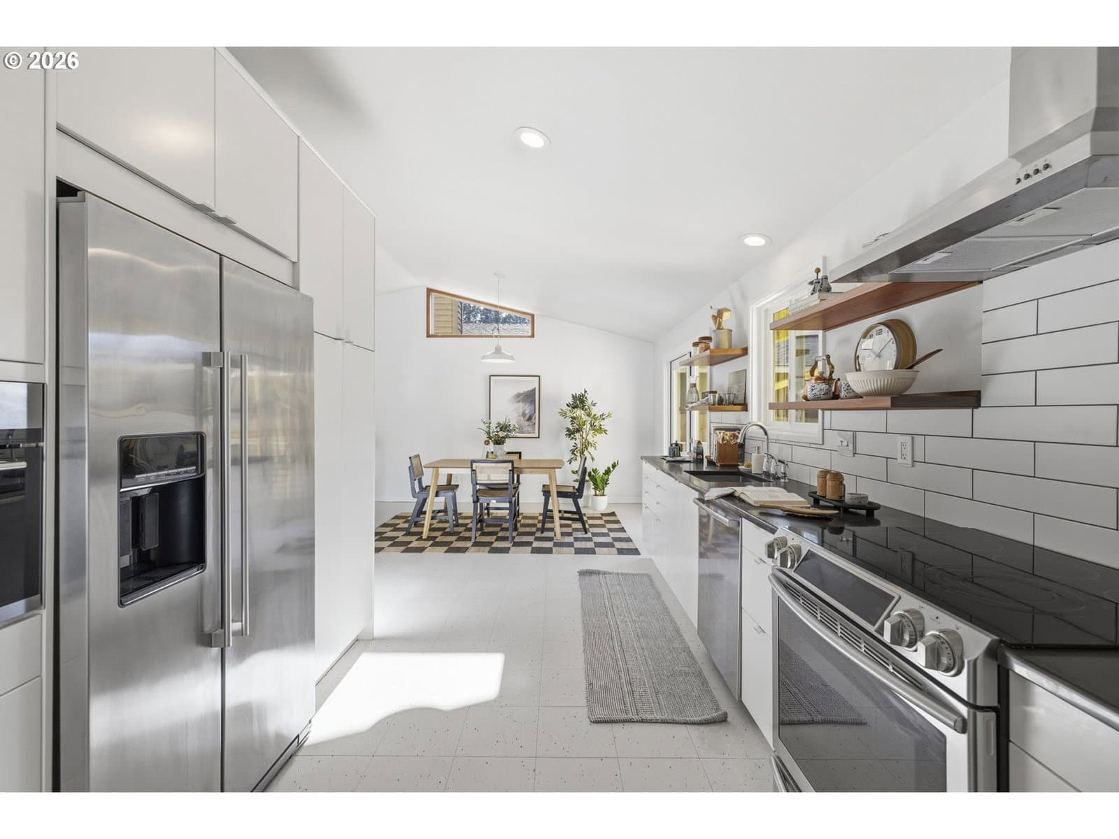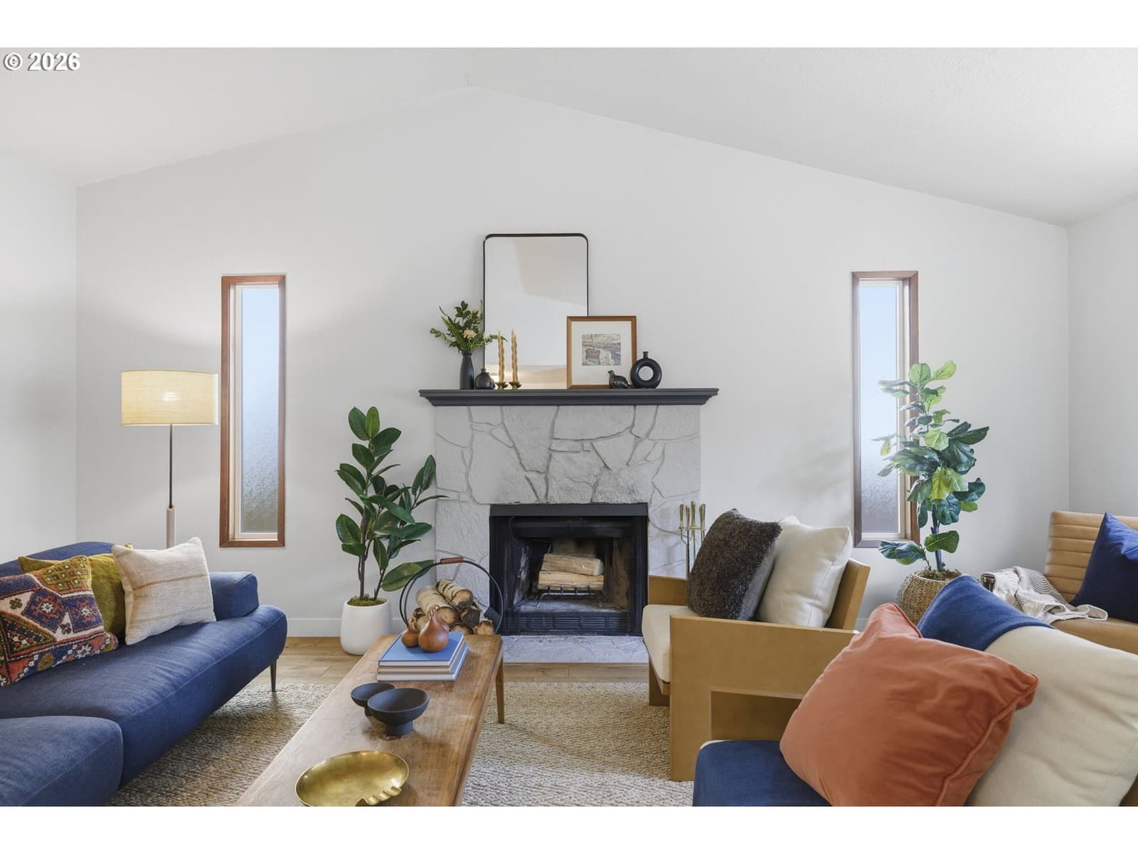 This thoughtfully updated 1979 ranch blends classic one-level living with standout curb appeal and modern upgrades. The home welcomes you with a charming front deck, beautifully planted yard, and a unique vestibule-style entry that sets it apart. Inside, the spacious living room features vaulted ceilings and a wood-burning fireplace, creating a warm and inviting space filled with natural light. The home offers 3 bedrooms and 2 bathrooms, including an ensuite primary, all on a highly accessible single level—ideal for easy, everyday living. The beautifully updated kitchen opens seamlessly to the light and bright dining area, where French doors lead to the back deck, creating a natural flow for entertaining or enjoying the private backyard. Fun architectural windows throughout bring in great natural light and add character you don’t often find in a ranch-style home. Major updates include vinyl windows, a new roof (2023), new HVAC system (2024), and fresh exterior paint (2023), providing both comfort and peace of mind. Additional features include a high crawlspace, two-car garage, and multiple outdoor living spaces with both front and back decks. Located just blocks from Dickinson Park and nearby walking trails, fresh air becomes part of the daily routine. With excellent proximity to Washington Square, Multnomah Village, Gabriel Park, and easy access to I-5, this home offers the perfect balance of quiet neighborhood living, everyday convenience, and commuter access. [Home Energy Score = 4. HES Report at https://rpt.greenbuildingregistry.com/hes/OR10105859]