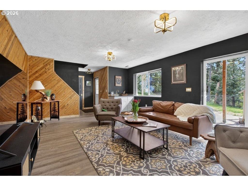 Looking for the perfect blend of modern comfort and the serene country setting of Corbett? Situated on two forested acres on a quiet road near the Corbett schools, this move-in-ready mid-century modern home features numerous updates. Professionally designed landscaping greets you as you enter the property, and the sweeping wraparound deck offers a private spot to relax with a good book or entertain family and friends as you enjoy your wooded back acreage. The grassy side yard is a great spot for outdoor recreation or gardening. The 12X8 storage shed is ideal for the riding lawn mower that IS included! Entering the home, you are greeted by expansive windows letting in the natural beauty and sunlight. The living room features vaulted ceilings with natural-wood ceiling panels and a floor-to-ceiling stone fireplace for a cozy ambiance on chilly winter nights. Is there a chef in the family? This custom kitchen is a delight with a professional 48" ZLINE gas range with double oven, stainless commercial-style hood and pot filler, a 42" KitchenAid built-in refrigerator, Caesarstone "Rugged Concrete" quartz countertops, and custom hardwood minimalist Shaker cabinetry with soft-close doors and drawers. The main level primary bedroom is spacious, with an ensuite that includes a washer/dryer hook-up. Lower-level living includes a family room with two separate sliders out to the concrete patio, a laundry room, and a huge bonus room with a sauna! Perfect for an exercise room or an office. Looking for multi-generational living or a guest suite? The lower bedroom and bath have their own exterior entrance. Are you a fan of technology? The home features a whole-house generator, upgraded electrical panel, tankless water heater, and two EV charging stations in the garage. Located in the award-winning Corbett School District and near the Columbia Gorge waterfalls and hiking trails. Furnishings in the home are negotiable.