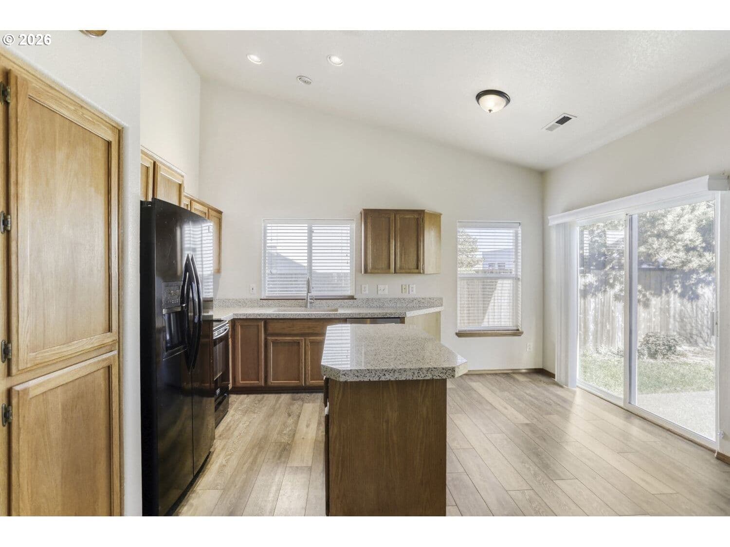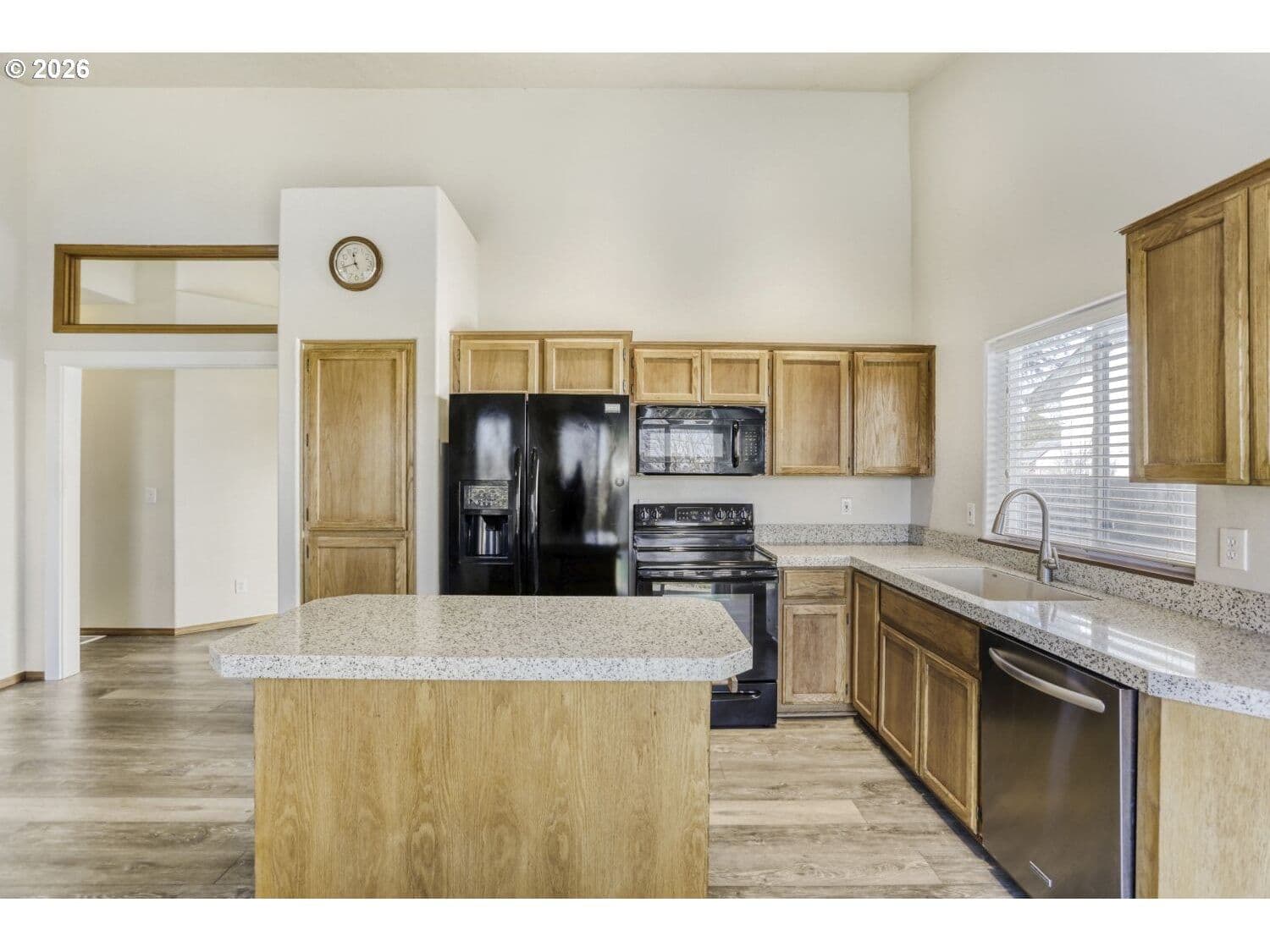 Discover the perfect blend of modern comfort and effortless style in this move in ready single level home. Featuring three bedrooms and two full bathrooms, the residence has been thoughtfully updated throughout to provide a fresh, contemporary feel. The heart of the home is an expansive open concept great room where the kitchen, dining, and family areas flow seamlessly together under soaring vaulted ceilings. Flooded with natural light, this inviting space is anchored by a cozy fireplace, perfect for relaxing evenings. The primary suite serves as a true private retreat, boasting an elegant ensuite bathroom with a dual vanity and direct slider access to the back patio.Recent upgrades add both style and peace of mind, including luxury vinyl flooring, a new dishwasher, updated blinds, and refreshed bathrooms with new toilets, sinks, and granite countertops. Ceiling fans have been added in the living room, family room, and primary bedroom for enhanced comfort. Major system improvements include a newer A/C and furnace, as well as an Aquasana whole-house water filtration system. The exterior was freshly painted last fall, completing the home’s polished look. Whether you’re hosting a dinner party in the bright living area or enjoying a quiet morning coffee outdoors, this home is designed for easy living, thoughtful updates, and modern convenience. [Home Energy Score = 6. HES Report at https://rpt.greenbuildingregistry.com/hes/OR10243965]