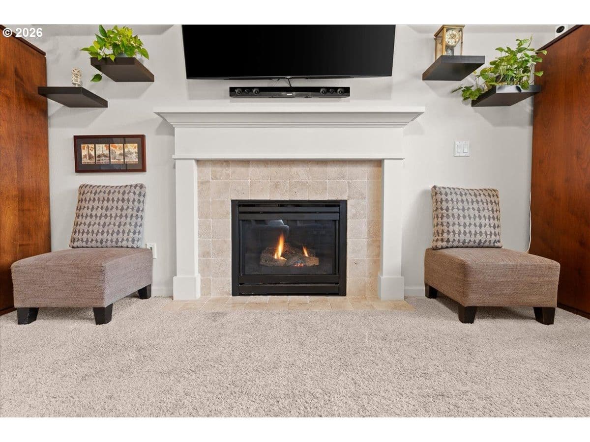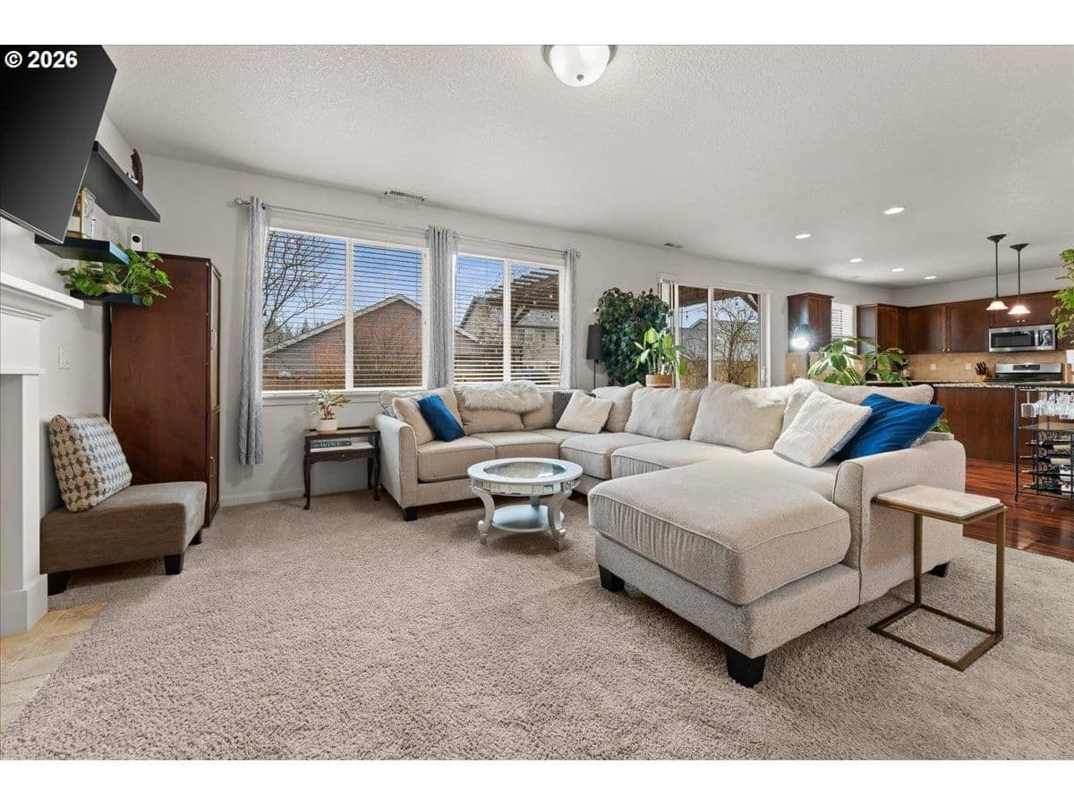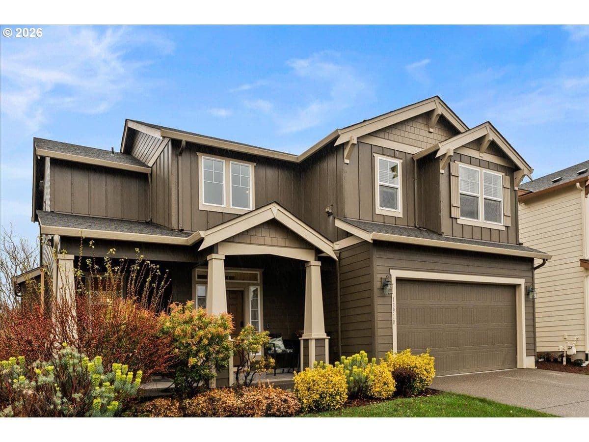 Beautifully maintained and designed for modern living, this 3 bed/2.1 bath home offers a smart layout and standout features including 9’ ceilings and a double-height entry. Thoughtfully crafted with an open concept design, the home features an inviting great room with a cozy gas fireplace, dining area, and a well-equipped kitchen with solid surface countertops, stainless steel gas appliances, full-height backsplash, pantry, and a dedicated coffee nook. Upstairs, the primary suite includes a sitting area, large walk-in closet, and an en-suite bath with dual sinks and a walk-in shower, plus two additional bedrooms, a full bathroom, and a conveniently located laundry room with built-ins. Out back, enjoy an arbor-covered patio with a water misting system, built-in firepit, and raised garden beds with established plantings including herbs, blueberries, and strawberries, fig tree and more. The home includes forced-air gas heat, central A/C, a tankless water heater, smart home lighting and thermostat, and the garage has been upgraded with EV charging. Front yard landscaping is included in the low HOA for easy living. Conveniently located near multiple parks and trails, with shopping nearby including Fred Meyer, WinCo, Safeway, Walmart, and Costco, plus straightforward access to I-205 via Padden Parkway, and PDX is approximately a 15-minute drive.