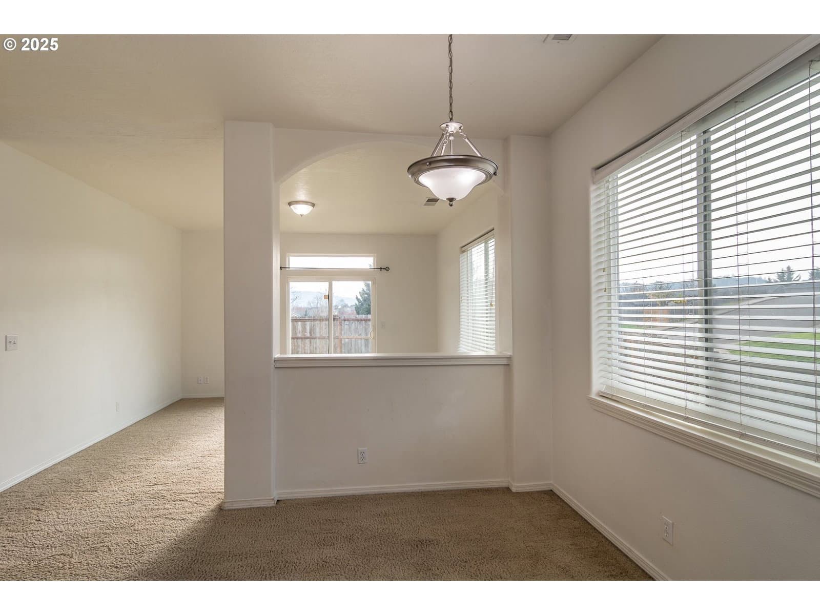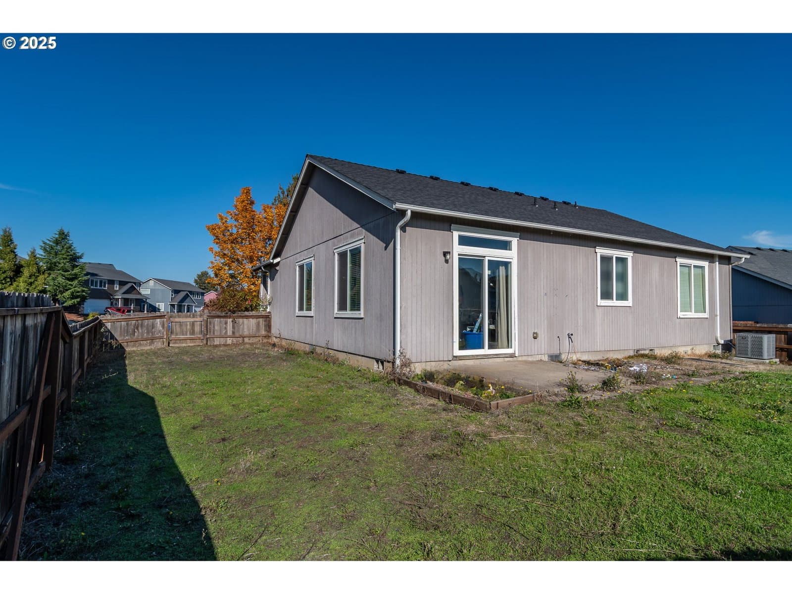 This charming 3-bedroom, 2-bath home sits on a large, fenced corner lot in a desirable area of the Green District. A covered, columned entryway creates a warm welcome, while high ceilings throughout enhance the home's open, spacious feel. Large windows with blinds fill the interior with natural light. The open-concept layout connects the kitchen, dining, and living areas, ideal for both daily living and entertaining. A sliding glass door off the living room leads to a concrete patio—perfect for outdoor gatherings. The primary bedroom features double closets and a private en-suite bath. A separate laundry room offers ample shelving for storage and organization. Outside, the large backyard is enclosed by a wooden privacy fence with a gate for convenient access. Additional highlights include a two-car garage with extra storage space, a new roof installed in 2023, and a new hot water heater added in 2024.