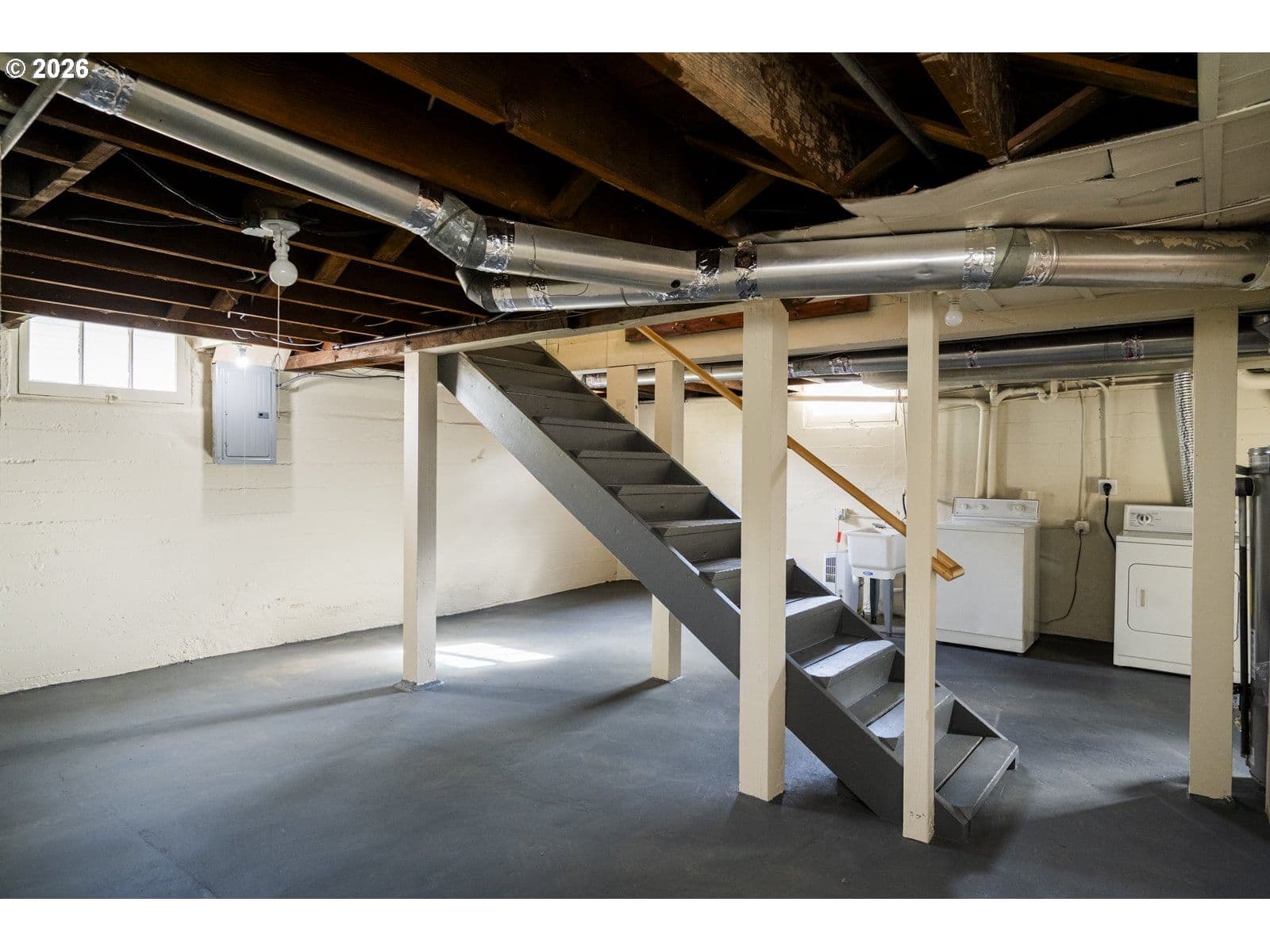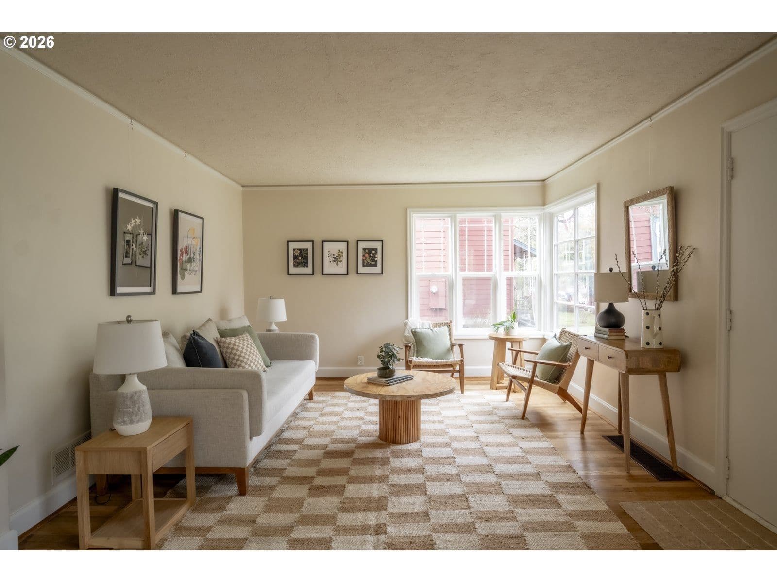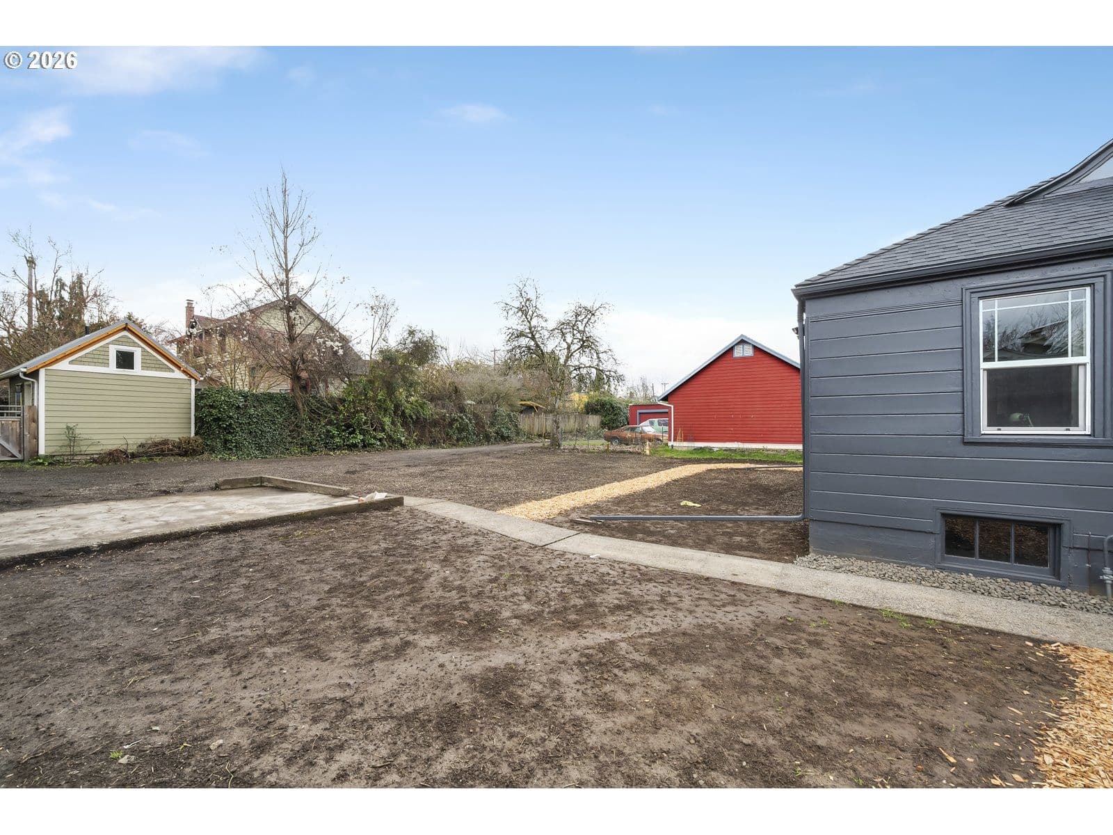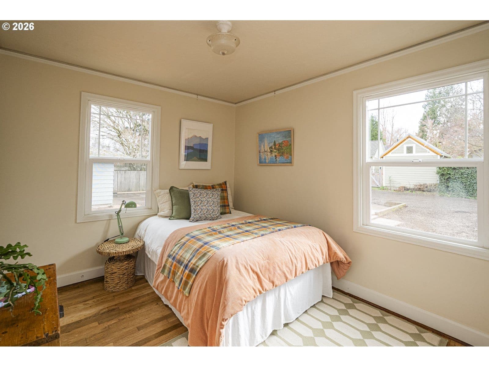 Mid Century charm in the Overlook Triangle! Perched up off the street, this stunning property has curb appeal in spades. Step through the front door and notice original features like hardwood floors, a fun mail slot, a vintage speakeasy door hatch, and beautiful corner windows for capitalizing on sunlight all year long. Enjoy cooking in the charming kitchen with vintage features that have been paired with modern appliances and a brand new sink and faucet. Two spacious bedrooms offer plenty of closet space and overlook the big backyard. Downstairs, find a clean full basement with an extra bonus room: it's a quiet space for a home office, or a great place to hang with friends and jam. Recent updates include a brand new electrical panel, a new roof, and fresh paint throughout, and the basement and attic offer plenty of room for storage or future expansion. The oversized .17 acre lot is ready for your green thumb or possible future development, with alley access and a parking pad in back. With hip Mississippi Ave just .6 miles away and Mock's Crest Park at your fingertips, you'll love life in this vibrant neighborhood! [Home Energy Score = 3. HES Report at https://rpt.greenbuildingregistry.com/hes/OR10245103]