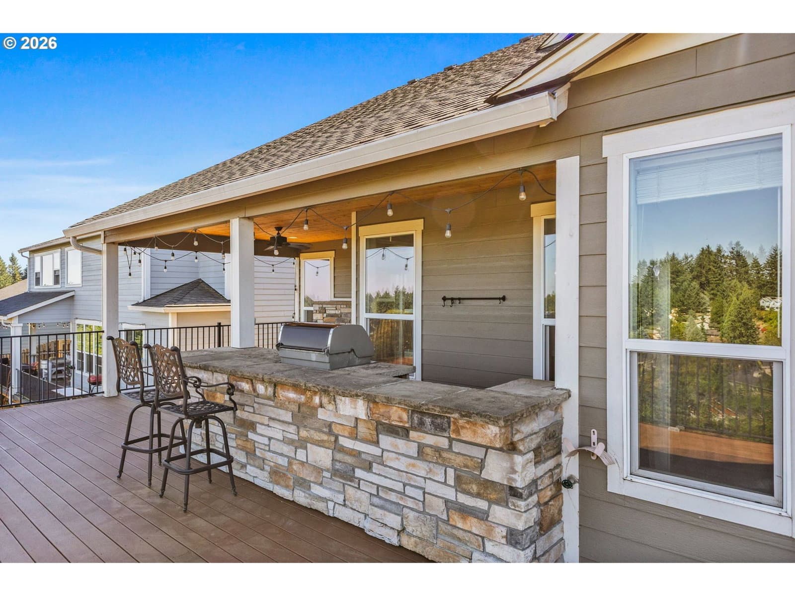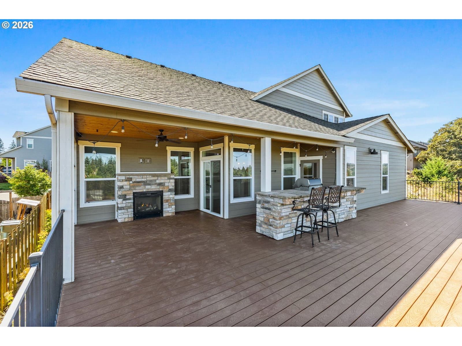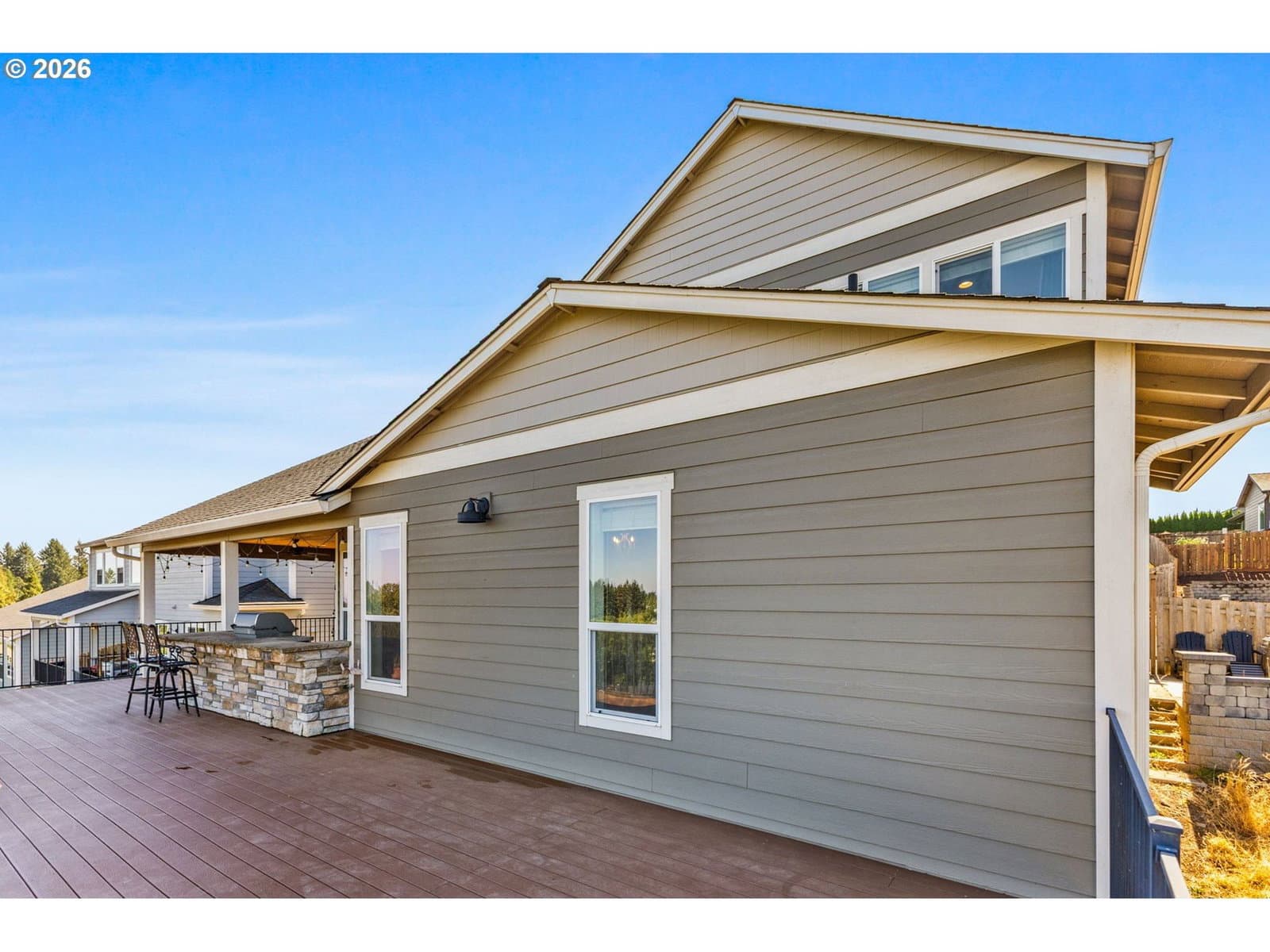 Enjoy stunning Mt. Hood views from this beautiful home designed for both comfort and entertaining. The main level offers a generous primary suite with a large walk-in closet and spa-style en-suite bath, plus a second bedroom and a chef-inspired kitchen that opens to a light-filled great room. An expansive deck captures breathtaking sunrise-to-sunset scenery. A dual-sided fireplace seamlessly connects the indoor living space to a covered outdoor lounge, creating an inviting indoor-outdoor flow.