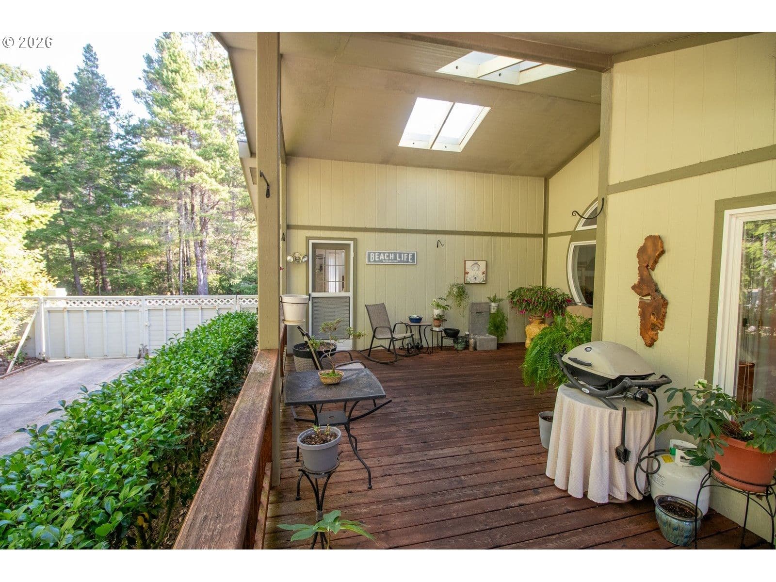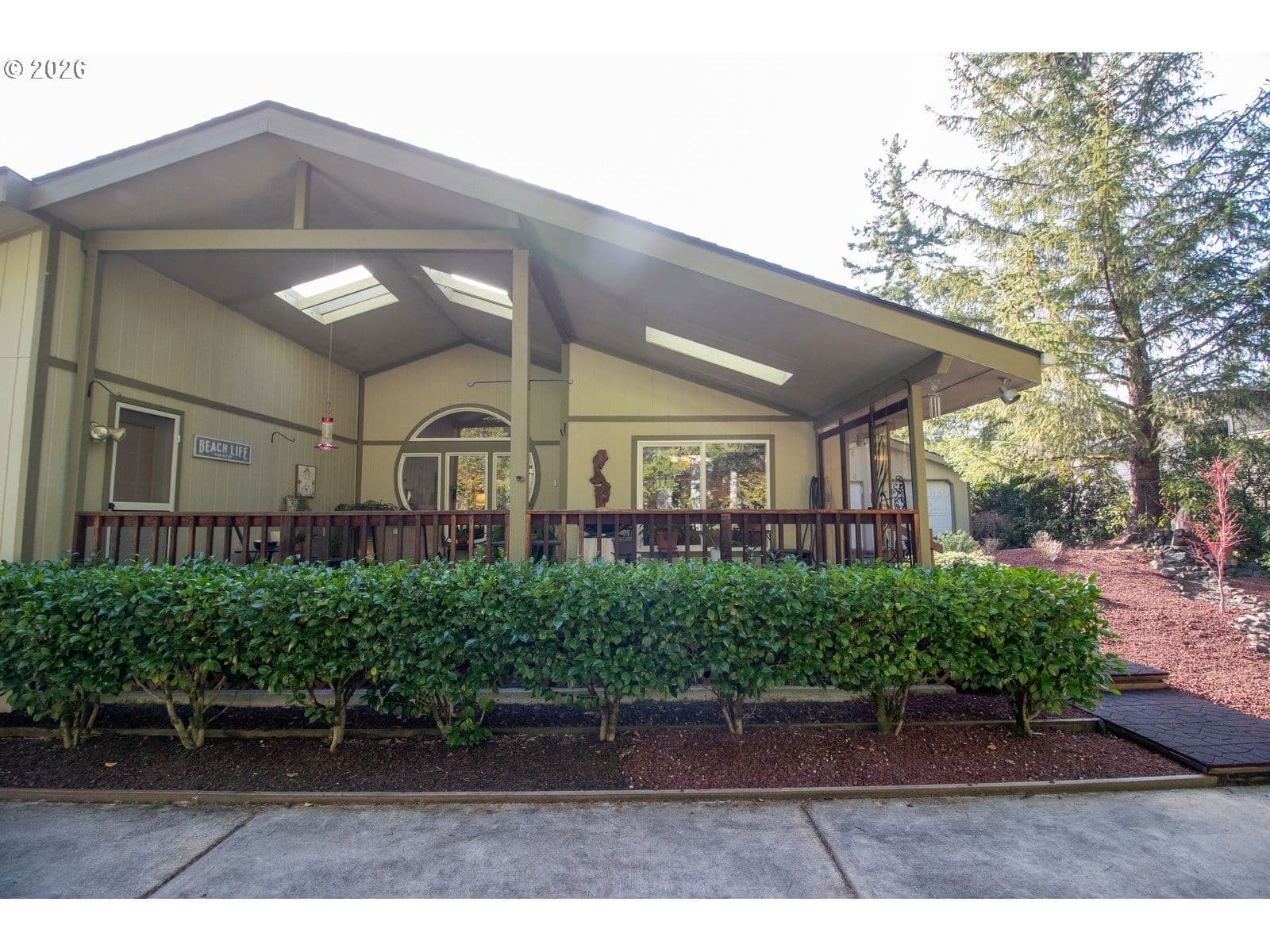Stylish One-Level Home in Florentine Estates with RV Hookups & Exceptional Indoor-Outdoor Living. Welcome to this beautifully maintained 3-bedroom, 2-bath, 1,872 sq. ft. home located on a desirable comer lot in Florentine Estates. Designed for comfort and functionality, this one-level residence features high vaulted ceilings, an open floor plan, and abundant natural light throughout. The spacious living area is highlighted by a dramatic oversized porthole window overlooking the large, covered deck, creating a stunning focal point and seamless indoor-outdoor connection. The primary suite opens directly to the rear deck through elegant French doors, offering a private retreat feel. Additional features include skylights and ceiling fans throughout, a mudroom with storage and utility sink, and low-maintenance landscaping for easy living. The home also boasts a 3-year-old roof for peace of mind. Car enthusiasts and hobbyists will appreciate the oversized finished 2-car garage with three garage doors and a convenient half bath. There's also a gated RV pad with full hook-ups, making this property ideal for travelers or guests. Enjoy outdoor living from both the front deck and rear covered deck, perfect for relaxing or entertaining year-round.