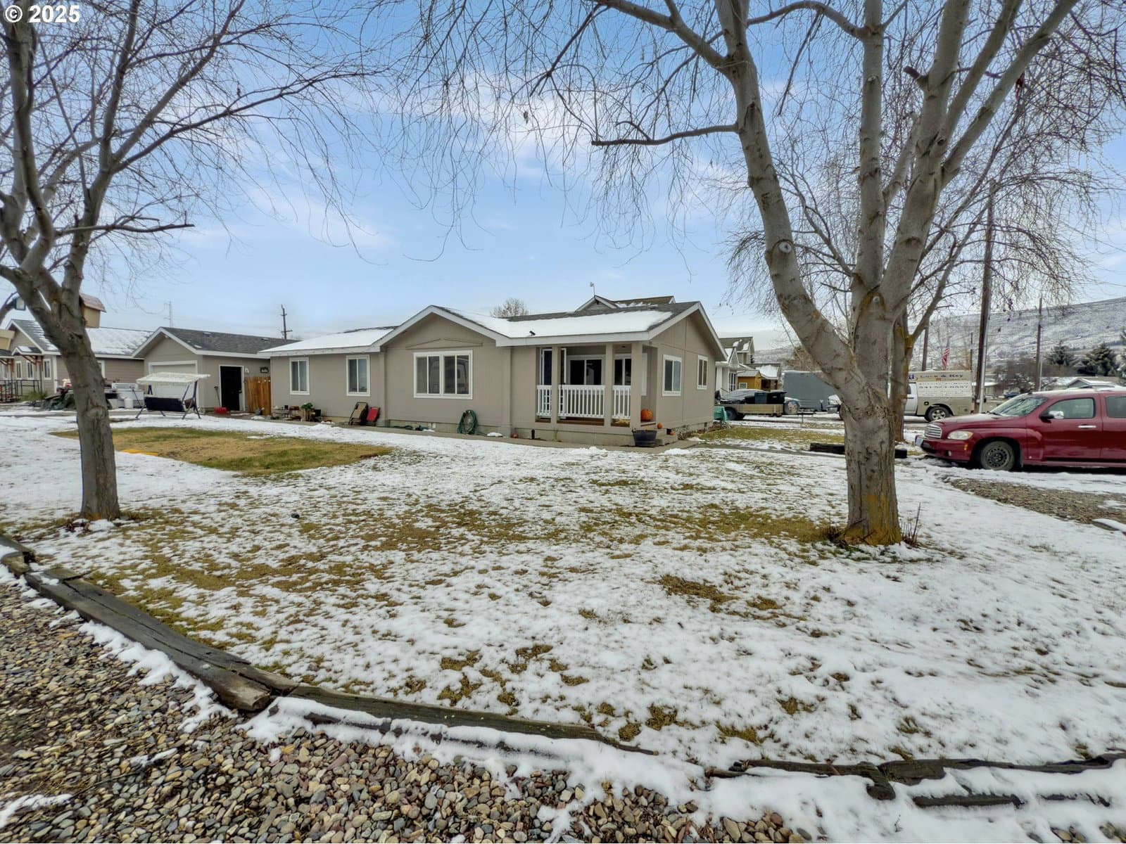 Welcome to this charming double-wide manufactured home that perfectly balances comfort with practical living. This well-maintained home offers three bedrooms and two bathrooms across 1,462 square feet of thoughtfully designed space. The design of this home maximizes every square foot efficiently, with vaulted ceilings in the main living space creating an open feel that belies its compact footprint. Modern amenities blend seamlessly with practical features, resulting in a home that works as hard as you do. The primary bedroom provides a private sanctuary, while the two additional bedrooms offer flexibility for family members, guests, or a home office setup. What truly sets this property apart is the impressive parking. And, the detached double car garage provides secure storage for vehicles, tools, or hobbies. Location plays a key role in this home's appeal, sitting just one block from Churchill School, one of Eastern Oregon’s premier destinations for arts, lodging and live music. Whether you're a first-time buyer seeking affordability without compromise, a growing family needing space and convenience, or someone looking to downsize without sacrificing comfort, this property delivers on multiple fronts. The combination of solid construction, prime location, and ample parking creates an opportunity that's both practical and appealing.