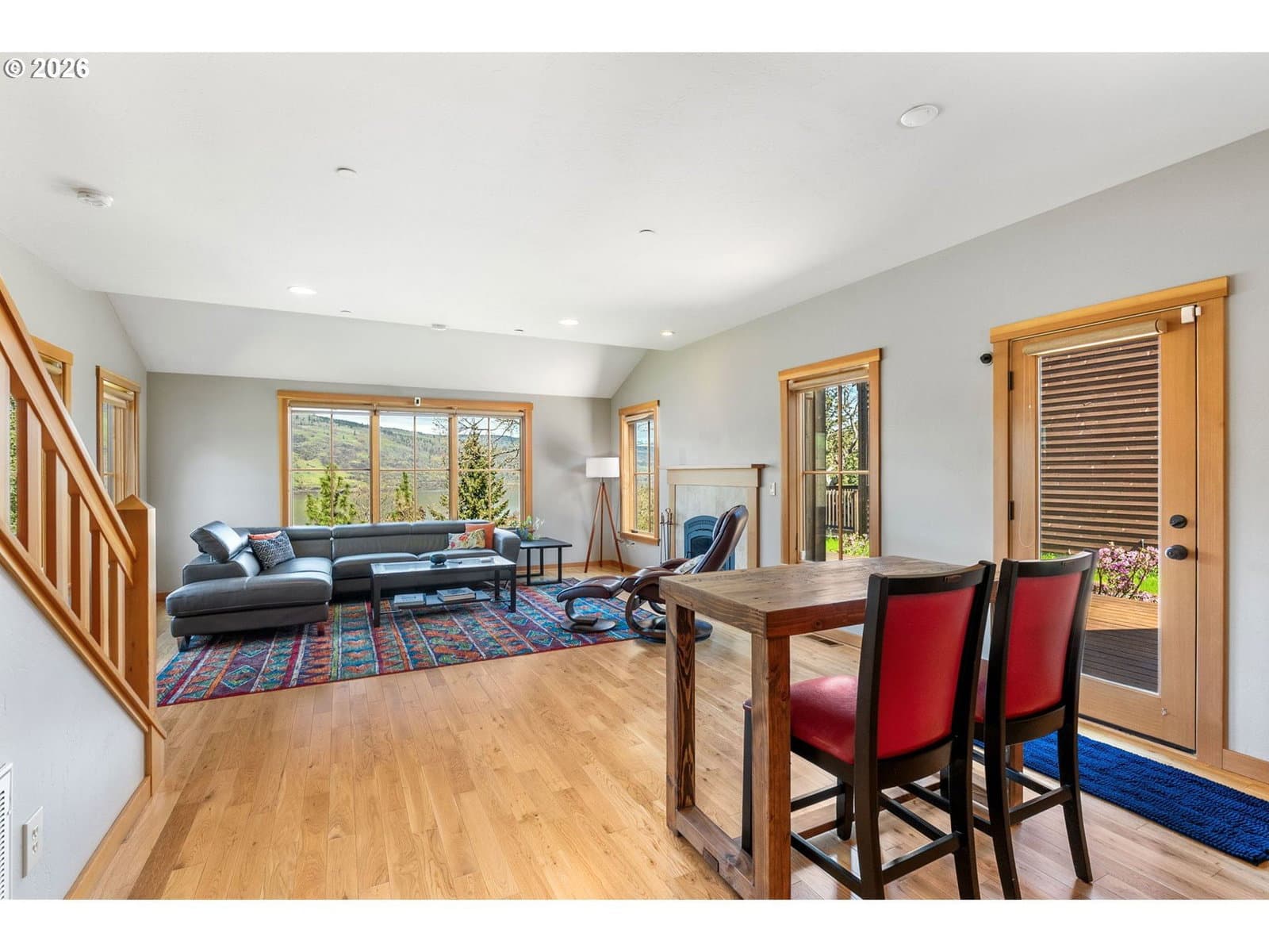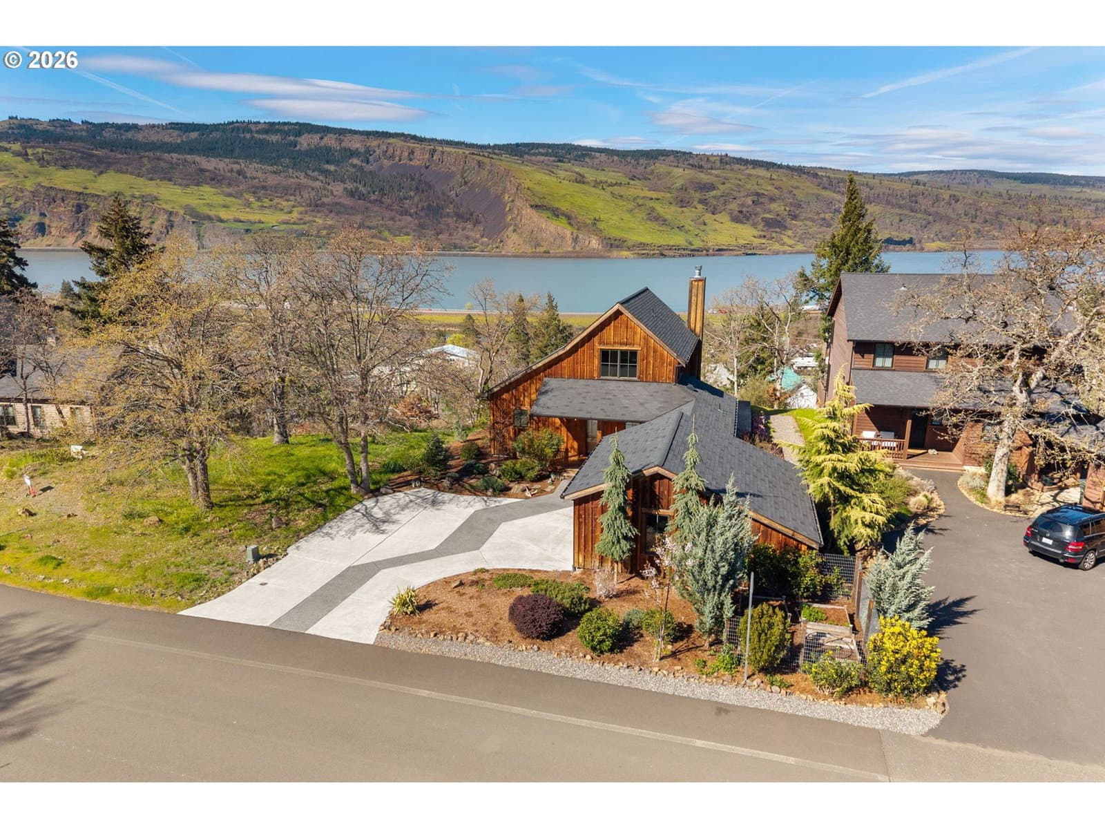 Perched above the Columbia River on a scenic bluff, this beautifully crafted modern Craftsman captures breathtaking, unobstructed views of the river, Coyote Wall, and the dramatic Syncline. Designed to complement the natural beauty of the Gorge, the home features classic Northwest architecture with warm cedar board-and-batten siding and high-quality finishes throughout.This 3-bedroom, 2-bath home offers an open-concept layout filled with natural light. Expansive windows frame ever-changing river vistas and seasonal colors, while the inviting living room features a cozy wood-burning fireplace—perfect for relaxing year-round. The well-appointed kitchen combines style and function with new appliances, including an induction range, along with quartz and butcher block countertops. Step out to the wind-protected deck, ideal for outdoor dining, entertaining, or simply taking in the views.The flexible floor plan includes a main-level bedroom and full bath, plus two vaulted upstairs bedrooms with an additional full bath—perfect for guests, remote work, or creative space. Thoughtful design ensures stunning views from nearly every room, creating a seamless connection to the surrounding landscape.A covered breezeway leads to the detached two-car garage, offering ample storage for vehicles and gear. The landscaped yard features mature plantings and raised garden beds, ideal for those who enjoy gardening and outdoor living.This property is just a short walk to downtown Mosier, with easy access to shops, dining, and coffee. Enjoy nearby recreation including the Historic Columbia River Highway and Mosier Waterfront Park. Enjoy a peaceful Gorge retreat with unforgettable views.