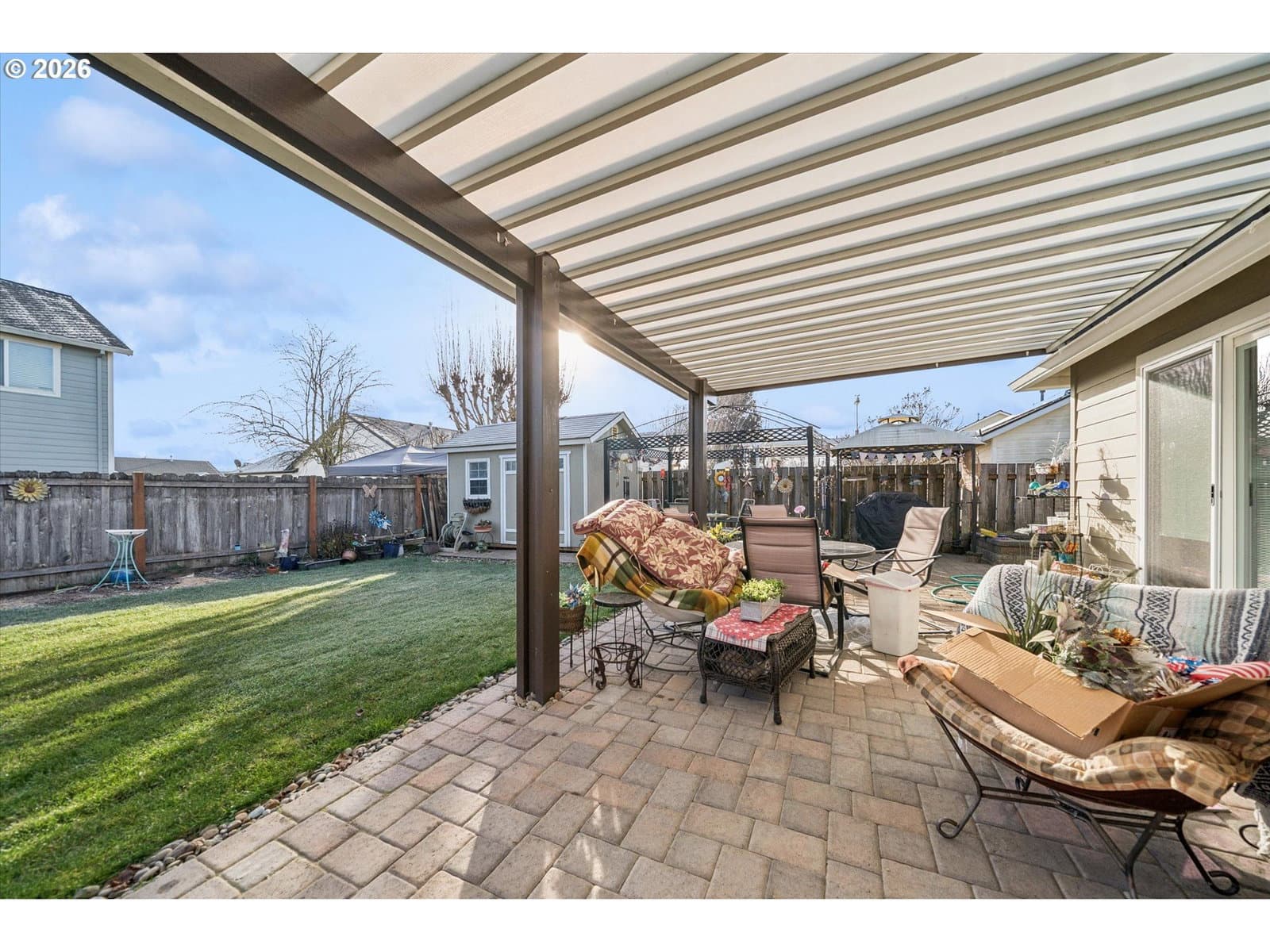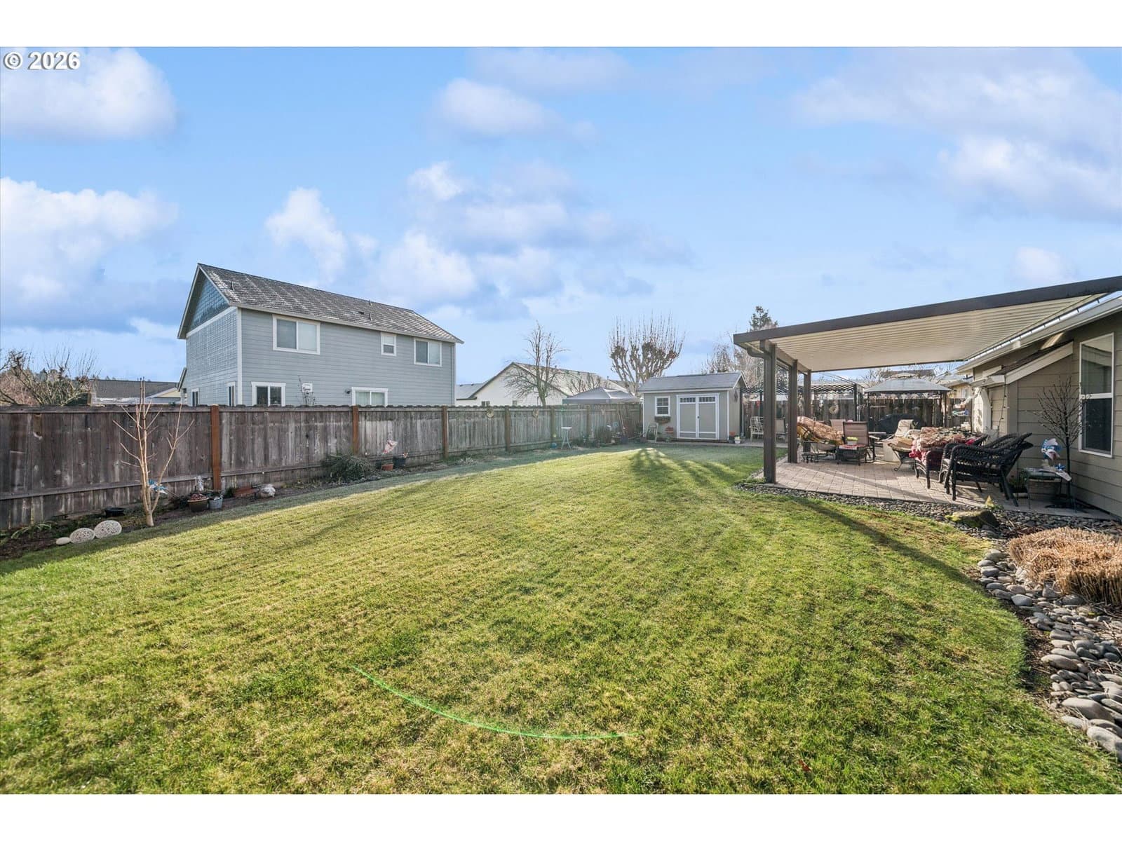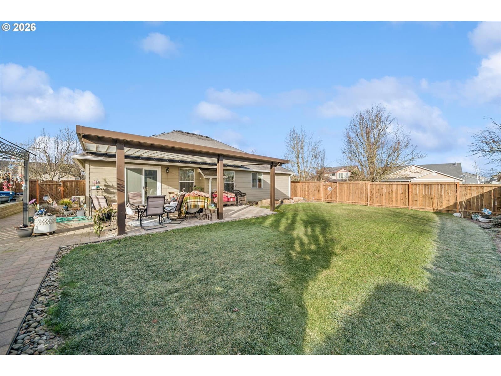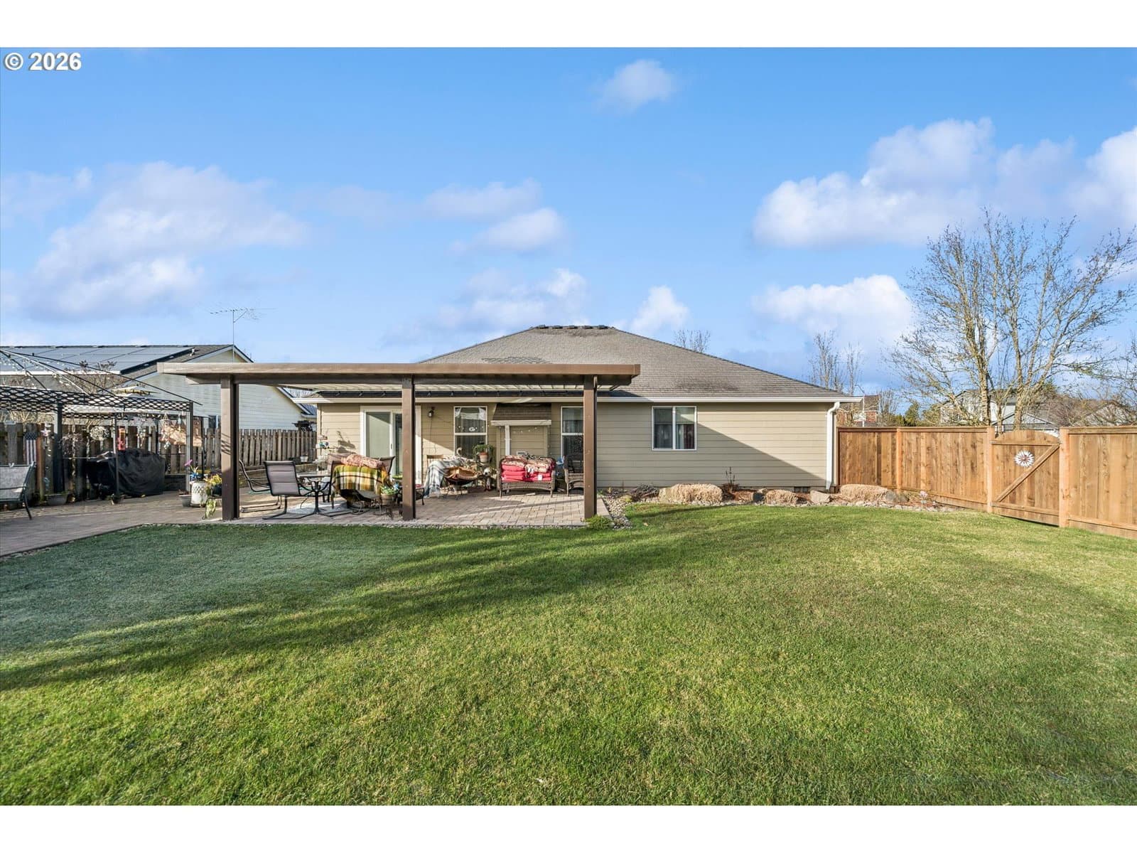 Nicely appointed home on large corner lot in Heritage Park Meadows. Great room floor plan, all stainless appliances in Kitchen are included. Updated bathroom by Jacuzzi of Portland. Engineered bamboo floors, oversized two car garage. Owned solar panels provide low electric bills year round. Covered patio, with pavers leading to garden shed, raised beds, BBQ area, and more. Stunning, landscaped, fenced back yard. This property has it all!