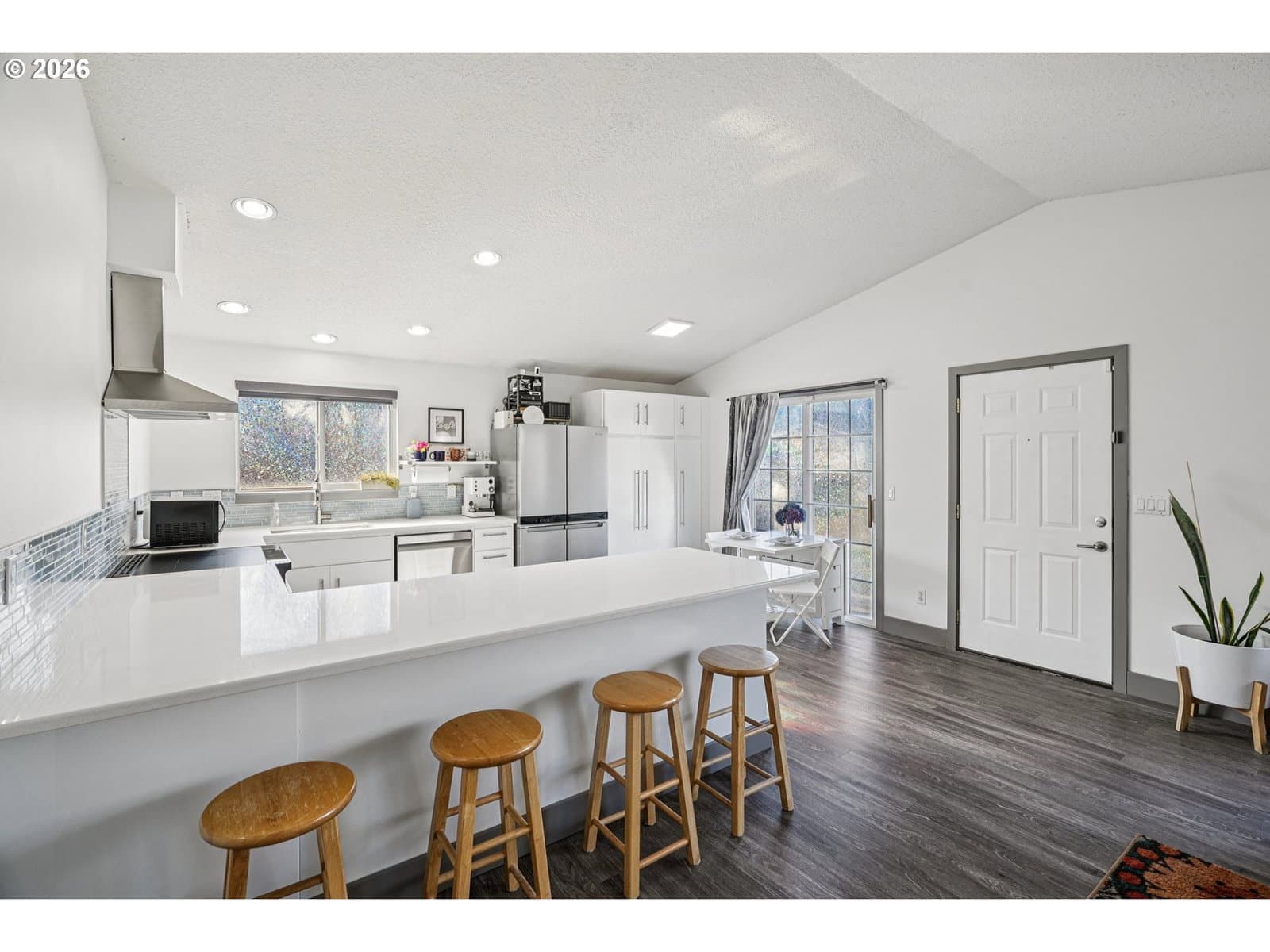 Updated one-level home on a quiet neighborhood street! Just one block to Glenwood Park and Kelly Elementary. Gorgeous remodeled kitchen feels light and bright with quartz counters and opens onto the spacious living room. Primary bedroom with en suite bath featuring walk-in shower. All new flooring throughout the whole home. New metal roof, new paint and trim, crawlspace work performed sealing and waterproofing it. Gated driveway with large parking area and excellent detached 2-car garage. Raised beds out front ready for your Spring plantings. This home is truly move-in ready, a must see! [Home Energy Score = 6. HES Report at https://rpt.greenbuildingregistry.com/hes/OR10110233]