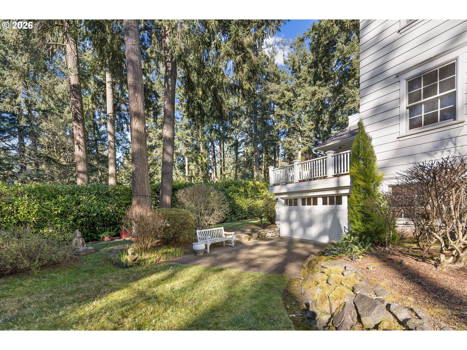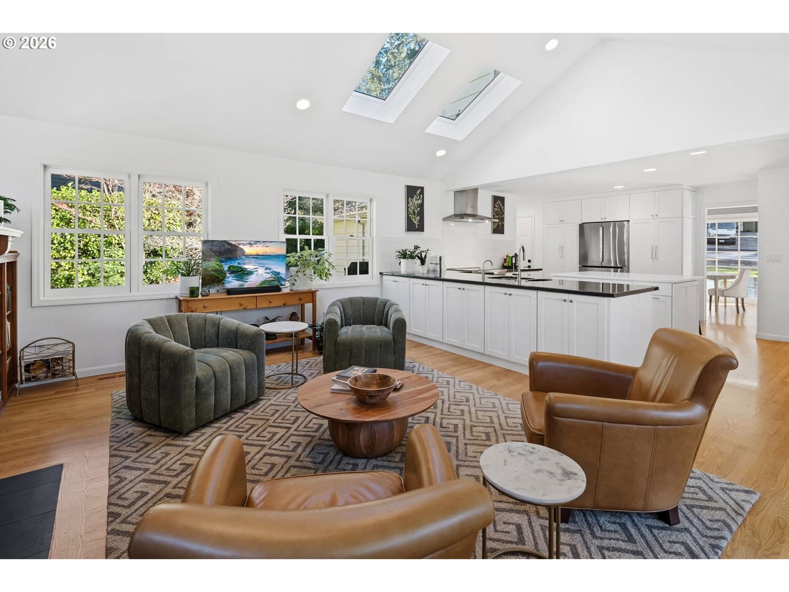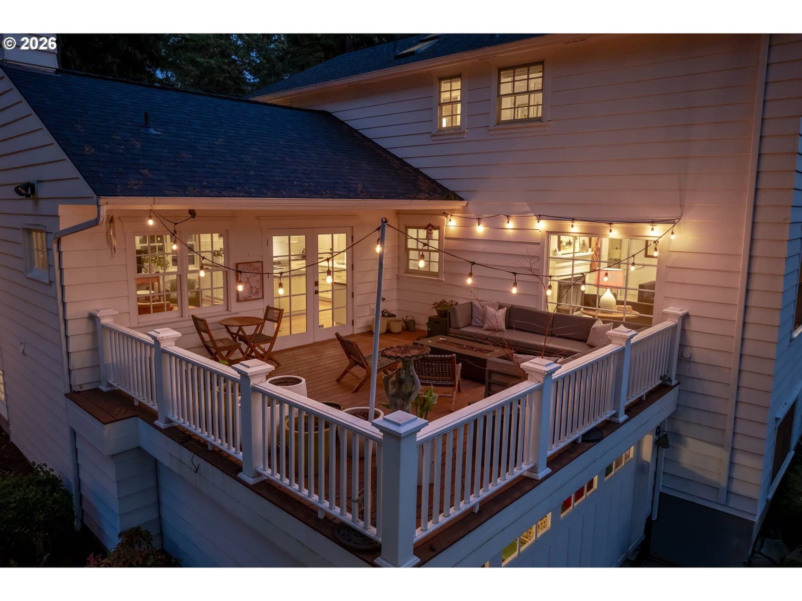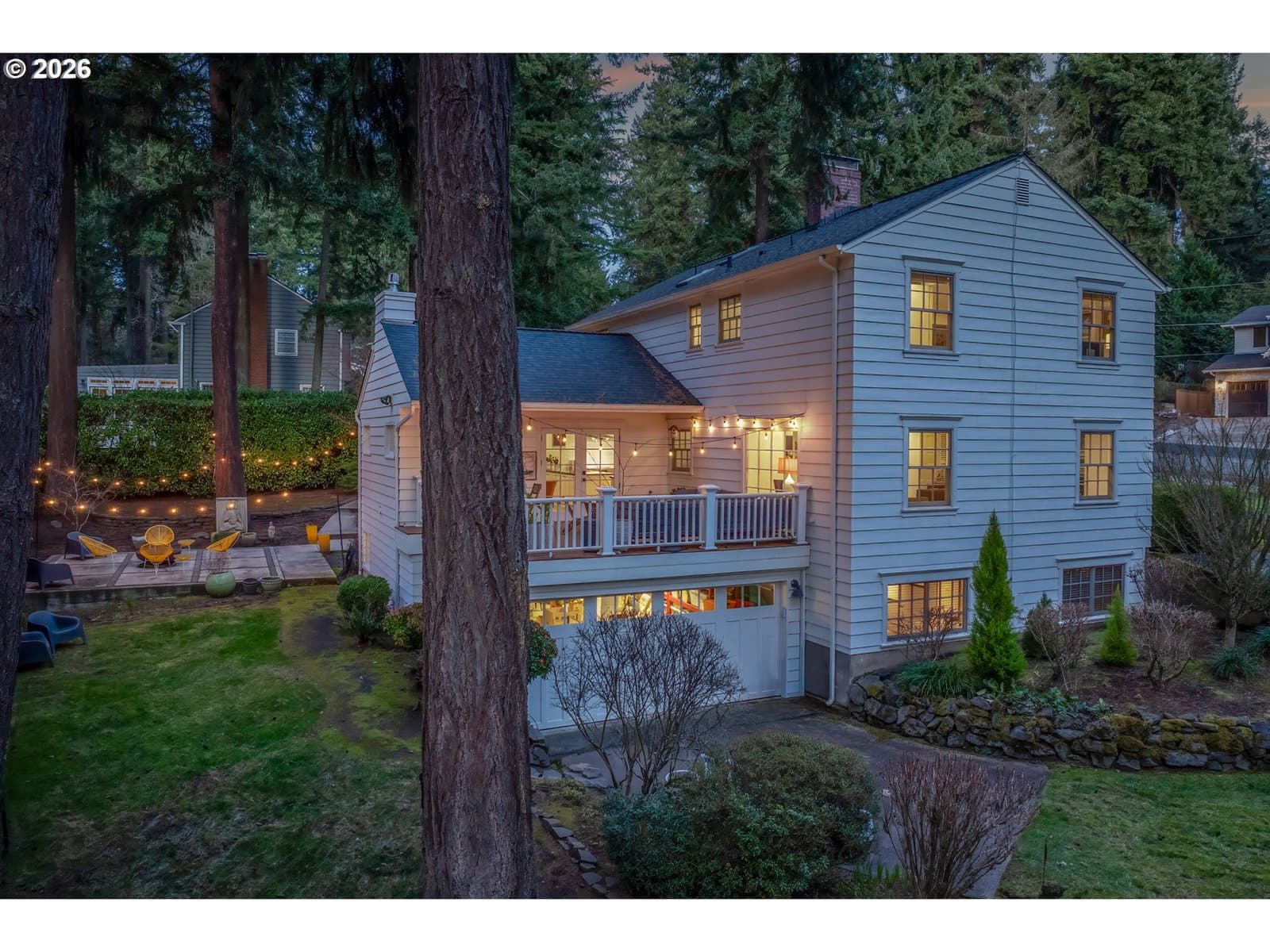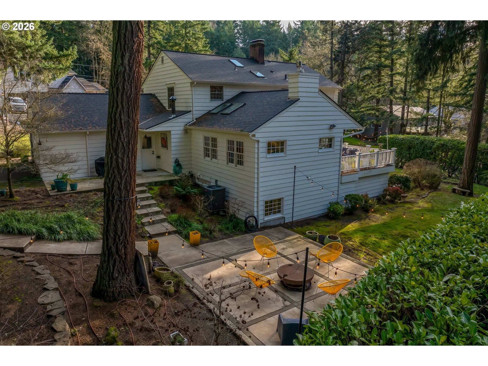 Nestled on a spacious lot in Lake Oswego's coveted Palisades neighborhood, this light-filled contemporary residence offers refined living within one of the state's most sought-after school districts. Thoughtful finishes, including oak floors, slate tile, and Carrara marble, are paired with oversized windows that bathe the interior in natural light. In the main living area, cathedral ceilings and multiple skylights create an airy, sun-drenched atmosphere, where a gas fireplace with a wood mantel is flanked by custom built-ins. French doors open to a generous back deck with a fire pit, allowing for seamless indoor/outdoor dining and entertaining. The kitchen pairs classic subway tile with granite countertops and high-end Bosch appliances. A white quartz island with bar seating invites casual gatherings, while a dedicated beverage station with prep sink caters to effortless hosting. An adjacent dining room with wainscoting features a south-facing floor-to-ceiling window that captures morning light. Additional spaces include a powder room and an elegant sitting room with a wood-burning fireplace and expansive windows. The home's versatile lower level offers a family room with a fireplace, laundry/mud room, a bonus/office space, a complete guest suite with a bedroom and full bath - and a tandem 4 car garage/artist studio. Upstairs, the spacious primary suite features top-down bottom-up shades that balance privacy and light, a walk-in closet, and a luxurious bath with mosaic tile flooring, double Carrara marble vanity, and marble tiled shower with dual showerheads. Two additional bedrooms, a full bath, and ample storage space complete the upper level. Outside, an expansive tiered patio creates multiple gathering areas surrounded by tall privacy hedges and mature trees. Ambient lighting and a built-in fire pit make the space ideal for year-round entertaining. Ideally located just 10 minutes from downtown Lake Oswego and 25 minutes from downtown Portland.