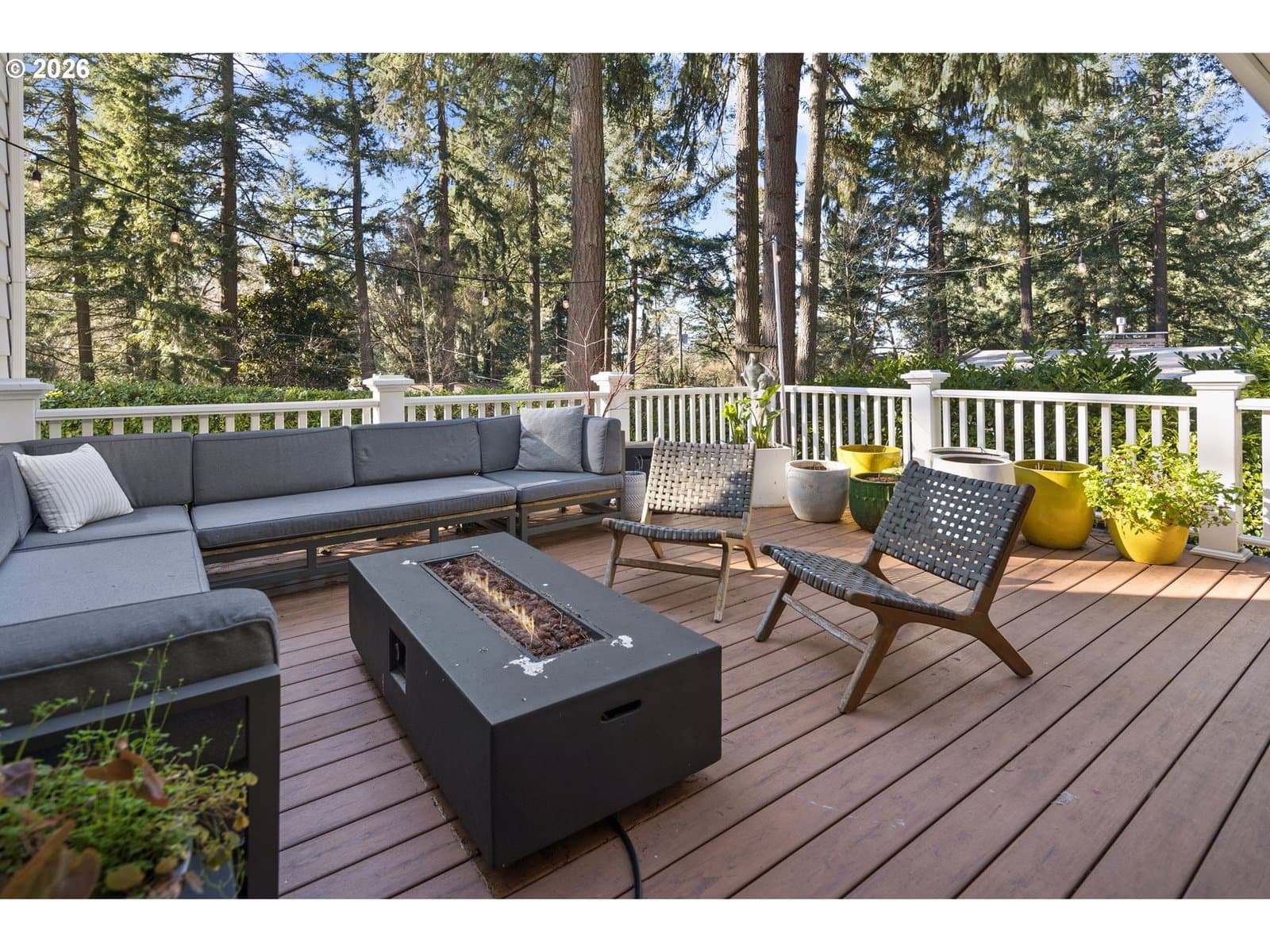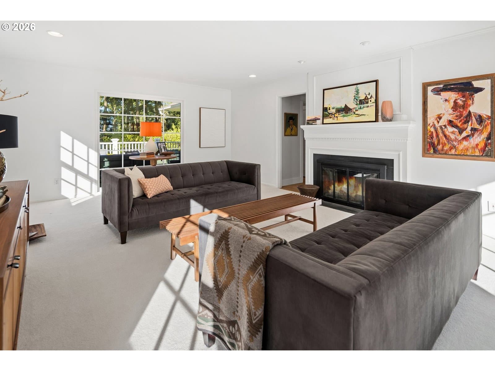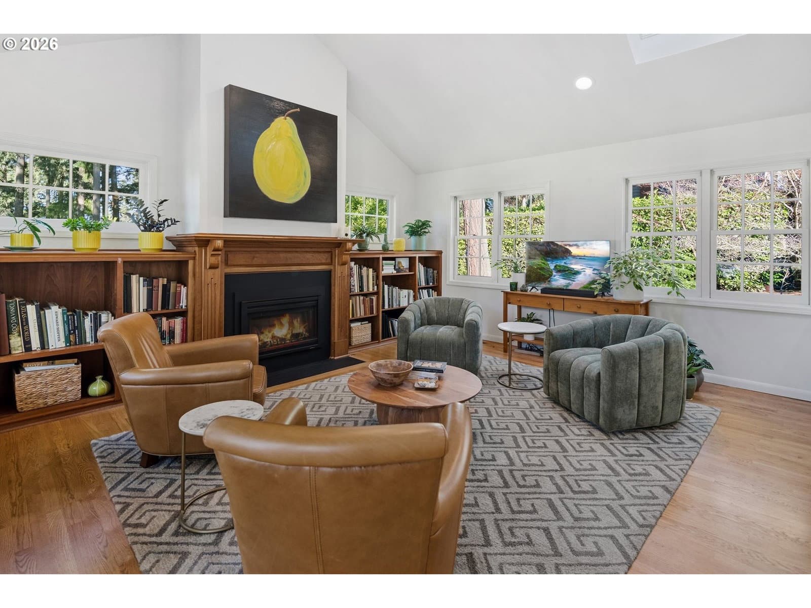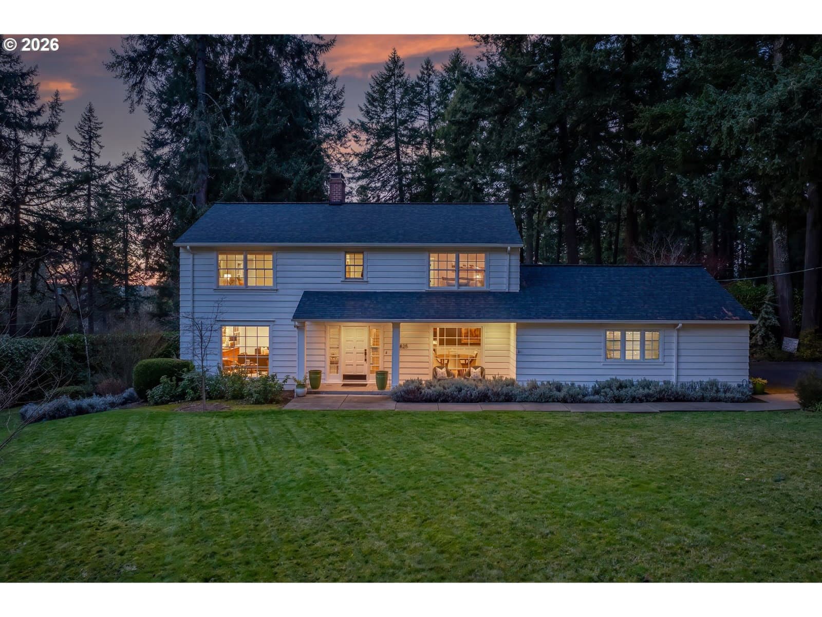 Nestled on a spacious lot in Lake Oswego's coveted Palisades neighborhood, this light-filled contemporary residence offers refined living within one of the state's most sought-after school districts. Thoughtful finishes, including oak floors, slate tile, and Carrara marble, are paired with oversized windows that bathe the interior in natural light. In the main living area, cathedral ceilings and multiple skylights create an airy, sun-drenched atmosphere, where a gas fireplace with a wood mantel is flanked by custom built-ins. French doors open to a generous back deck with a fire pit, allowing for seamless indoor/outdoor dining and entertaining. The kitchen pairs classic subway tile with granite countertops and high-end Bosch appliances. A white quartz island with bar seating invites casual gatherings, while a dedicated beverage station with prep sink caters to effortless hosting. An adjacent dining room with wainscoting features a south-facing floor-to-ceiling window that captures morning light. Additional spaces include a powder room and an elegant sitting room with a wood-burning fireplace and expansive windows. The home's versatile lower level offers a family room with a fireplace, laundry/mud room, a bonus/office space, a complete guest suite with a bedroom and full bath - and a tandem 4 car garage/artist studio. Upstairs, the spacious primary suite features top-down bottom-up shades that balance privacy and light, a walk-in closet, and a luxurious bath with mosaic tile flooring, double Carrara marble vanity, and marble tiled shower with dual showerheads. Two additional bedrooms, a full bath, and ample storage space complete the upper level. Outside, an expansive tiered patio creates multiple gathering areas surrounded by tall privacy hedges and mature trees. Ambient lighting and a built-in fire pit make the space ideal for year-round entertaining. Ideally located just 10 minutes from downtown Lake Oswego and 25 minutes from downtown Portland.