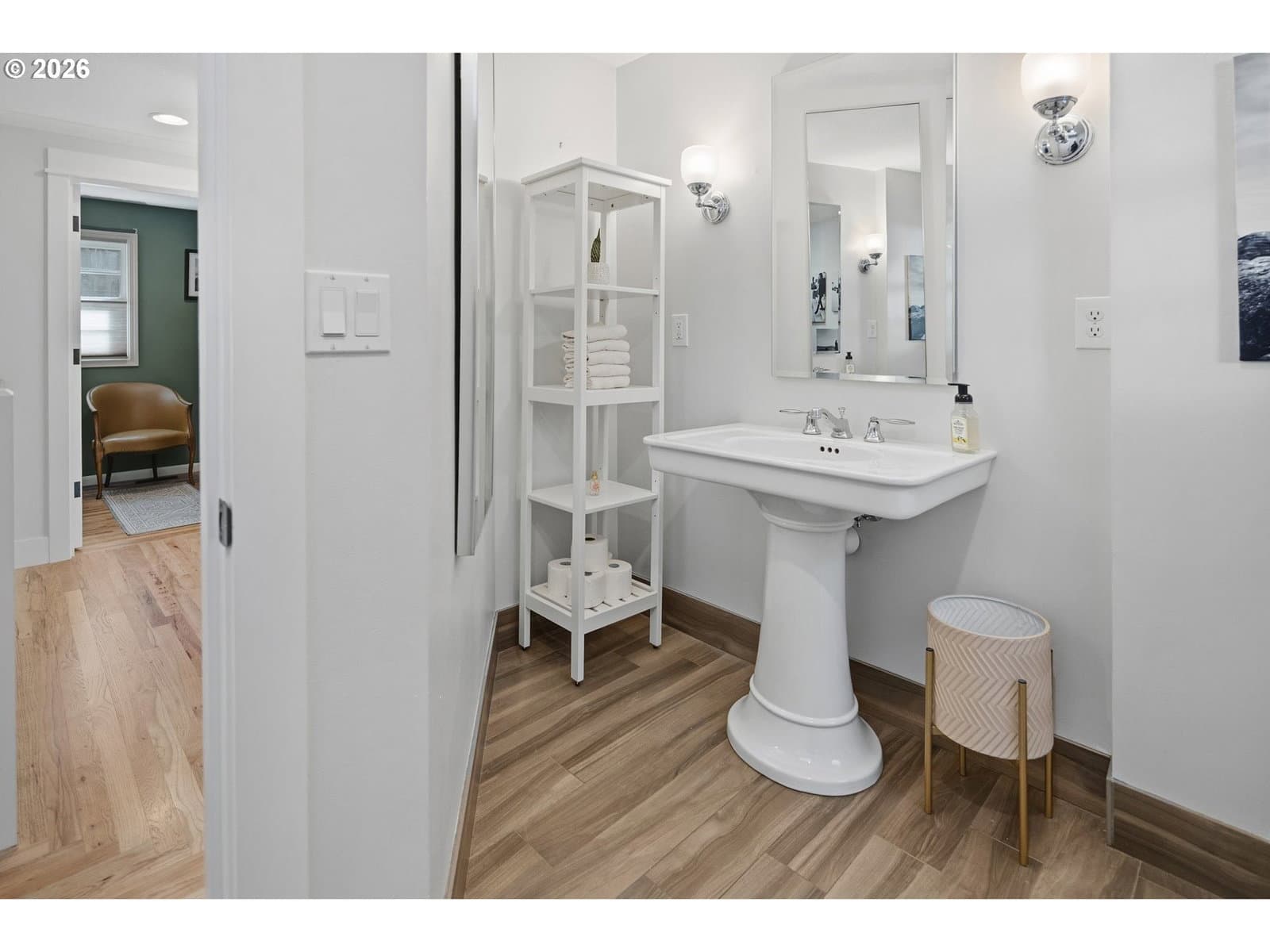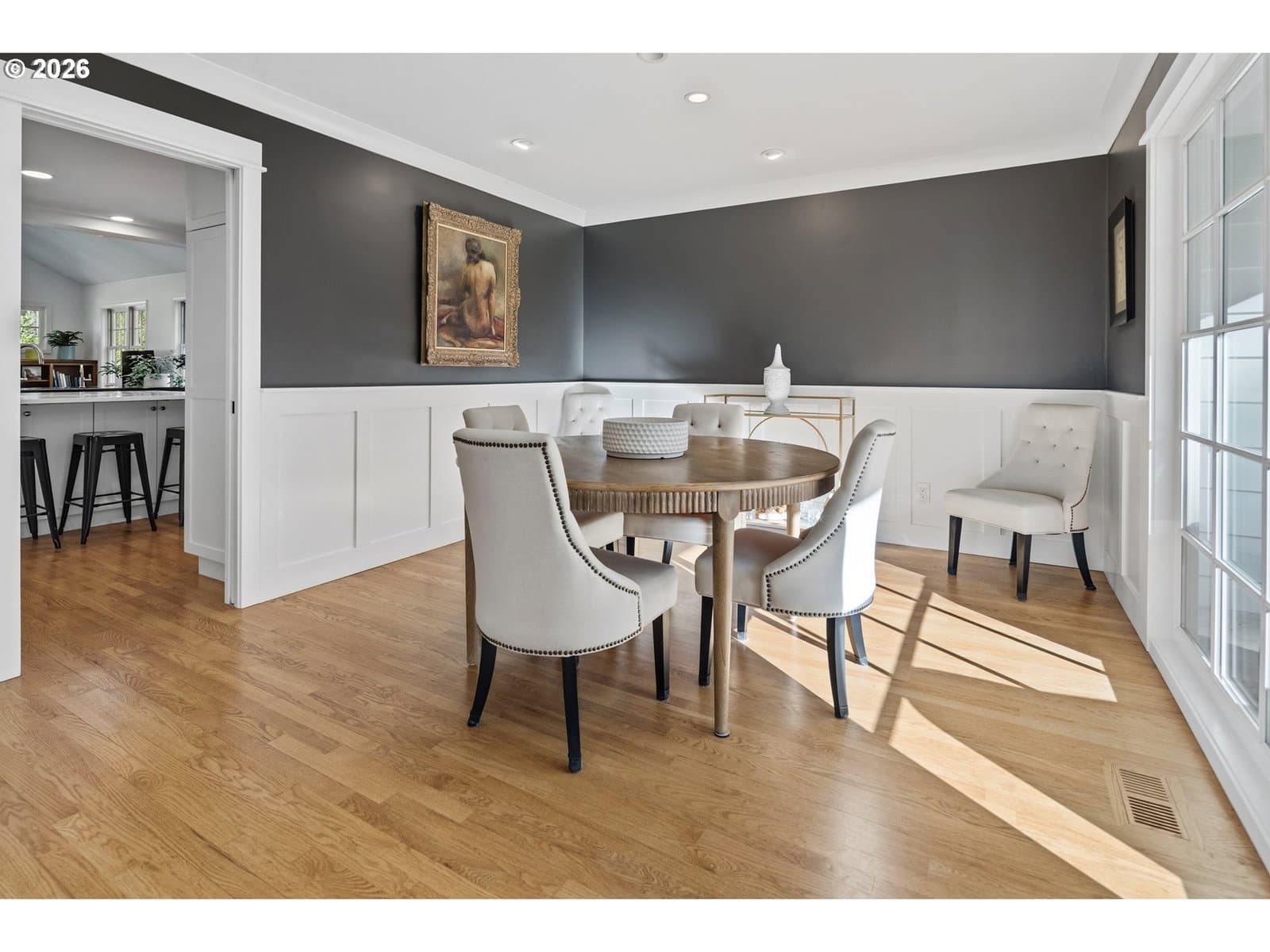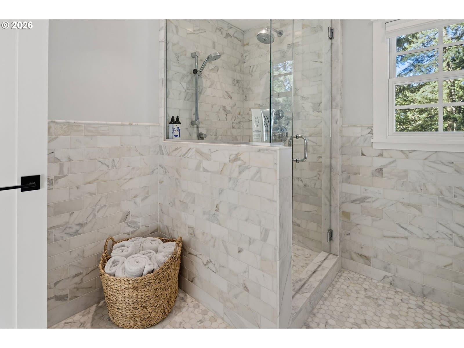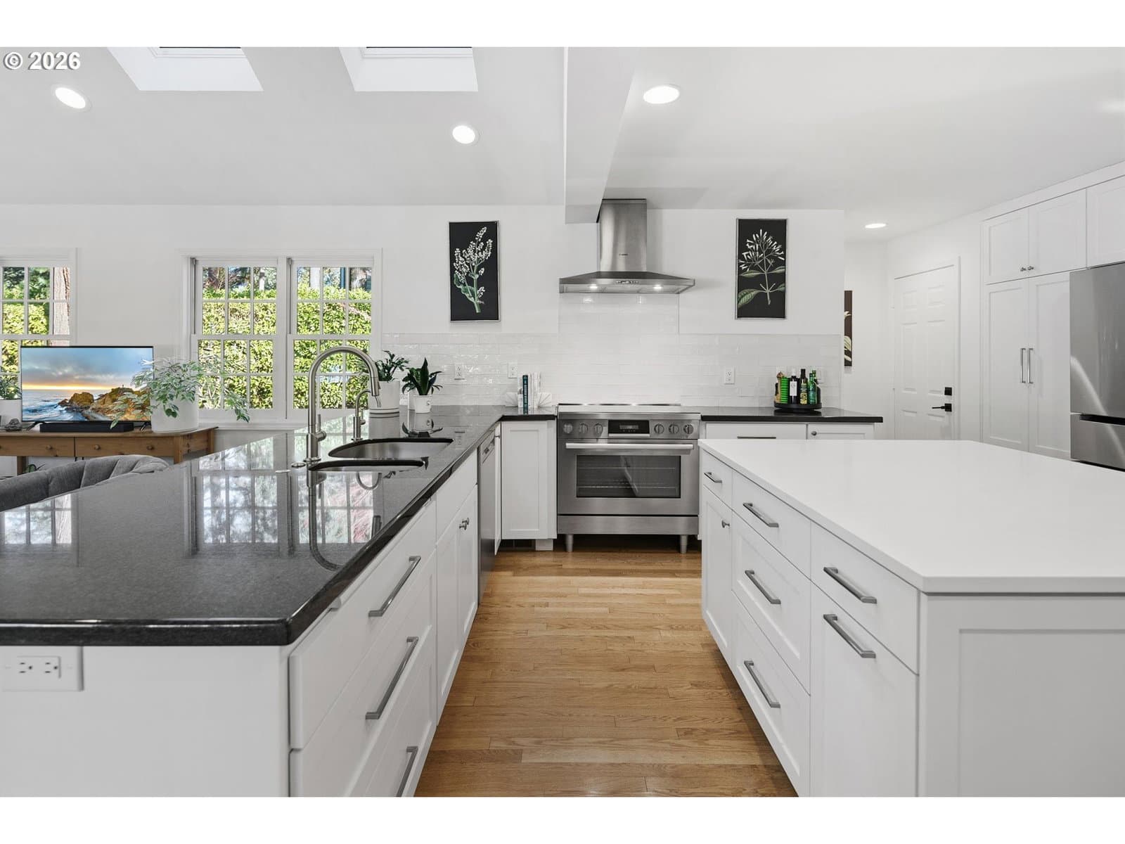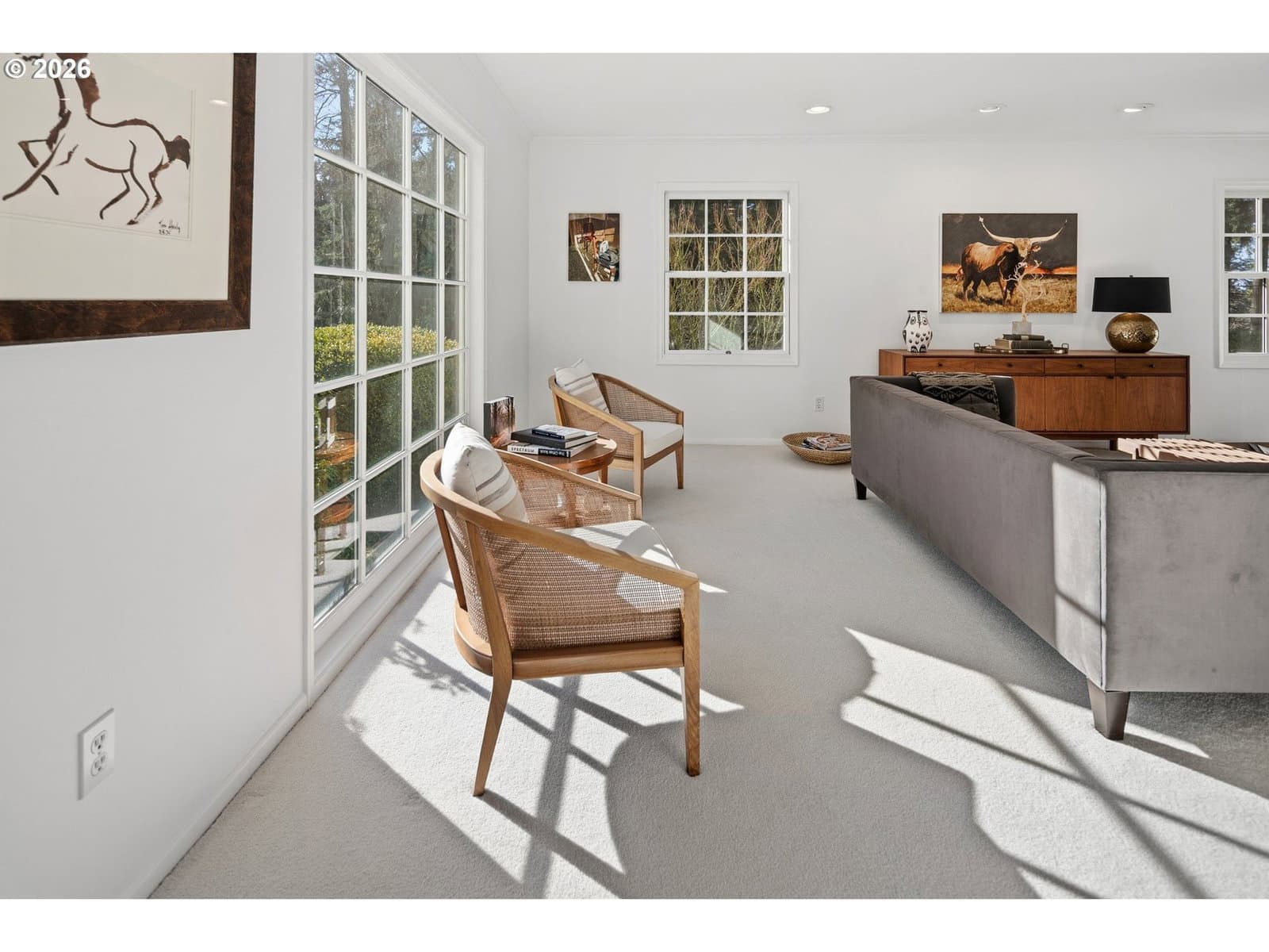 Nestled on a spacious lot in Lake Oswego's coveted Palisades neighborhood, this light-filled contemporary residence offers refined living within one of the state's most sought-after school districts. Thoughtful finishes, including oak floors, slate tile, and Carrara marble, are paired with oversized windows that bathe the interior in natural light. In the main living area, cathedral ceilings and multiple skylights create an airy, sun-drenched atmosphere, where a gas fireplace with a wood mantel is flanked by custom built-ins. French doors open to a generous back deck with a fire pit, allowing for seamless indoor/outdoor dining and entertaining. The kitchen pairs classic subway tile with granite countertops and high-end Bosch appliances. A white quartz island with bar seating invites casual gatherings, while a dedicated beverage station with prep sink caters to effortless hosting. An adjacent dining room with wainscoting features a south-facing floor-to-ceiling window that captures morning light. Additional spaces include a powder room and an elegant sitting room with a wood-burning fireplace and expansive windows. The home's versatile lower level offers a family room with a fireplace, laundry/mud room, a bonus/office space, a complete guest suite with a bedroom and full bath - and a tandem 4 car garage/artist studio. Upstairs, the spacious primary suite features top-down bottom-up shades that balance privacy and light, a walk-in closet, and a luxurious bath with mosaic tile flooring, double Carrara marble vanity, and marble tiled shower with dual showerheads. Two additional bedrooms, a full bath, and ample storage space complete the upper level. Outside, an expansive tiered patio creates multiple gathering areas surrounded by tall privacy hedges and mature trees. Ambient lighting and a built-in fire pit make the space ideal for year-round entertaining. Ideally located just 10 minutes from downtown Lake Oswego and 25 minutes from downtown Portland.