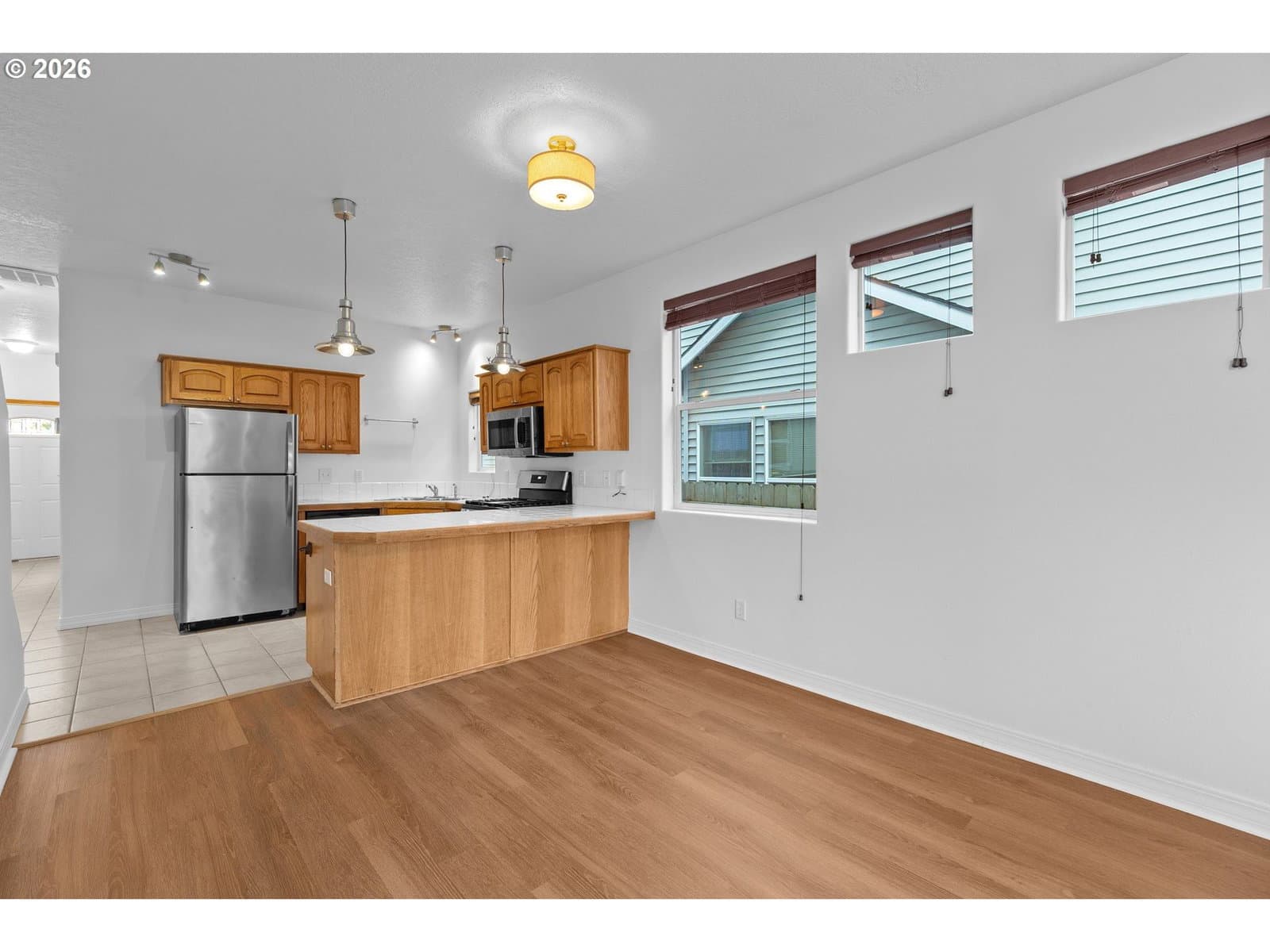 Adorable Kenton home freshly updated and move-in ready. The main level offers a classic, open floor plan with brand-new interior paint, new laminate flooring, and great natural light throughout. The kitchen features counter seating, a new gas range, direct-vent microwave, and a new sink with garbage disposal; perfect for everyday cooking or casual entertaining. Upstairs, newly installed carpet leads to two comfortable bedrooms, a full bathroom with a skylight, and a spacious primary bedroom with vaulted ceilings, generous closet space, and its own en-suite bath. The one-car garage includes high ceilings for extra storage plus a dedicated laundry area. Located just two blocks from Trenton Park and under a mile to Kenton’s vibrant main street with restaurants, cafés, and shopping, this home offers convenience, comfort, and a fantastic neighborhood setting. See our virtual tour links for more information! [Home Energy Score = 6. HES Report at https://rpt.greenbuildingregistry.com/hes/OR10243722]