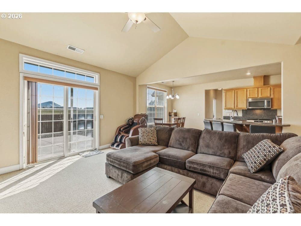 Beautifully maintained and completely move-in ready Craftsman in the desirable Klamath Meadows East neighborhood! This 4-bedroom, 2.5-bath home features an inviting open-concept floor plan perfect for everyday living and entertaining. The living room offers a cozy gas fireplace, vaulted ceilings, and sliding doors that lead to the backyard for seamless indoor-outdoor living.The kitchen is designed for gathering with a large island and eat bar, beautiful countertops and cabinetry, plus a bright eating area ideal for morning coffee or casual dining while enjoying views of the distant mountains and peaceful farmland. The primary suite features vaulted ceilings and a private bath with a relaxing jetted tub and dual vanities. Two additional bedrooms and a full bath on the main level provide comfortable space for family or guests. Upstairs, a 4th bedroom with a half bath is also perfect for a media room, home office, or playroom. Outside, enjoy a fully fenced yard with a spacious patio, a 2-car garage, and a concrete pad with room to park a large RV. Conveniently located just minutes from shopping, dining, schools, and neighborhood parks.