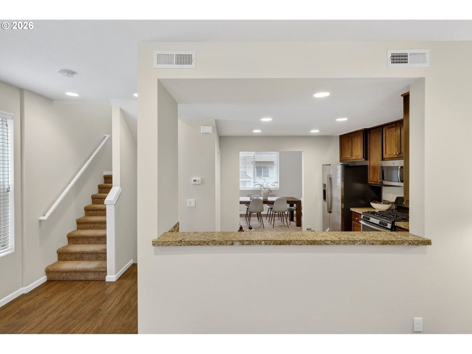 Exceptional Tanasbourne townhome with a welcoming covered front porch and 2 spacious primary suites, desirably located near Whole Foods, Tanasbourne shopping & dining, Nike, Intel, and magnificent Magnolia Park. The bright, airy great room features a cozy slate stone gas fireplace and engineered hardwood floors that extend throughout the main. Centerpiece kitchen has granite counters, tile backsplash, SS/gas appliances, and pantry. Entertain effortlessly in the light-filled formal dining room off the kitchen (could also be a fantastic home office). Upstairs, dual primary suites boast walk-in closets with built-in shelves, ensuite bathrooms with tile floors and tile vanities, and one suite with vaulted ceilings. Convenient laundry closet located in the hall. Lower level includes a full bedroom, half bath, and access to the finished 2-car tandem garage. Step outside to a fully fenced private patio with a planting area—perfect for relaxing or entertaining. HOA includes exterior maintenance and front yard landscaping (new exterior paint completed in July 2025). Off-street (3 locations) and on-street parking is available close by, along with wonderful amenities within walking distance. [Home Energy Score = 7. HES Report at https://rpt.greenbuildingregistry.com/hes/OR10244419] HOA covers exterior maintenance, snow removal, front yard landscaping.